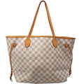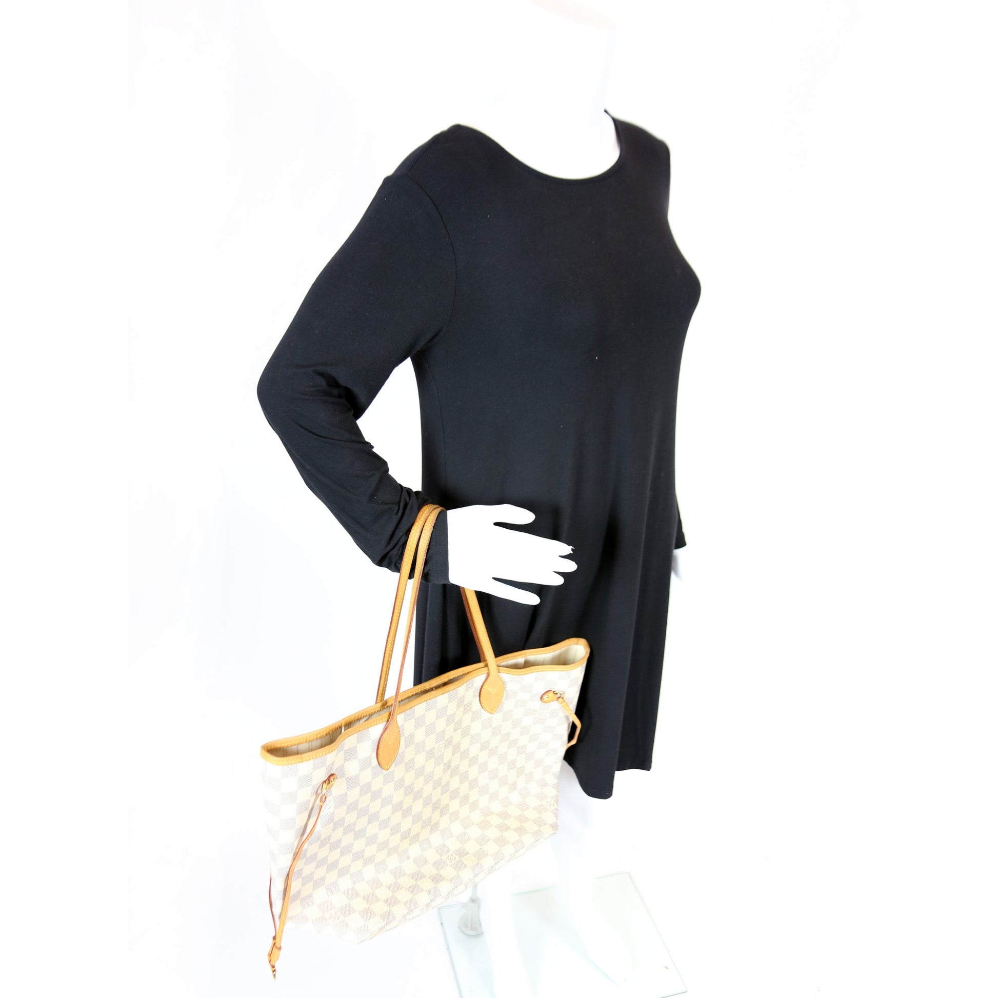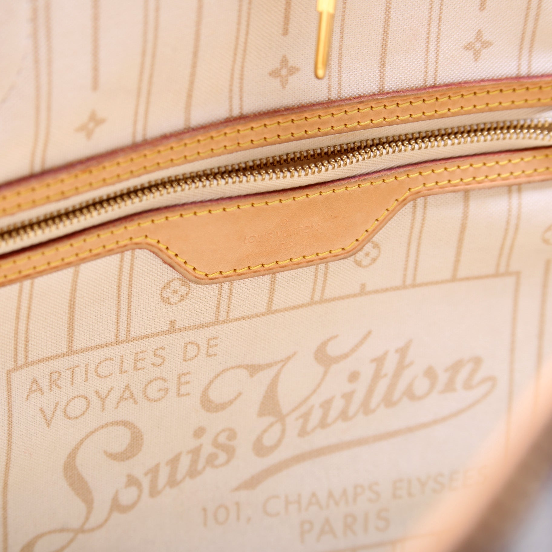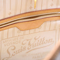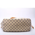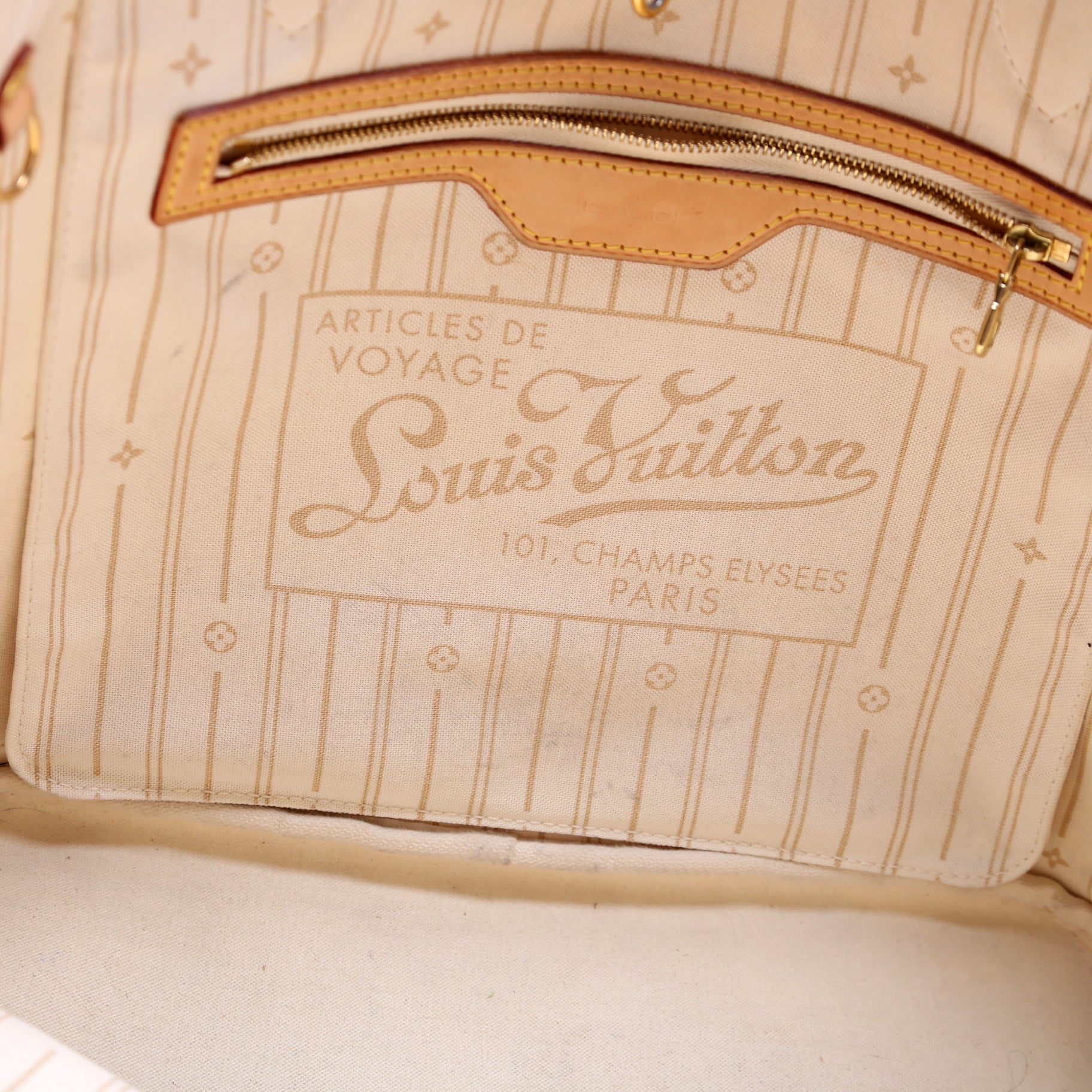 This Louis Vuitton Neverfull MMis eye catching bag. The exterior is in the classic Louis Vuitton Damier Azur coated canvas.