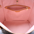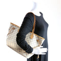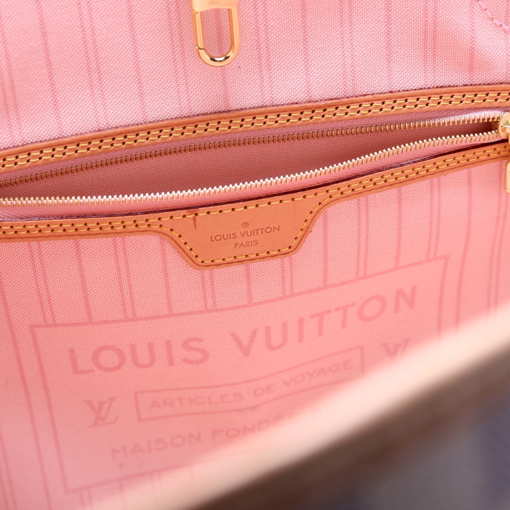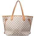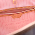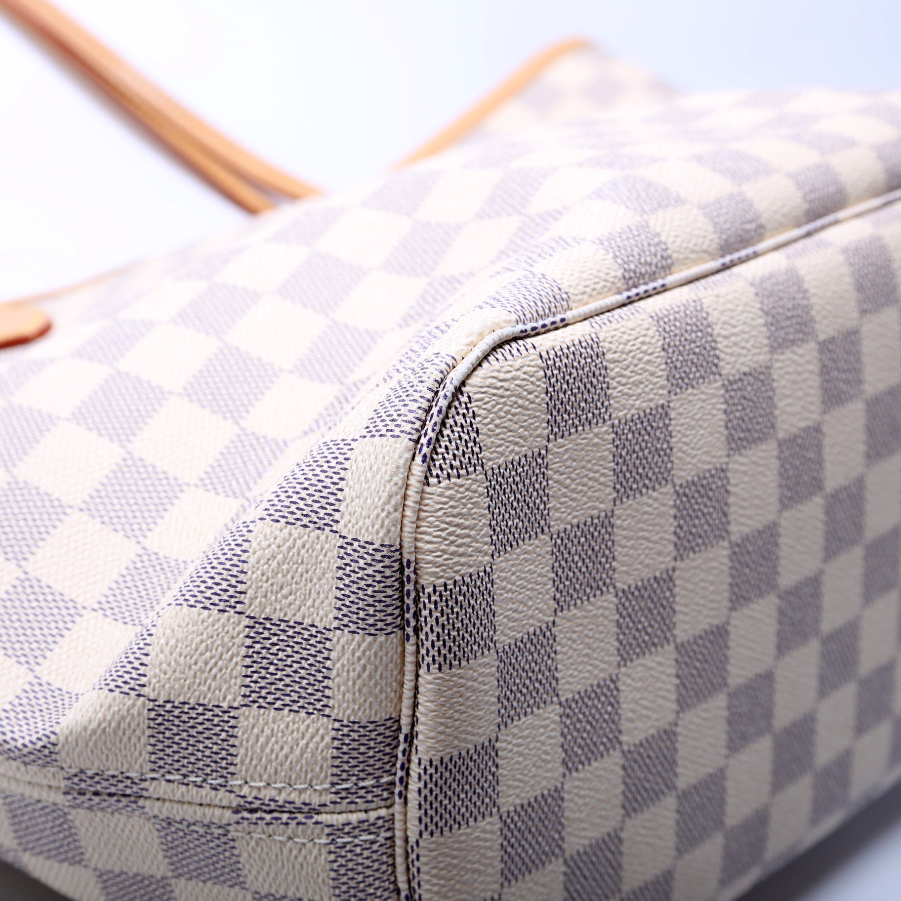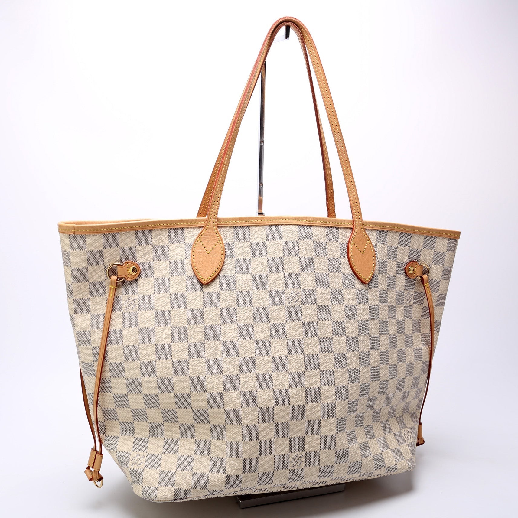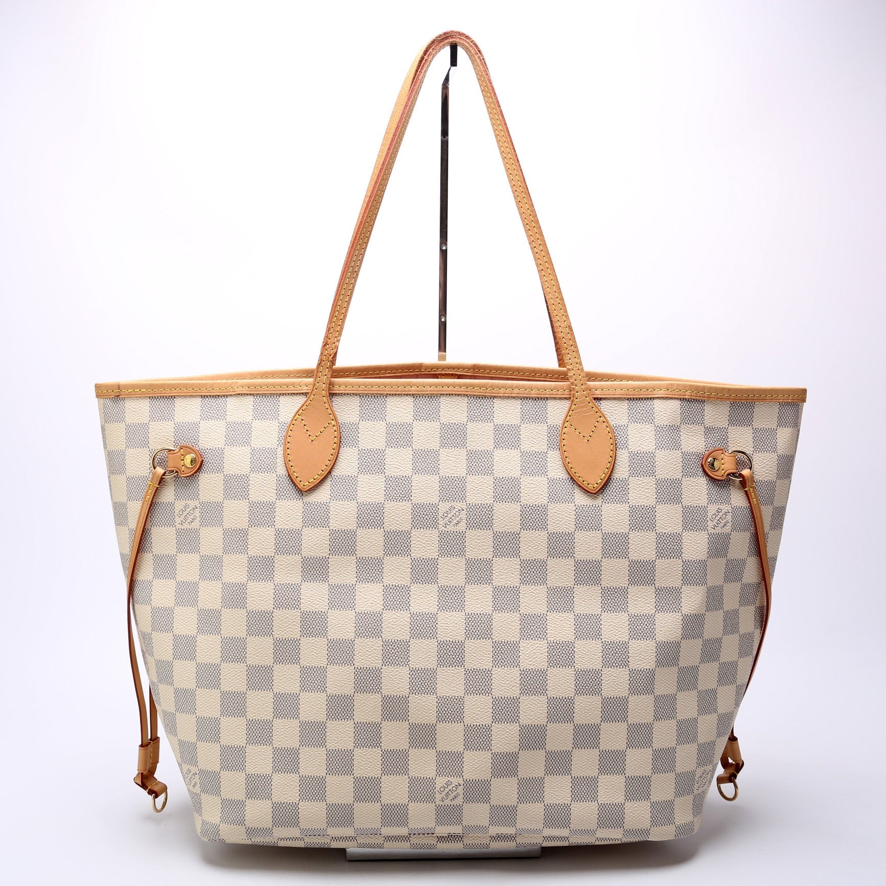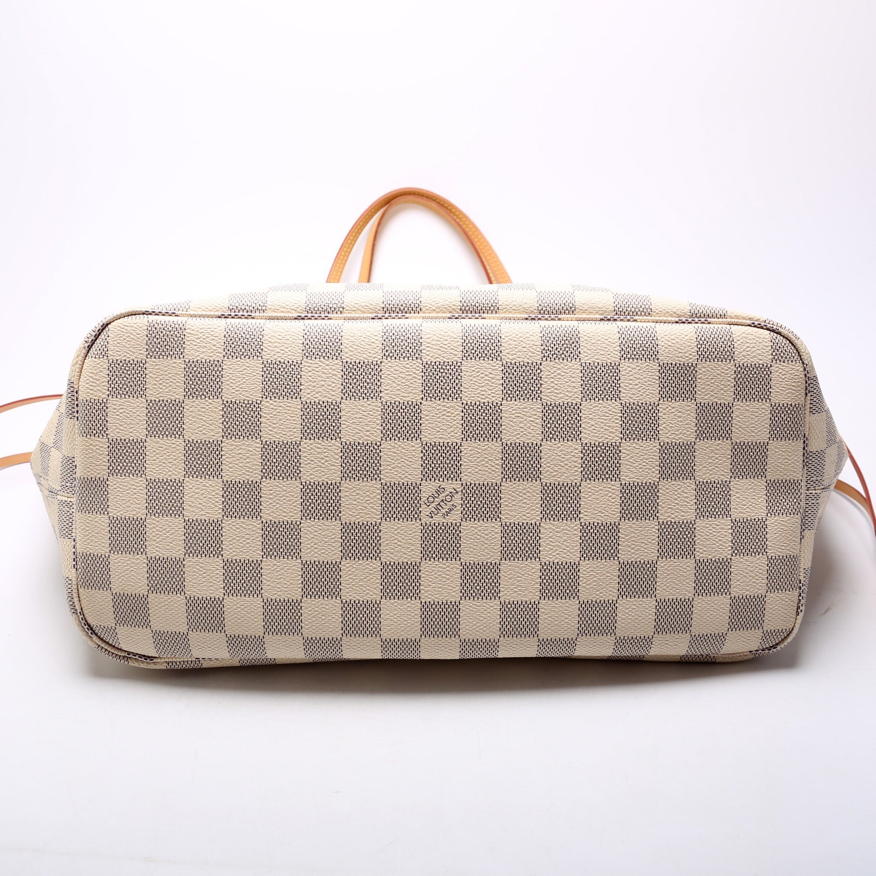 This Louis Vuitton Neverfull MMis eye catching bag. The exterior is in the classic Louis Vuitton Damier Azur coated canvas.
