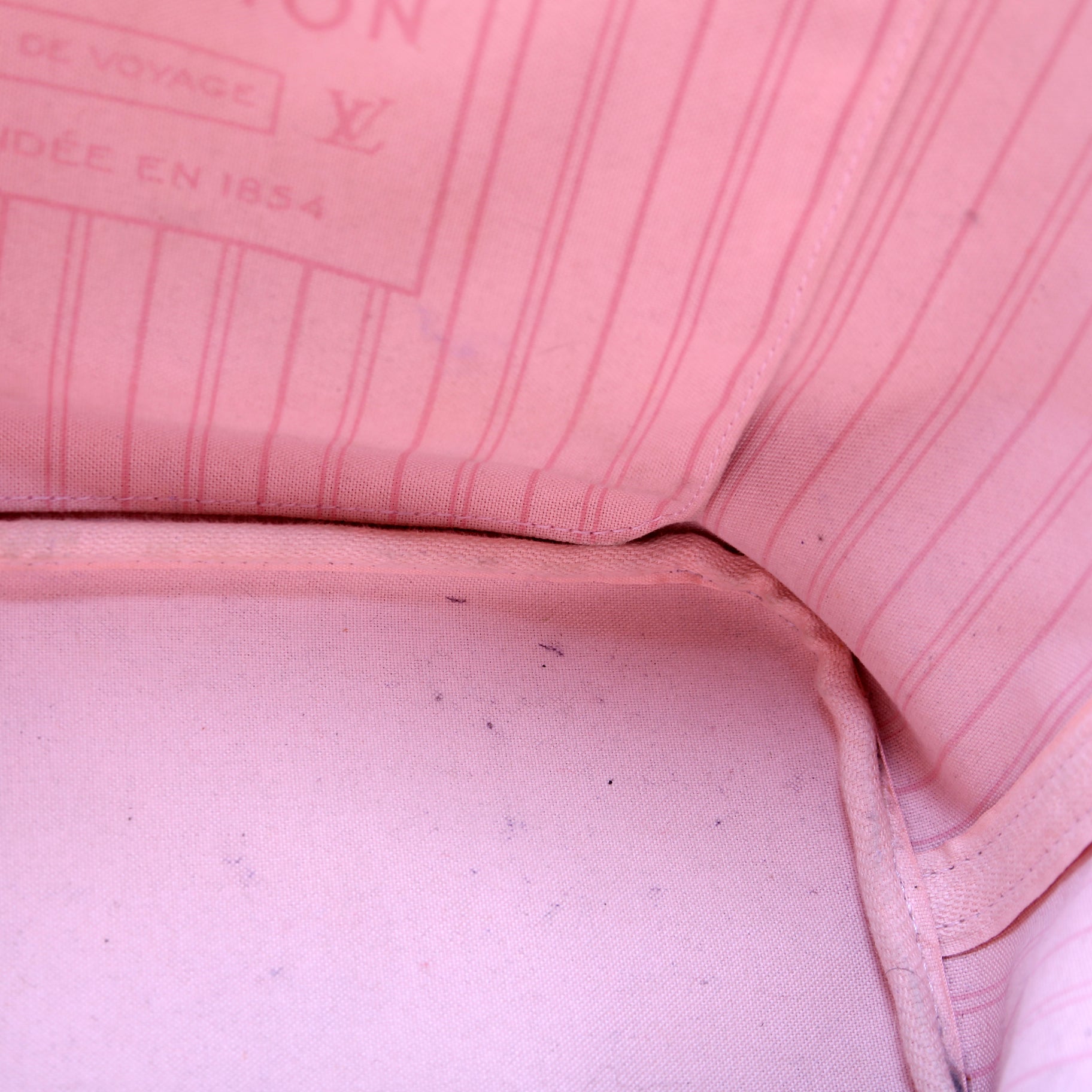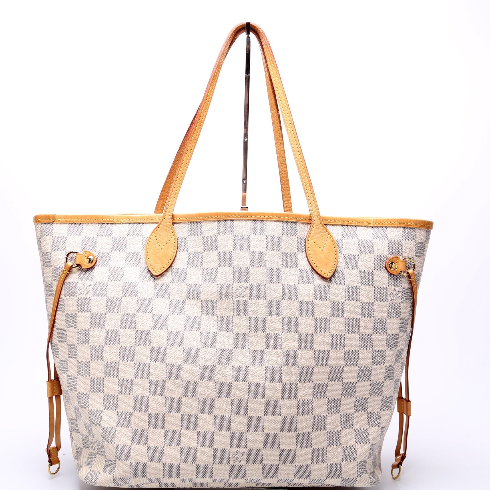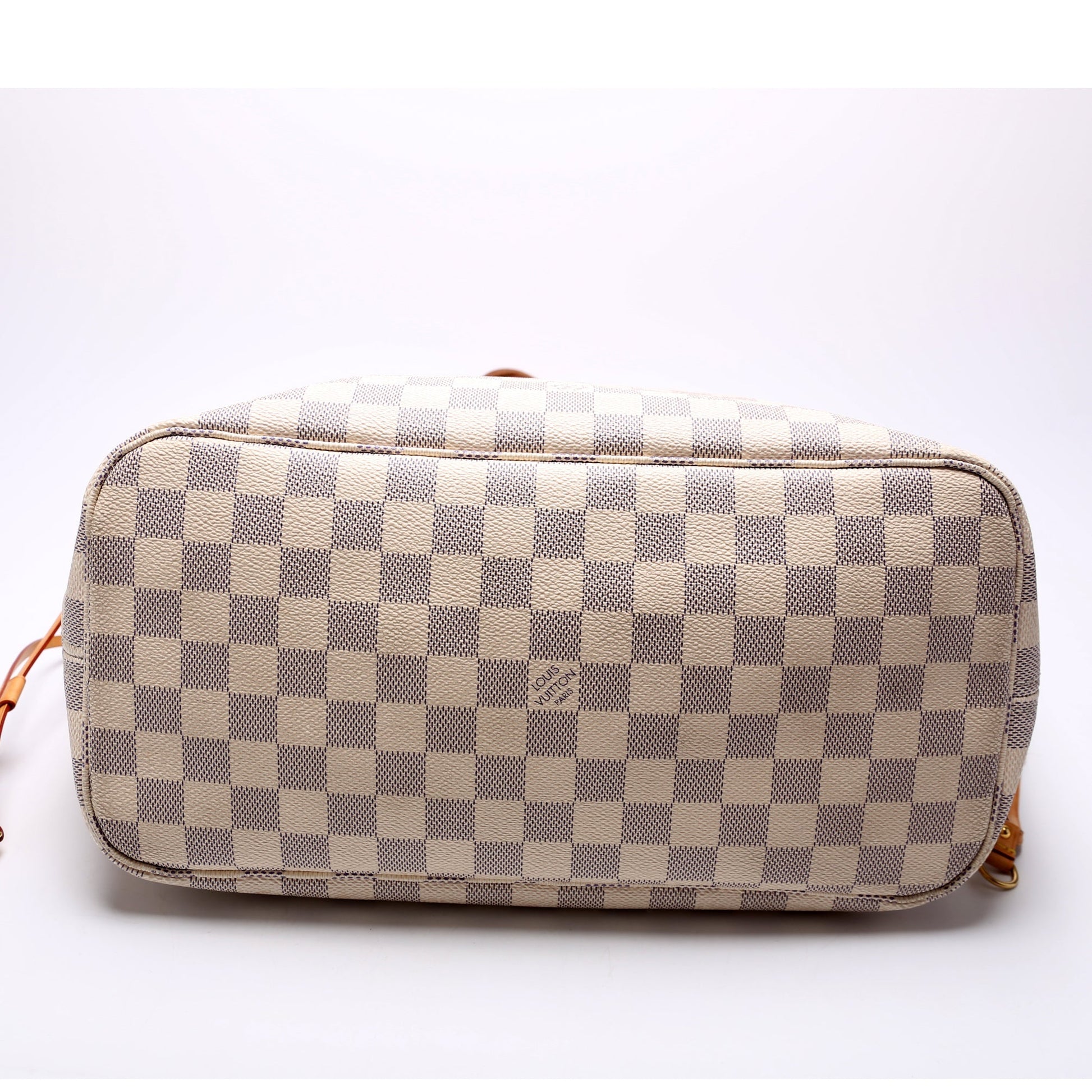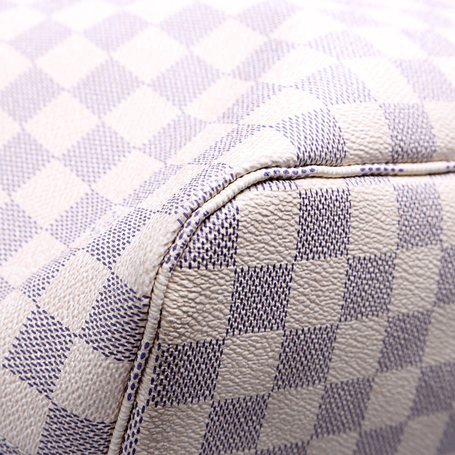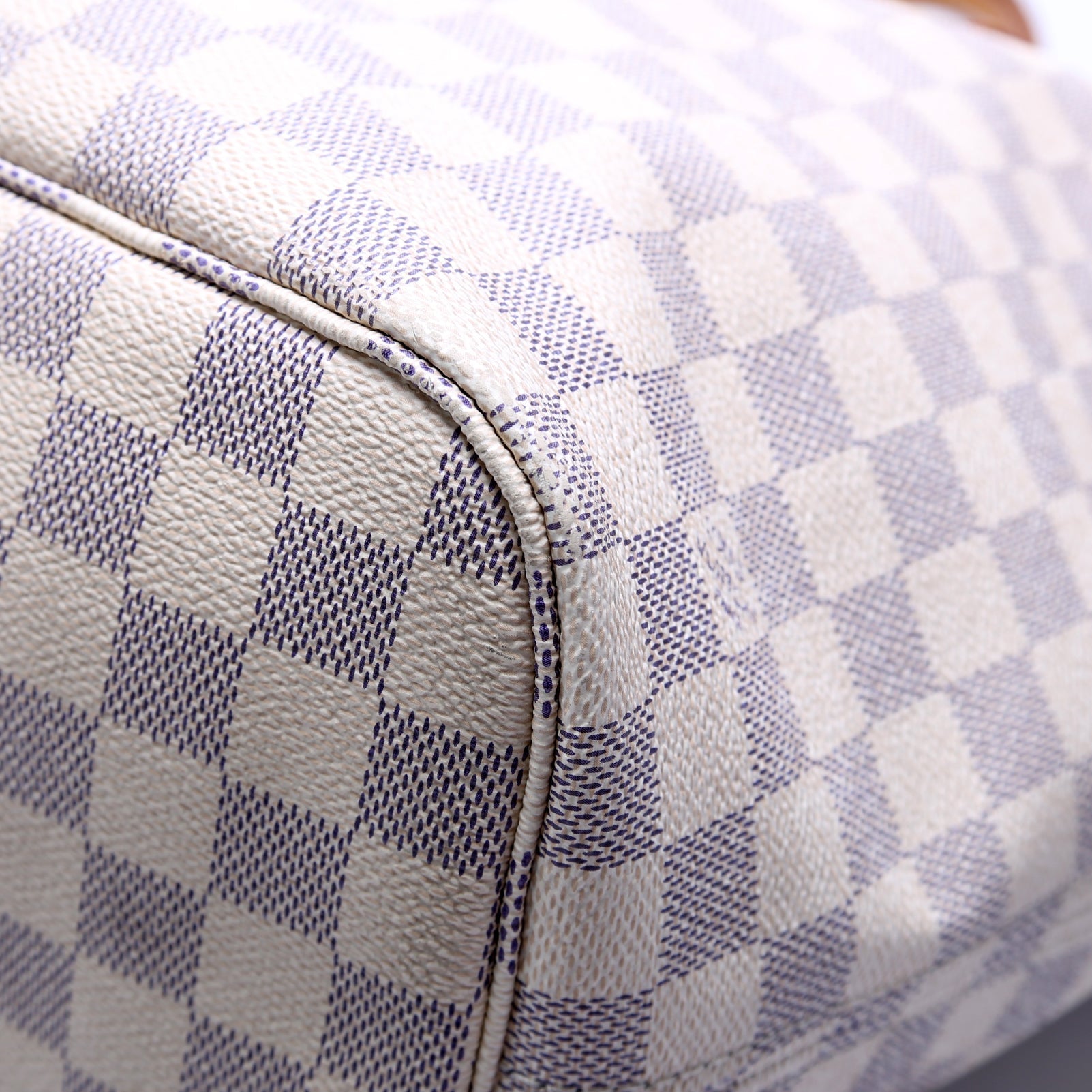 This Louis Vuitton Neverfull MMis eye catching bag. The exterior is in the classic Louis Vuitton Damier Azur coated canvas.