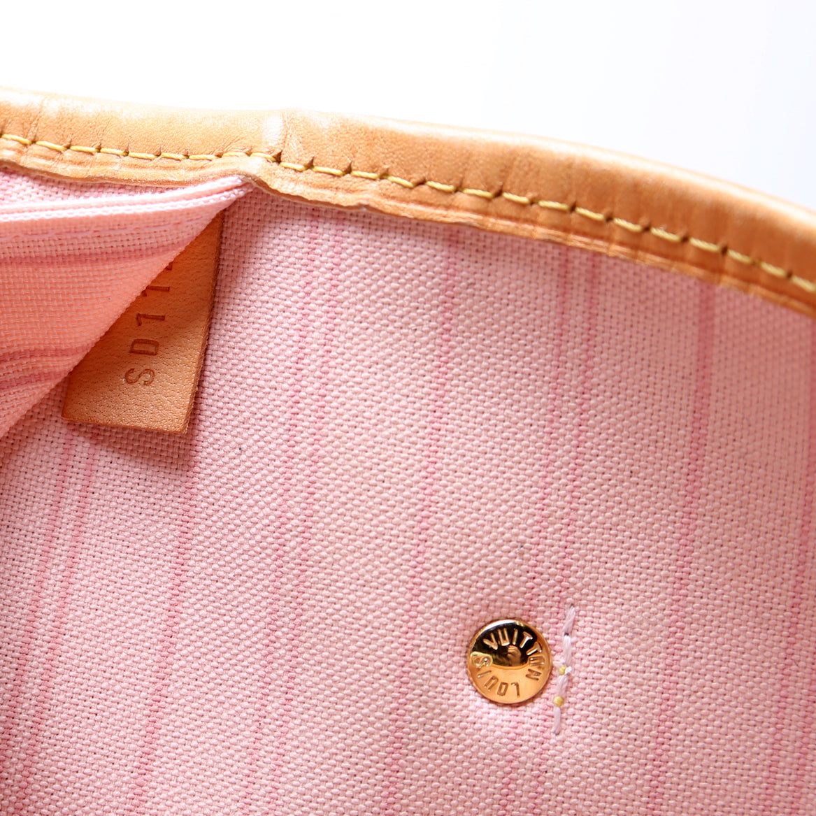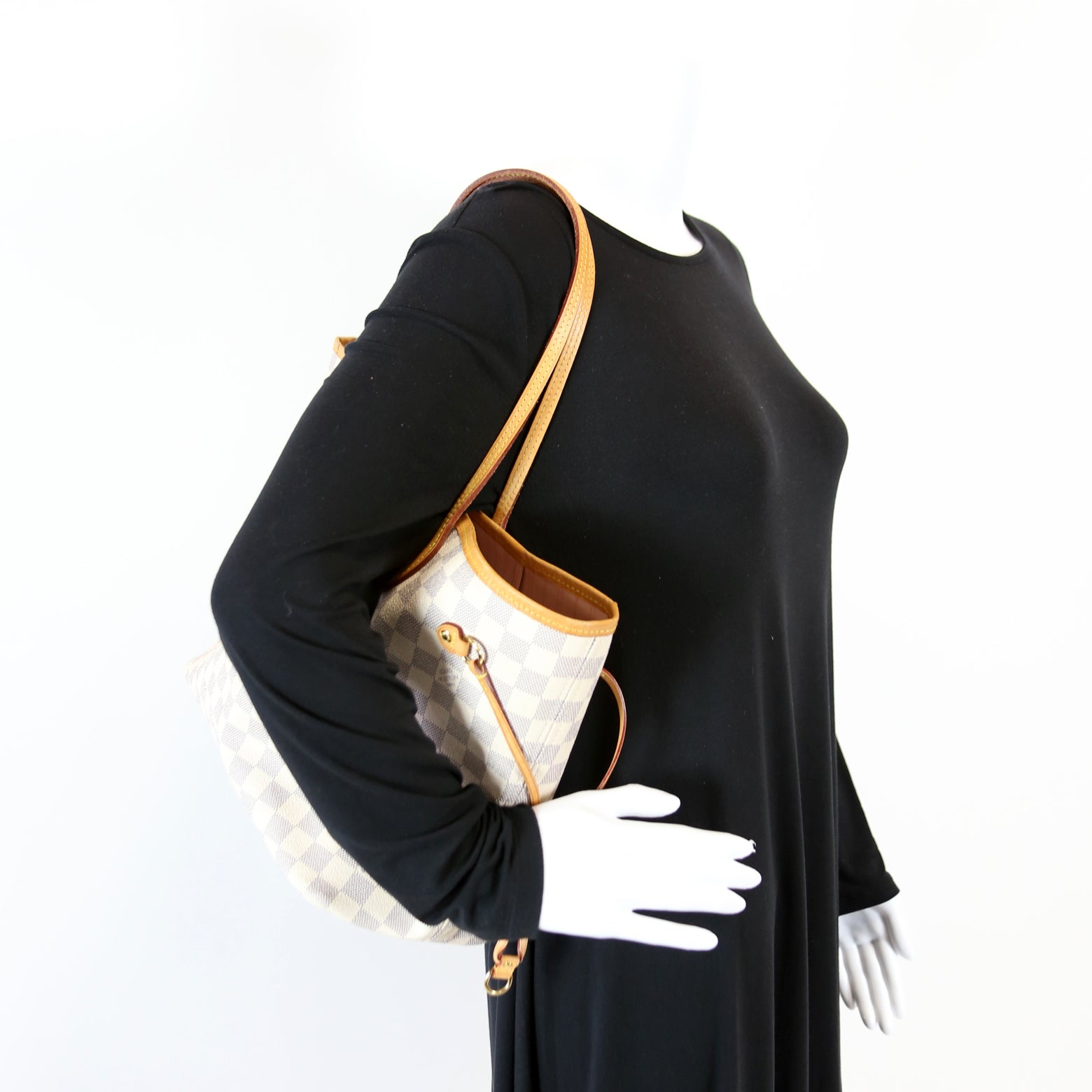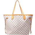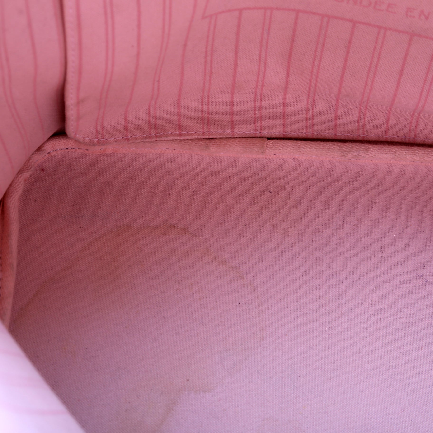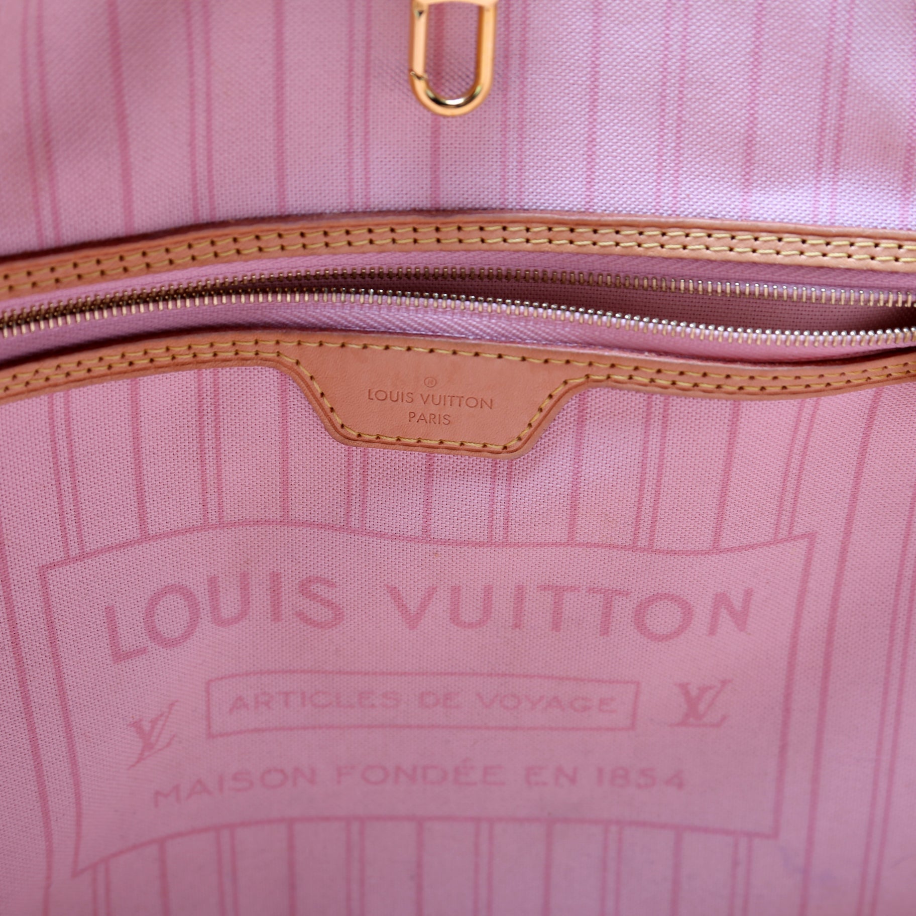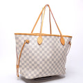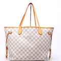 This Louis Vuitton Neverfull MMis eye catching bag. The exterior is in the classic Louis Vuitton Damier Azur coated canvas.