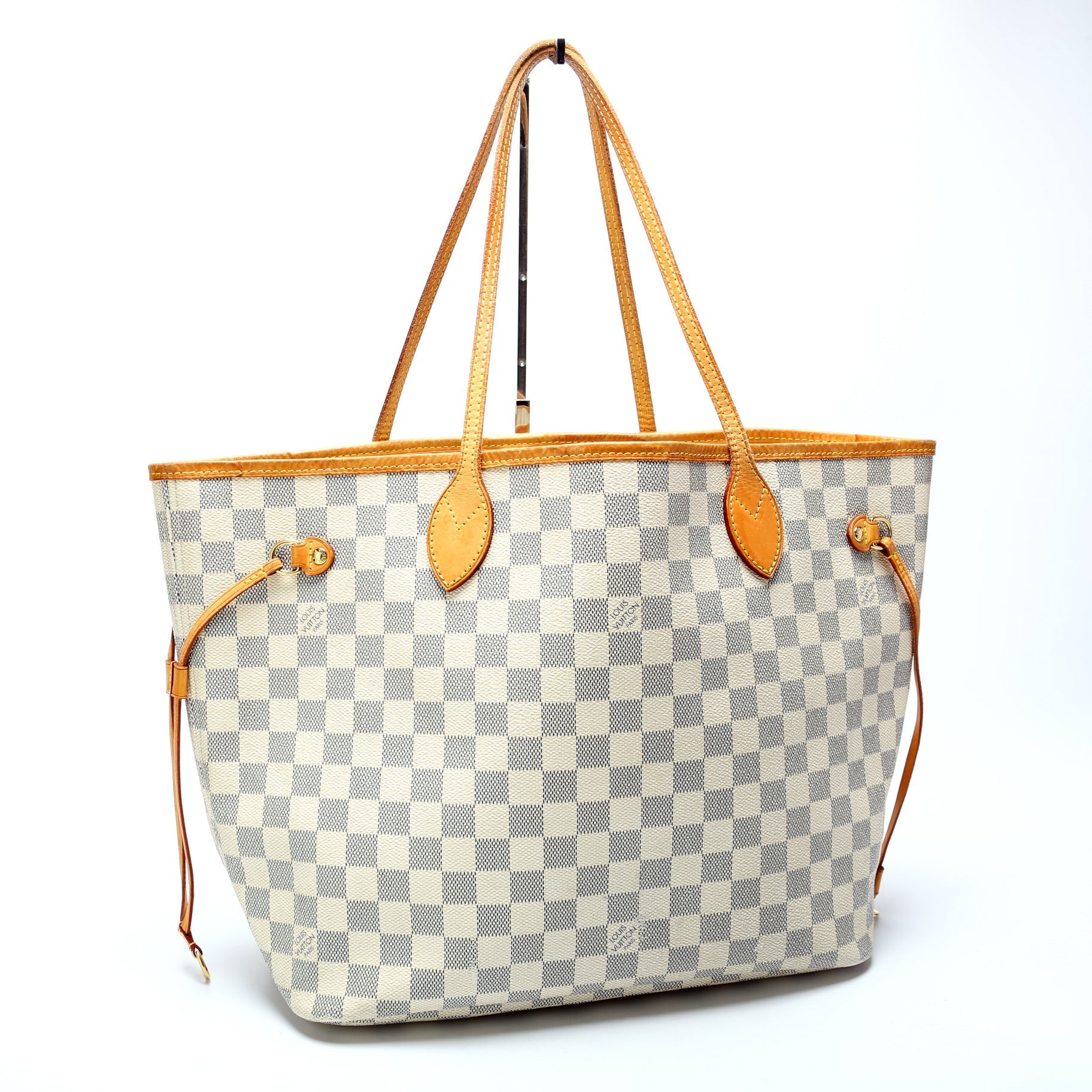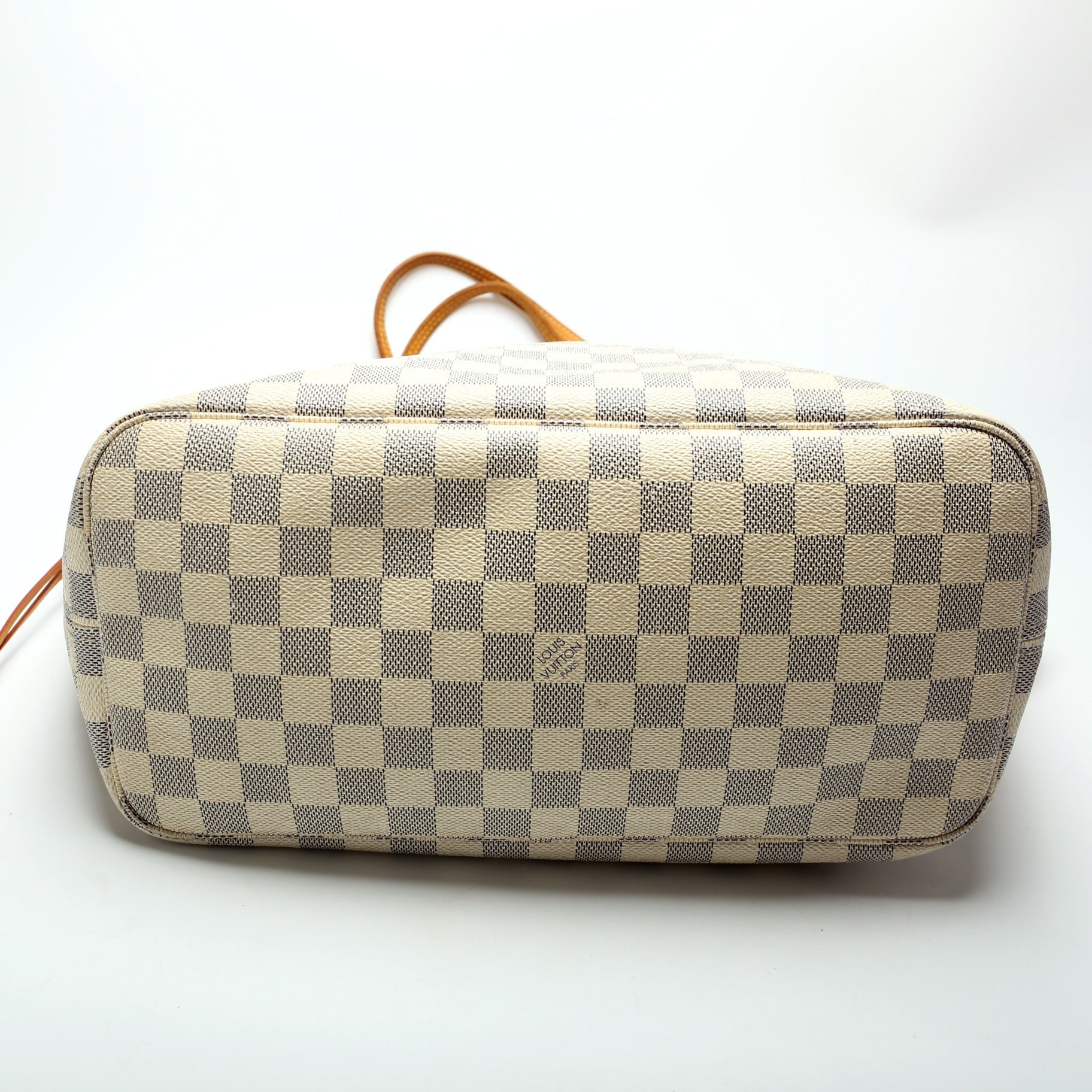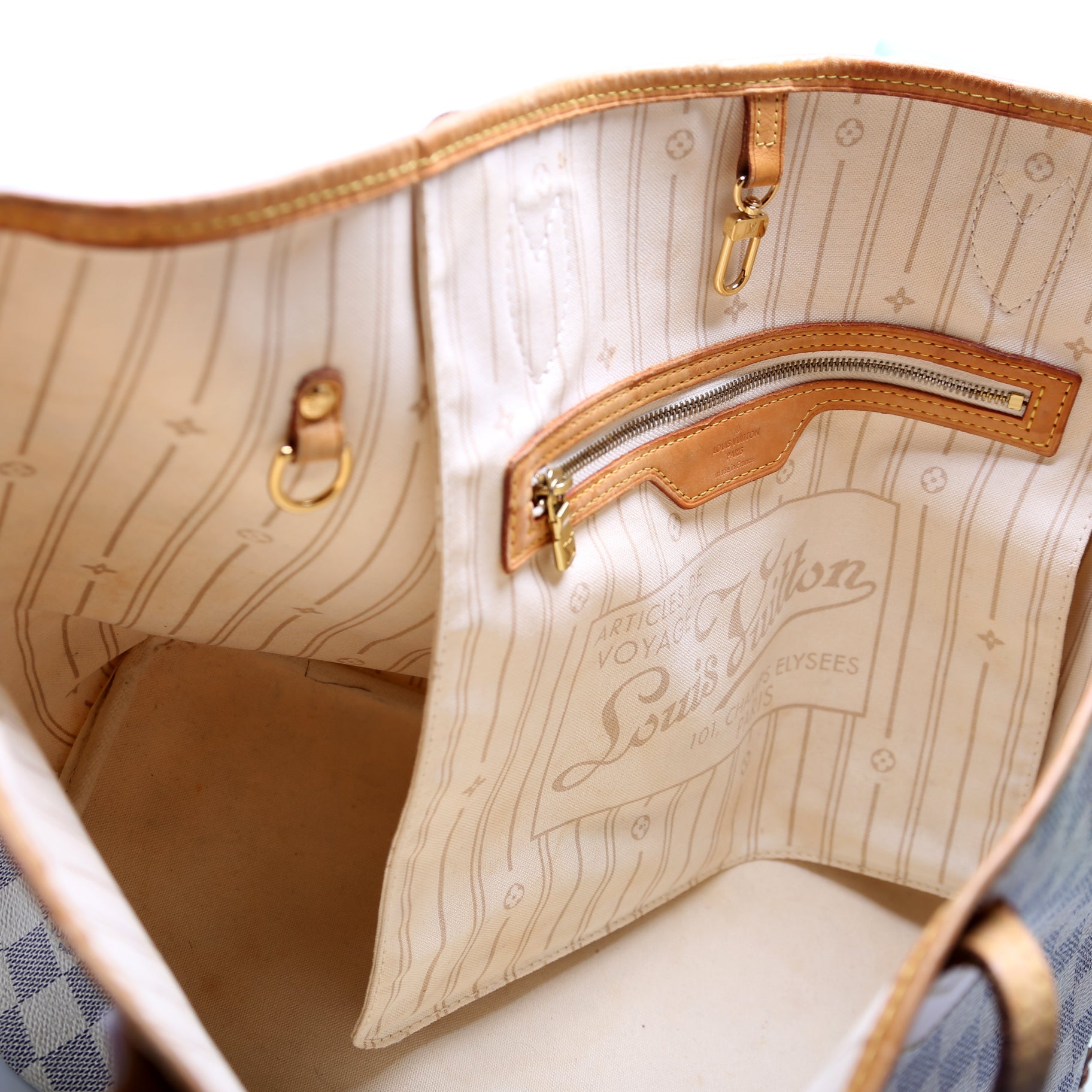 This Louis Vuitton Neverfull MMis eye catching bag. The exterior is in the classic Louis Vuitton Damier Azur coated canvas.