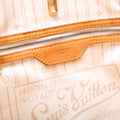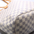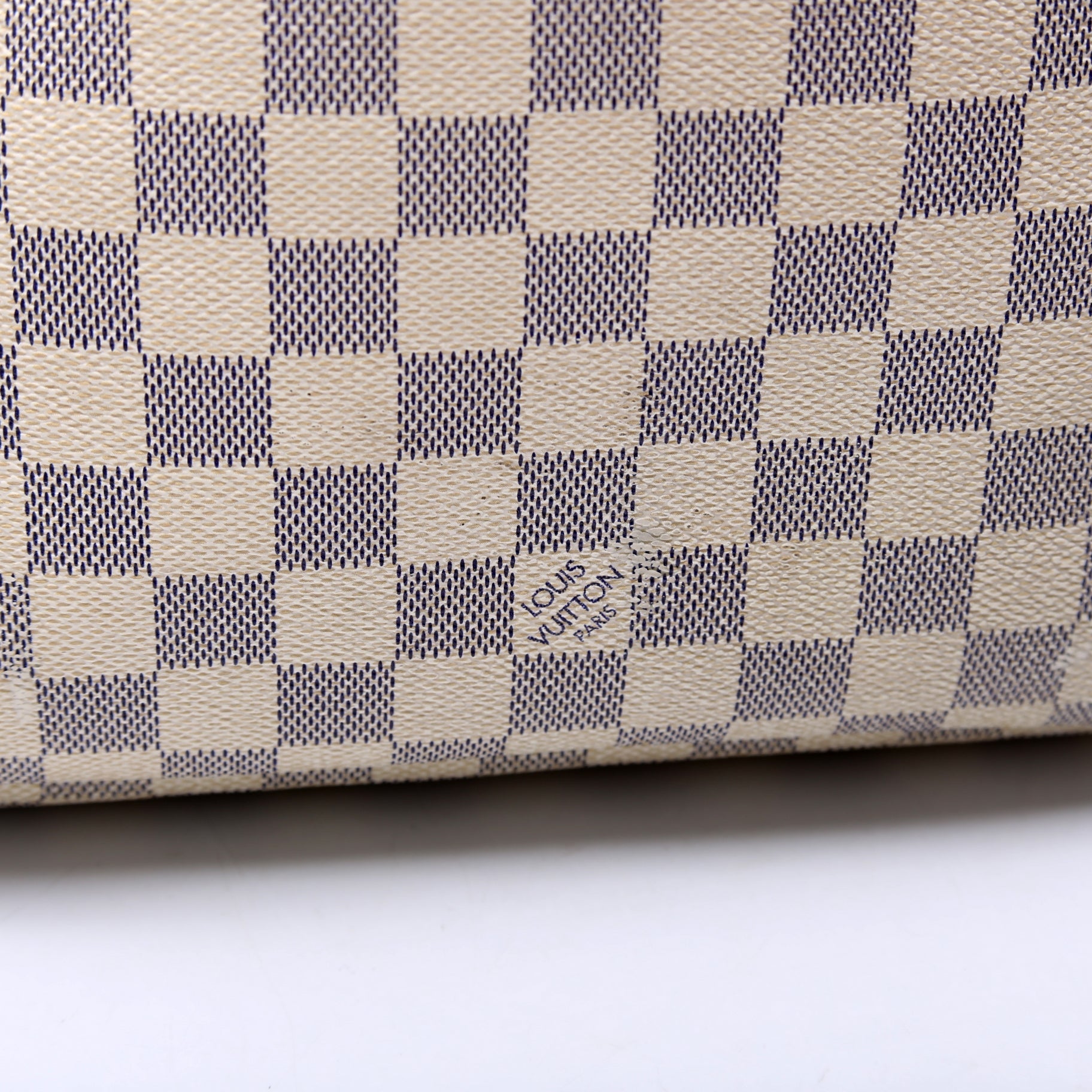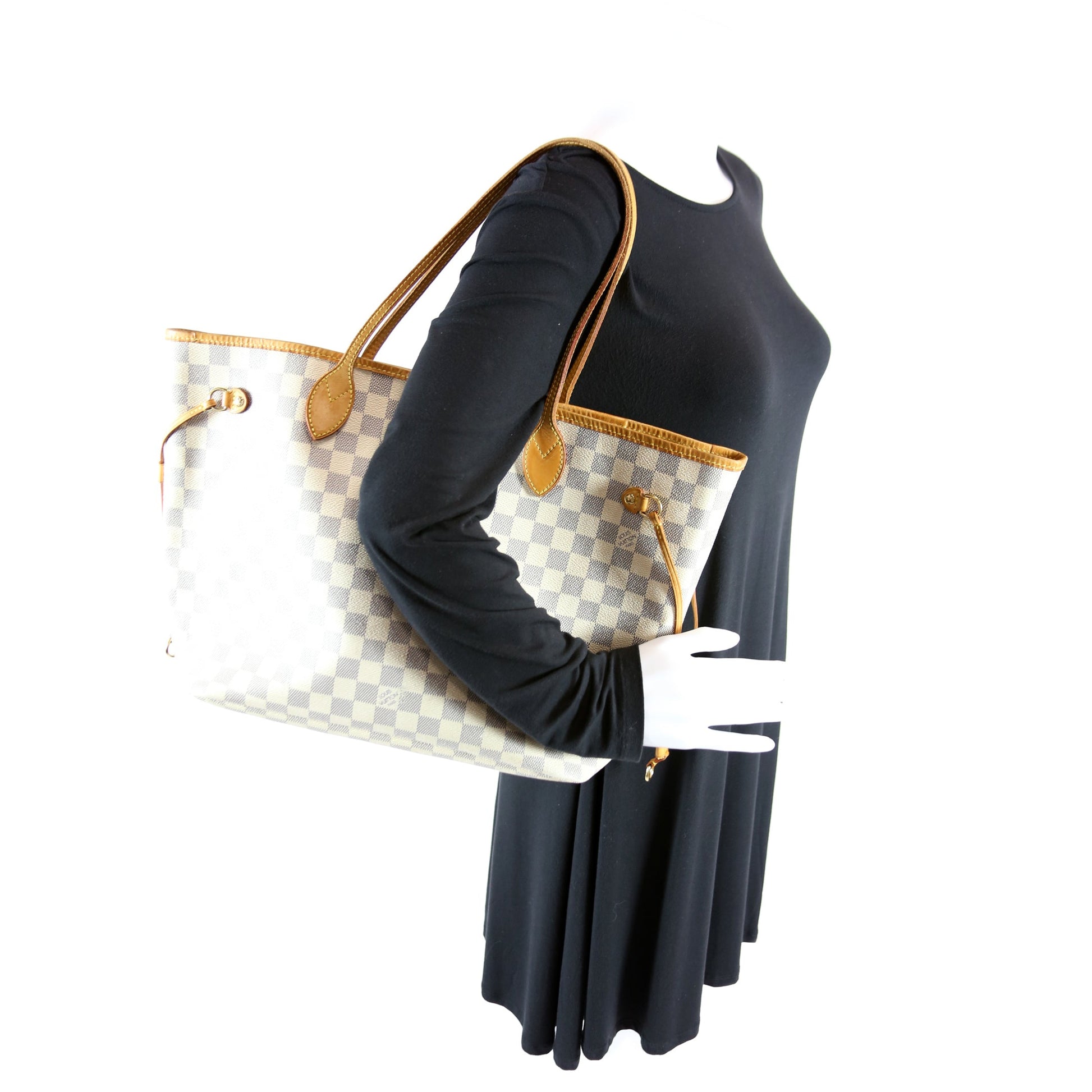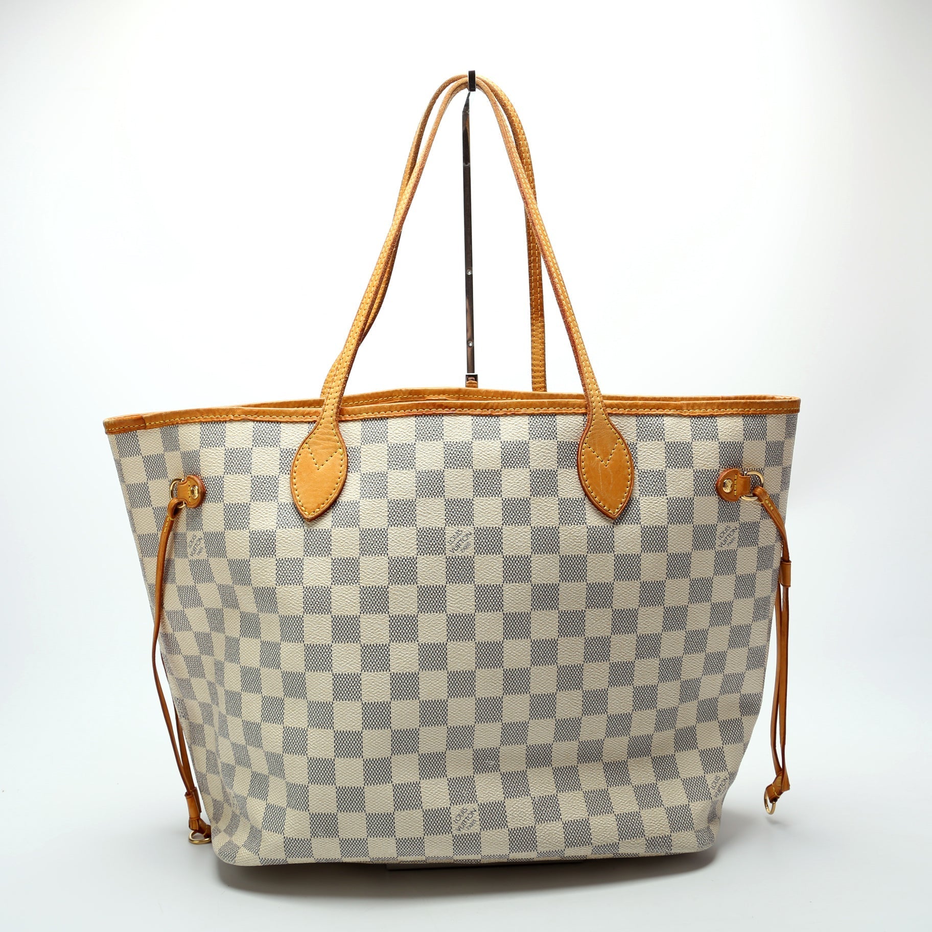 This Louis Vuitton Neverfull MMis eye catching bag. The exterior is in the classic Louis Vuitton Damier Azur coated canvas.