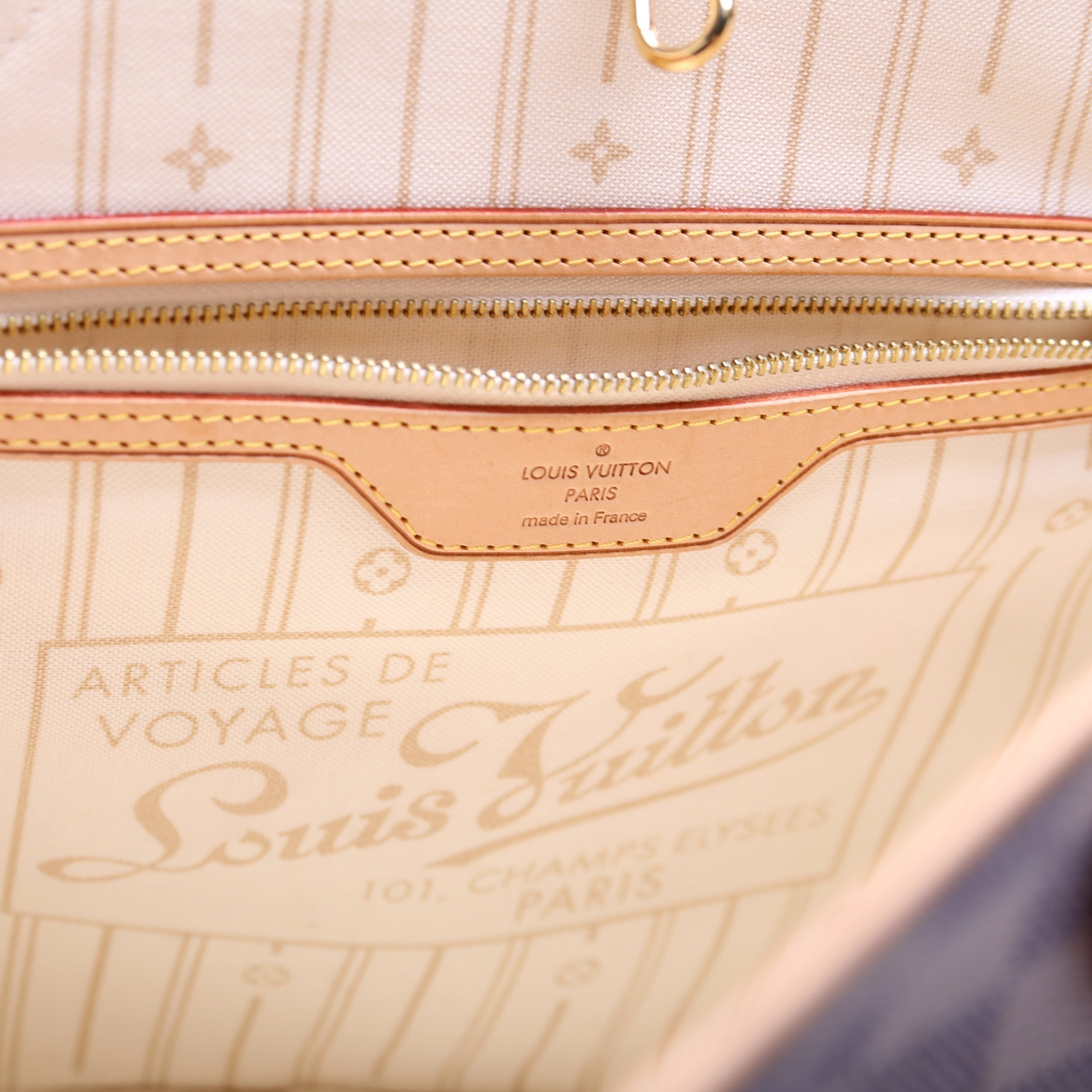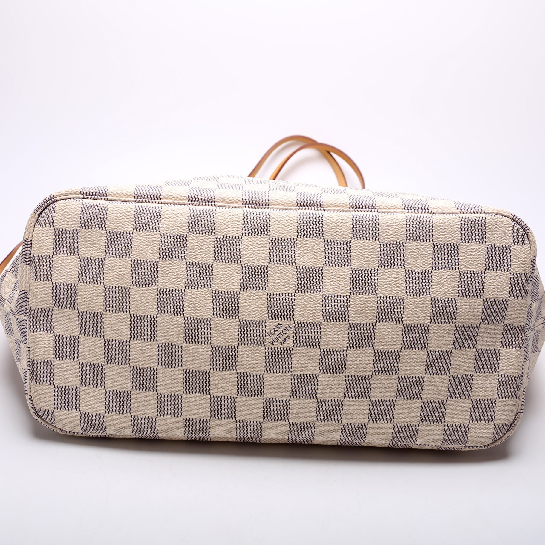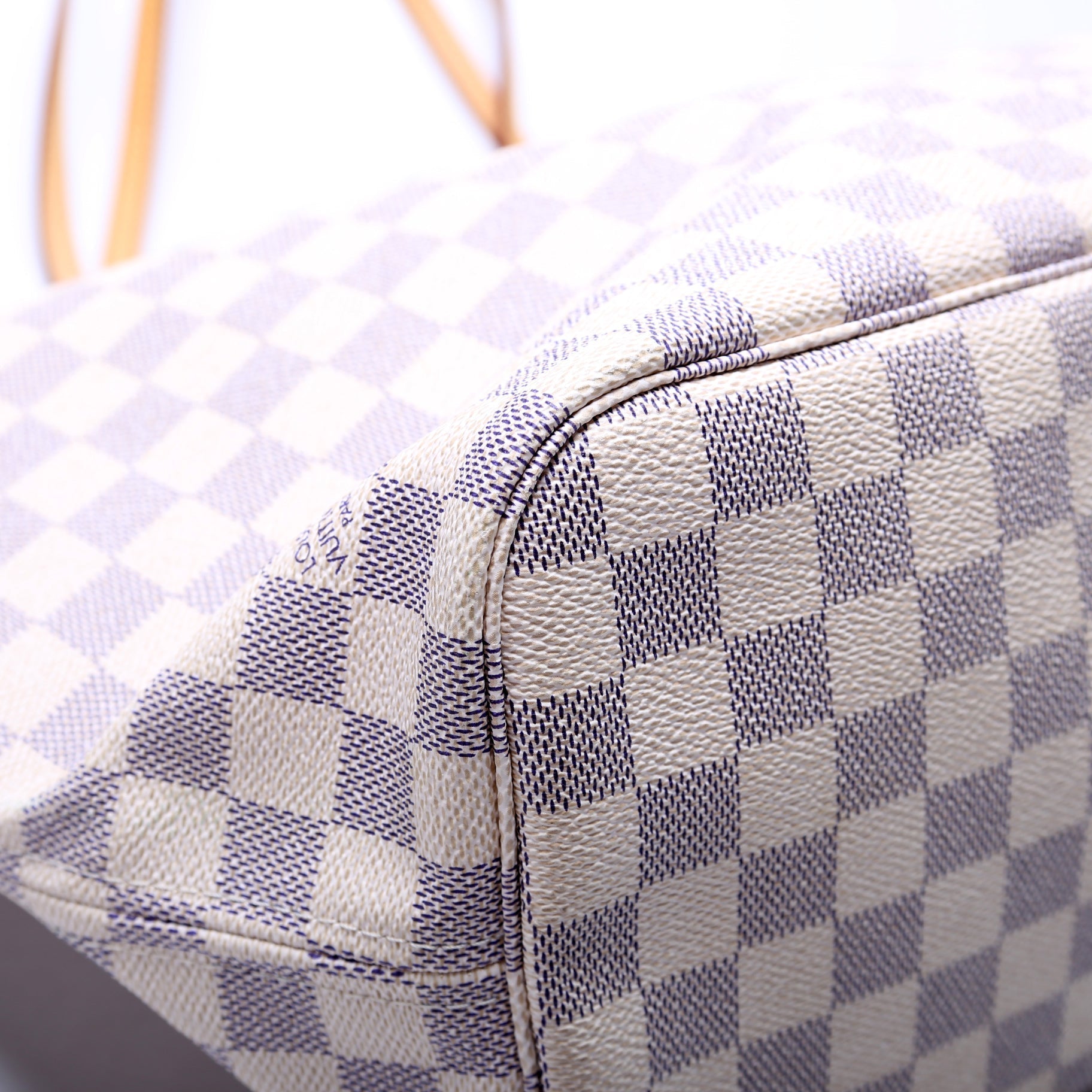 This Louis Vuitton Neverfull MMis eye catching bag. The exterior is in the classic Louis Vuitton Damier Azur coated canvas.