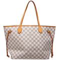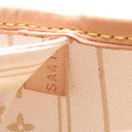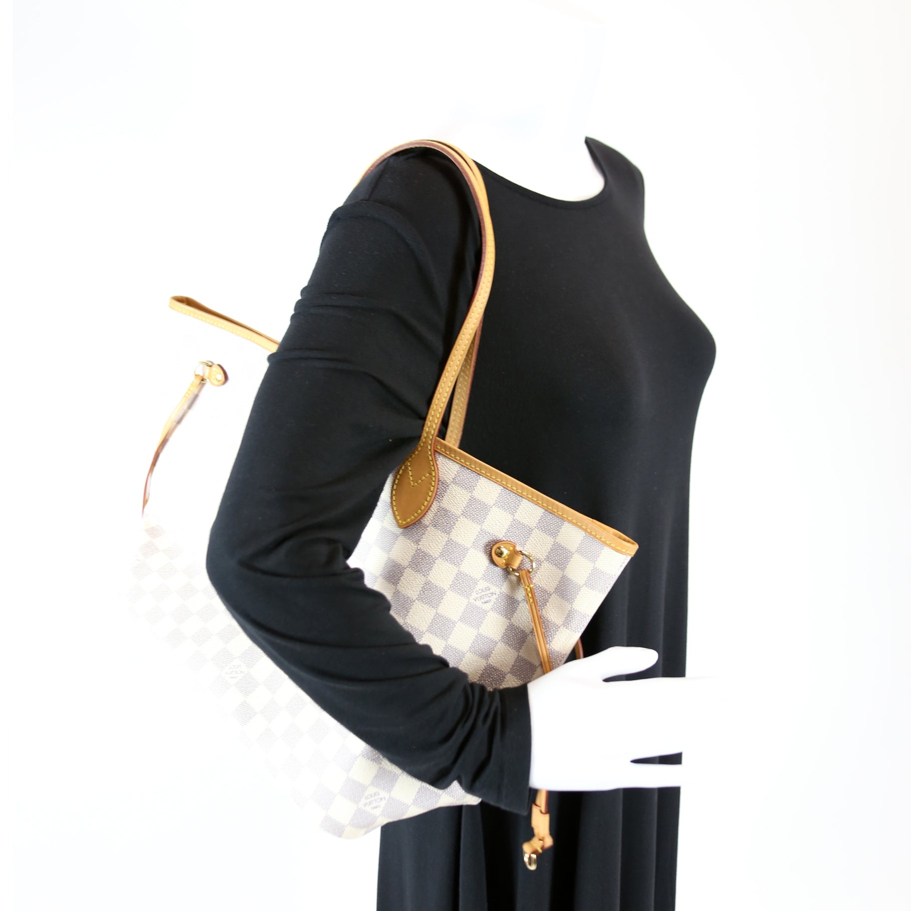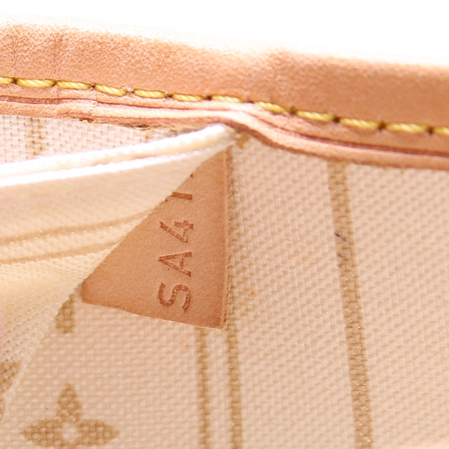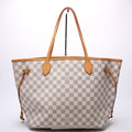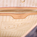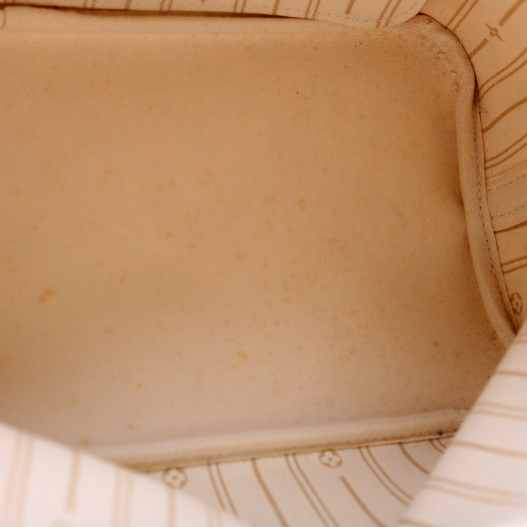 This Louis Vuitton Neverfull MMis eye catching bag. The exterior is in the classic Louis Vuitton Damier Azur coated canvas.