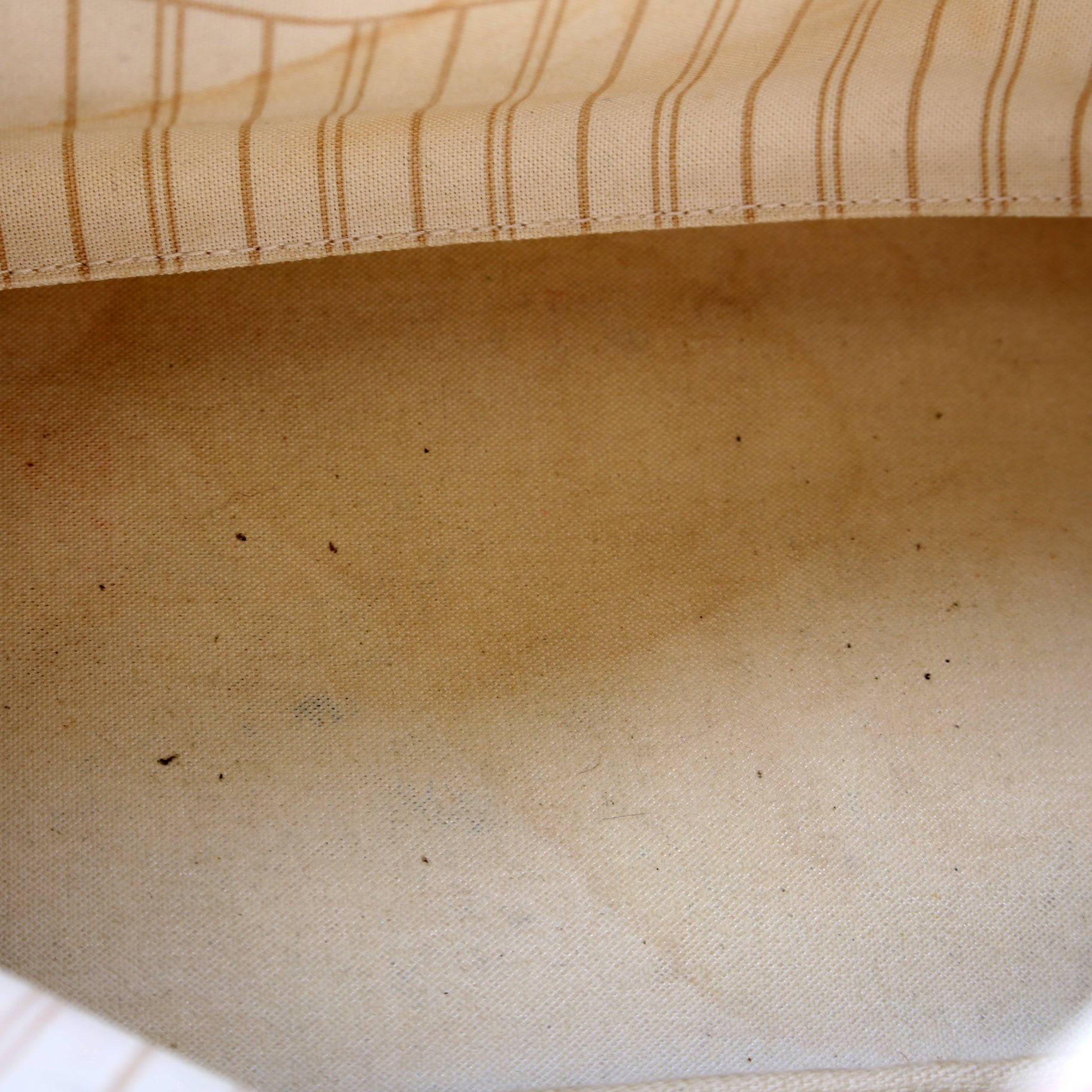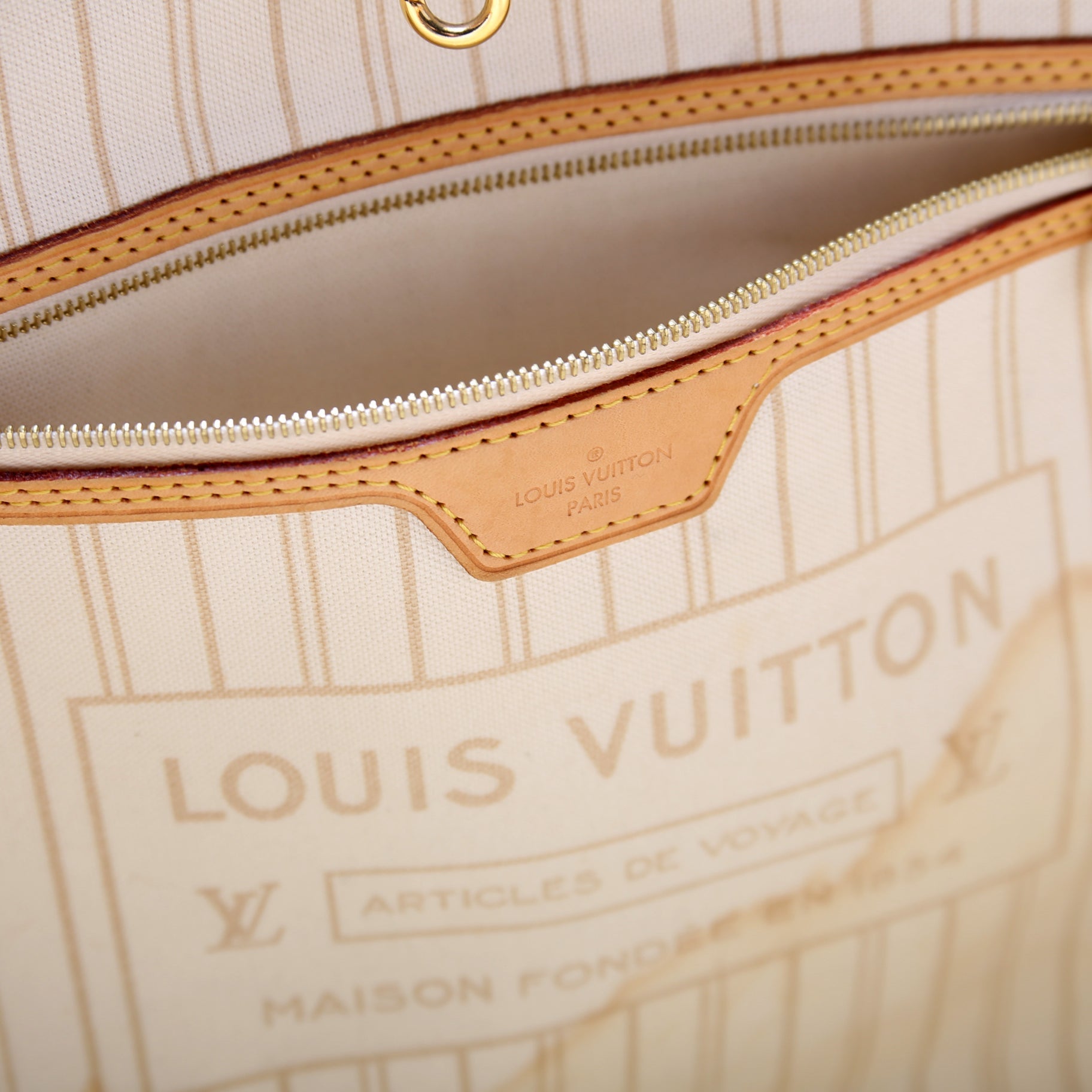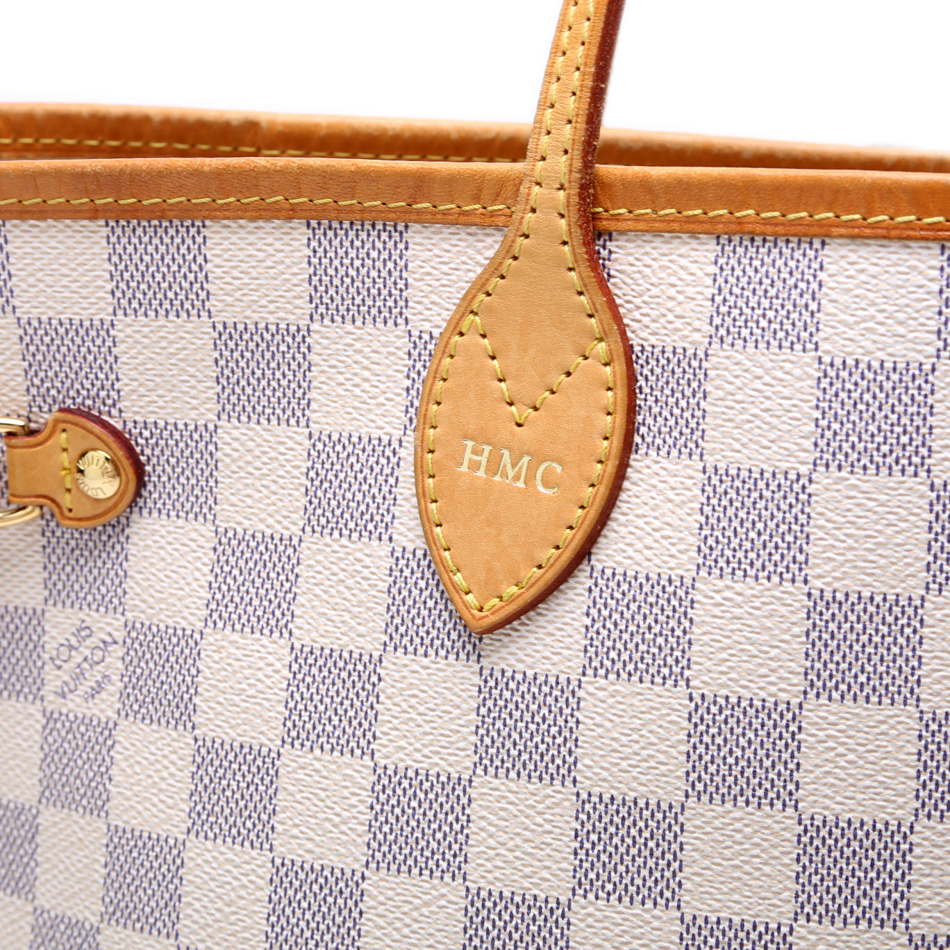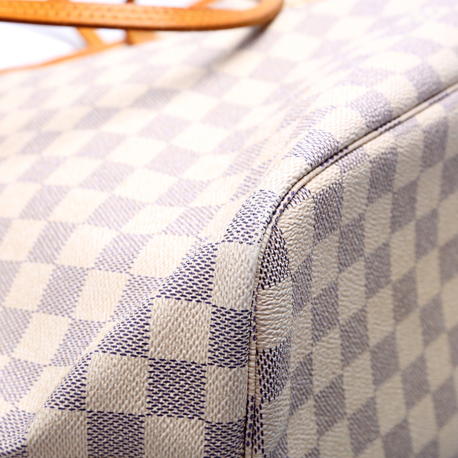 This Louis Vuitton Neverfull MMis eye catching bag. The exterior is in the classic Louis Vuitton Damier Azur coated canvas.