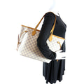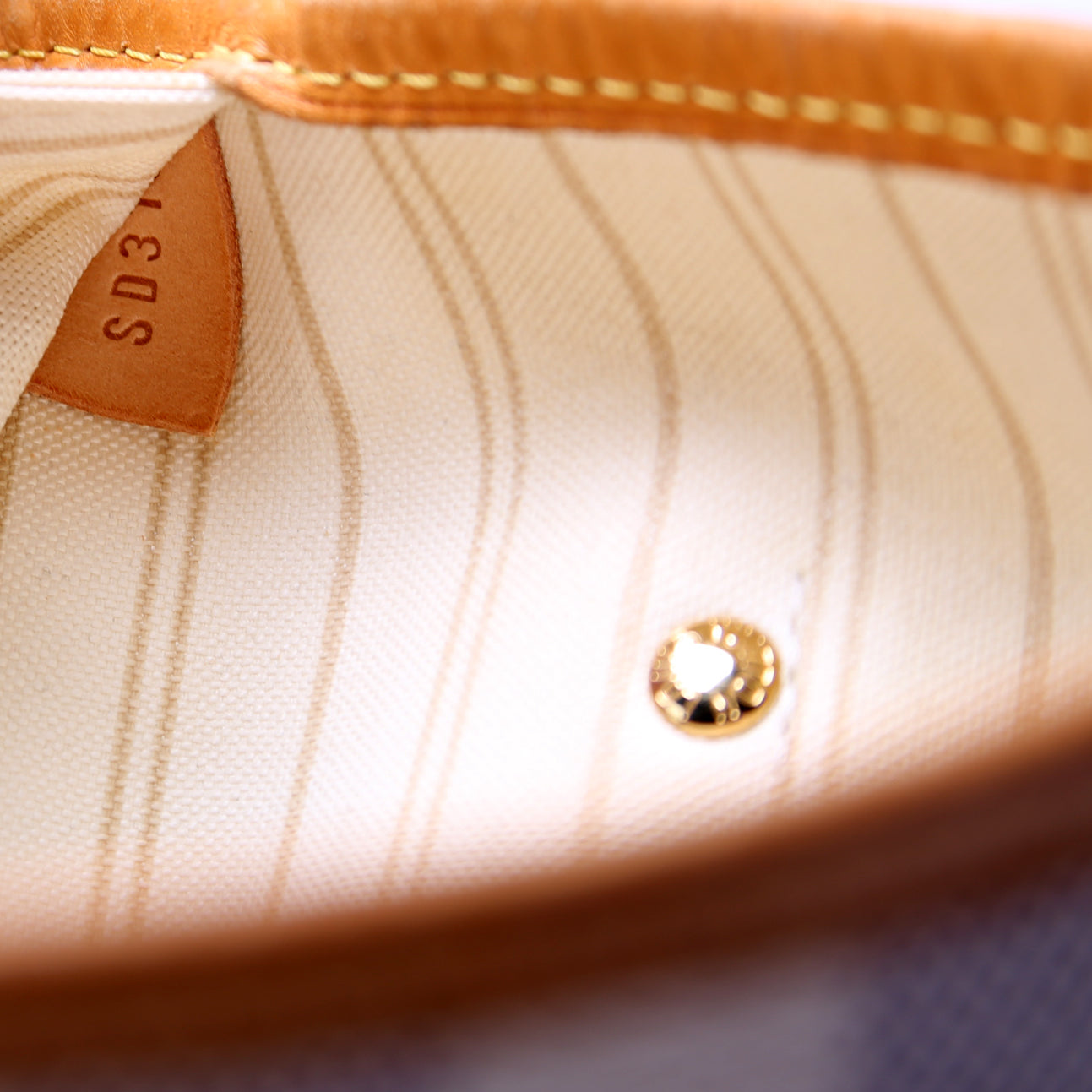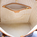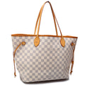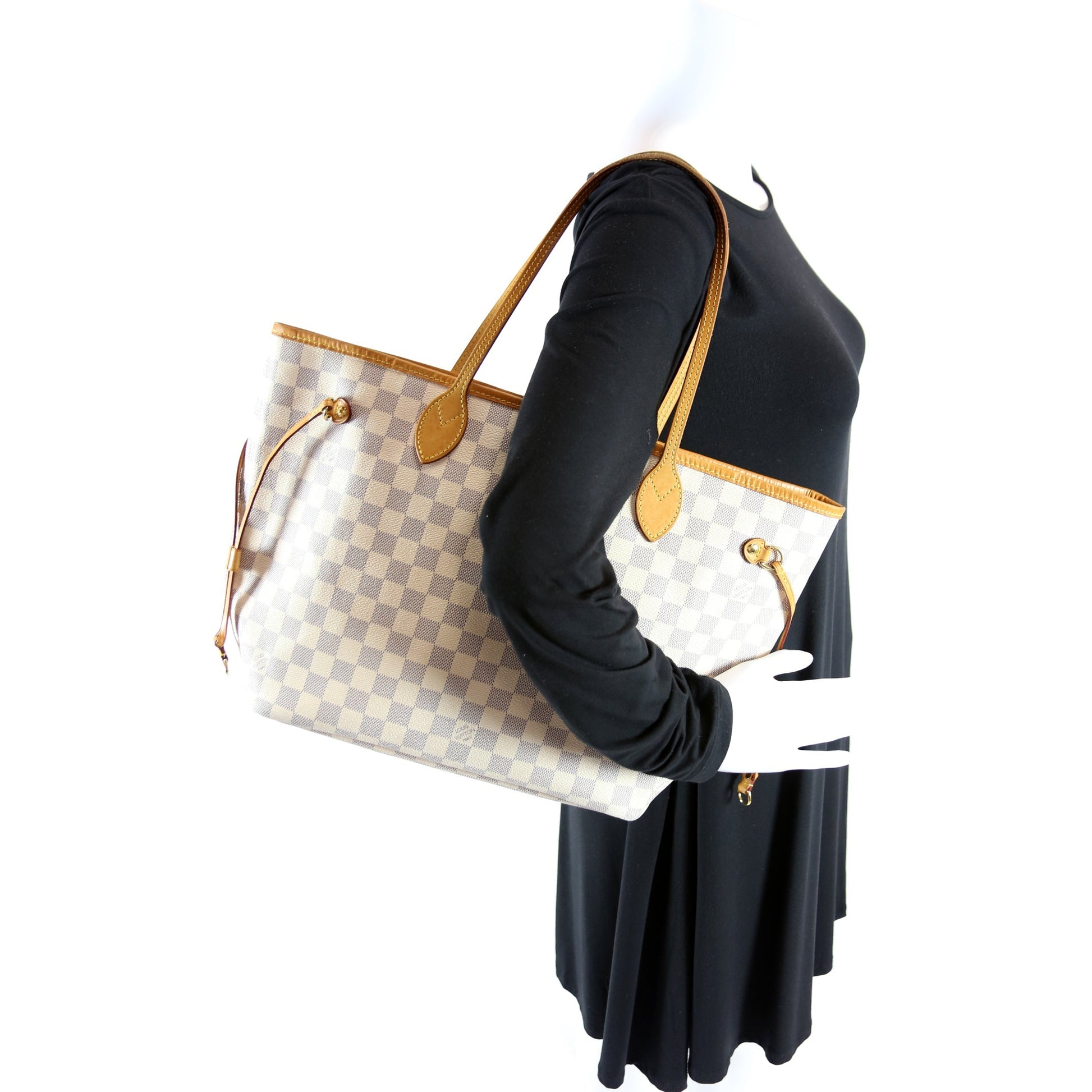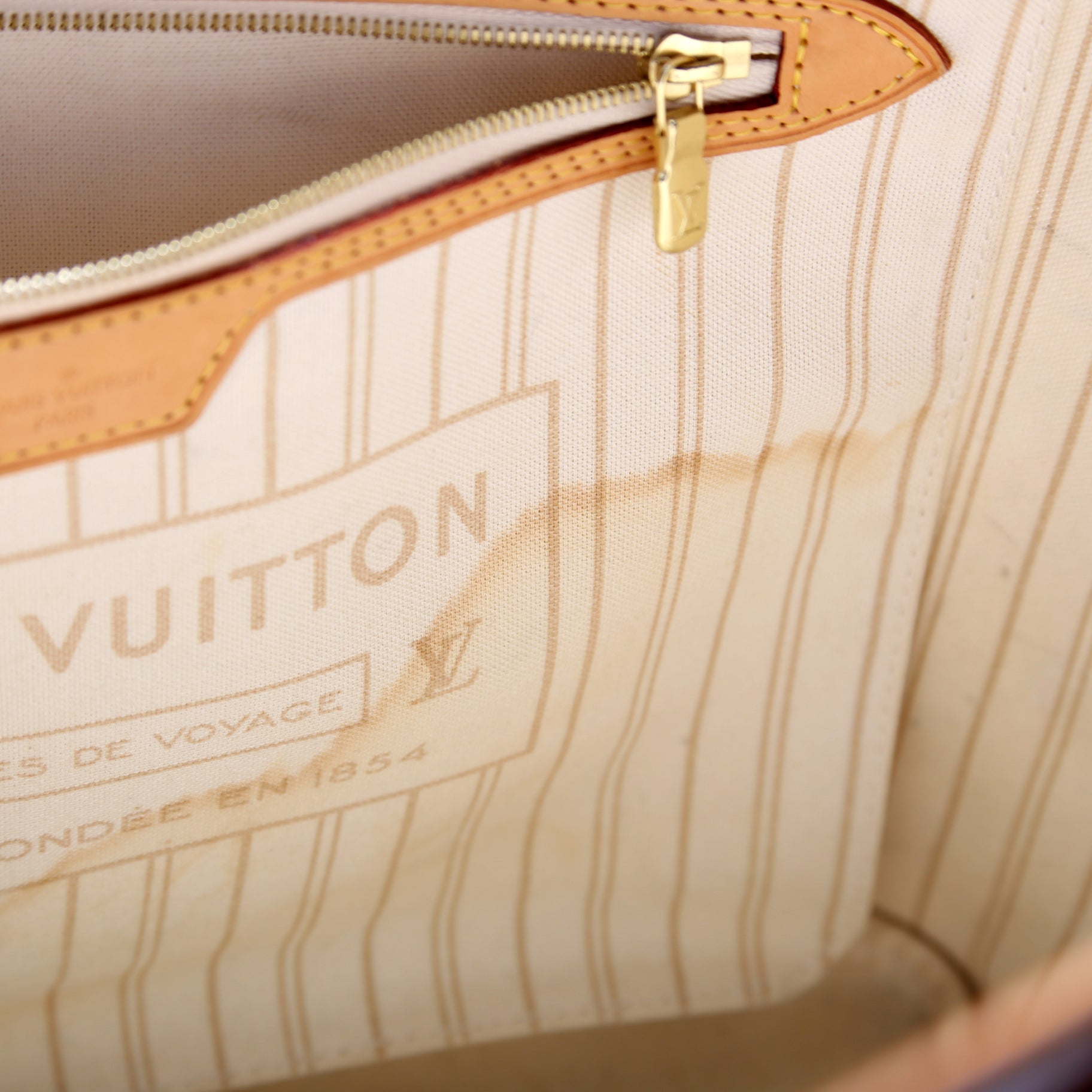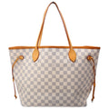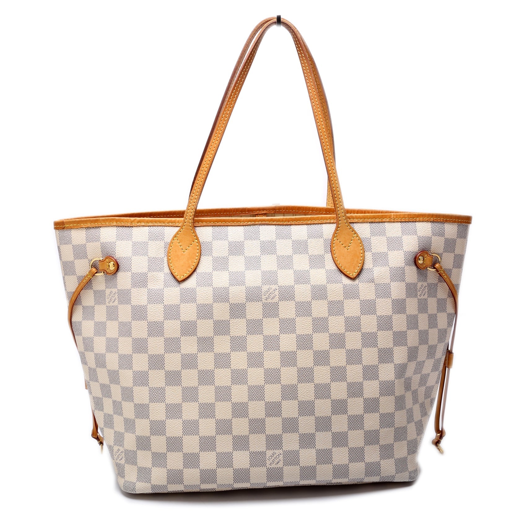 This Louis Vuitton Neverfull MMis eye catching bag. The exterior is in the classic Louis Vuitton Damier Azur coated canvas.