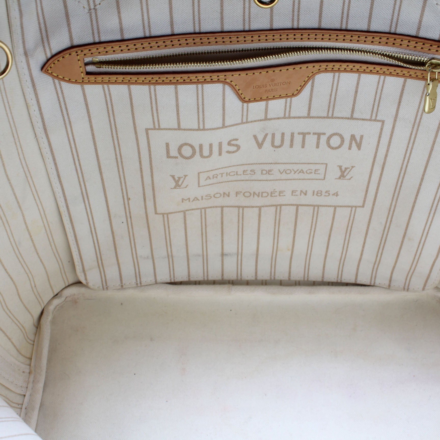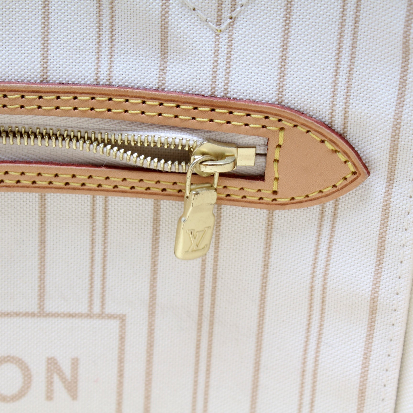 This Louis Vuitton Neverfull MMis eye catching bag. The exterior is in the classic Louis Vuitton Damier Aur coated canvas.