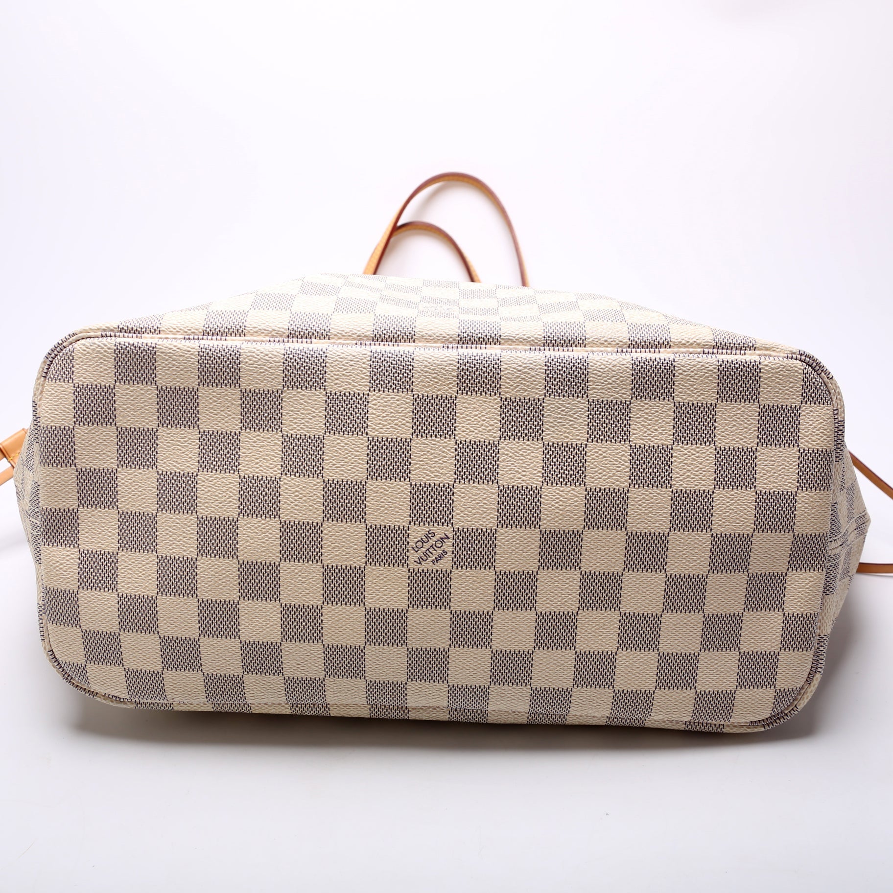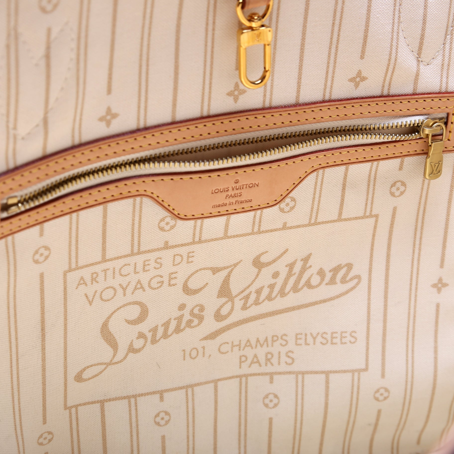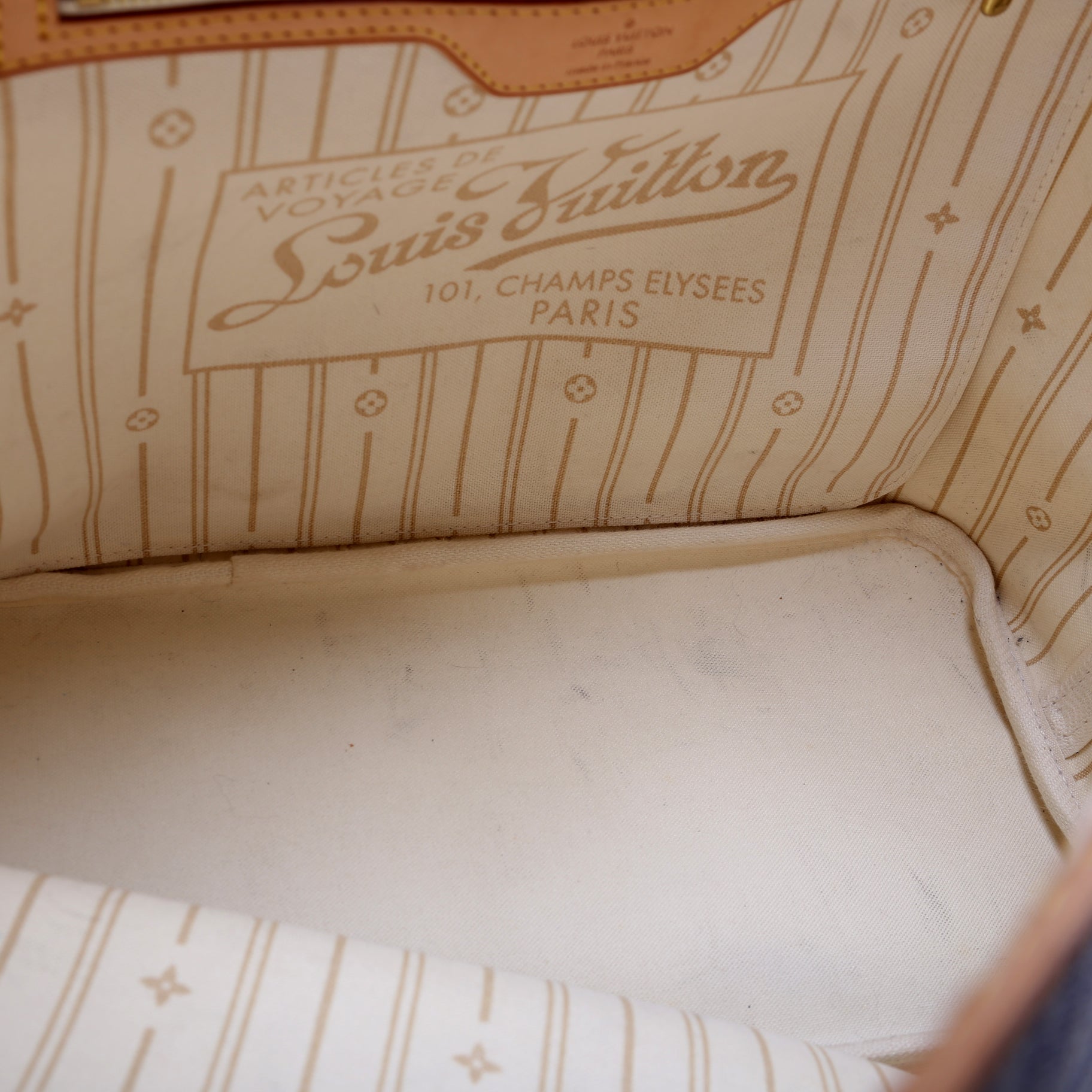This Louis Vuitton Neverfull MMis eye catching bag. The exterior is in the classic Louis Vuitton Damier Azur coated canvas.