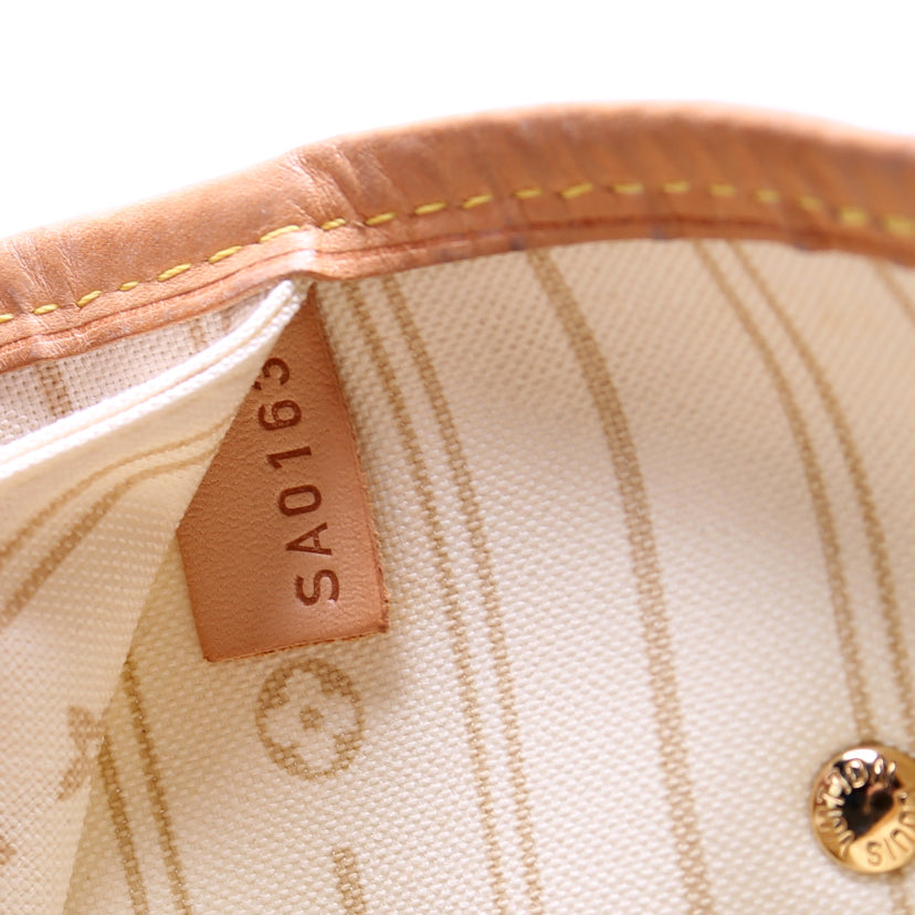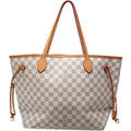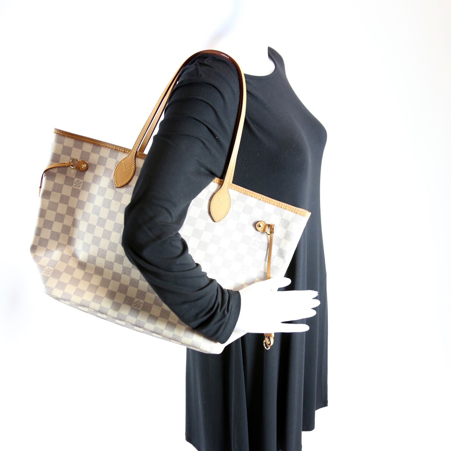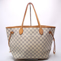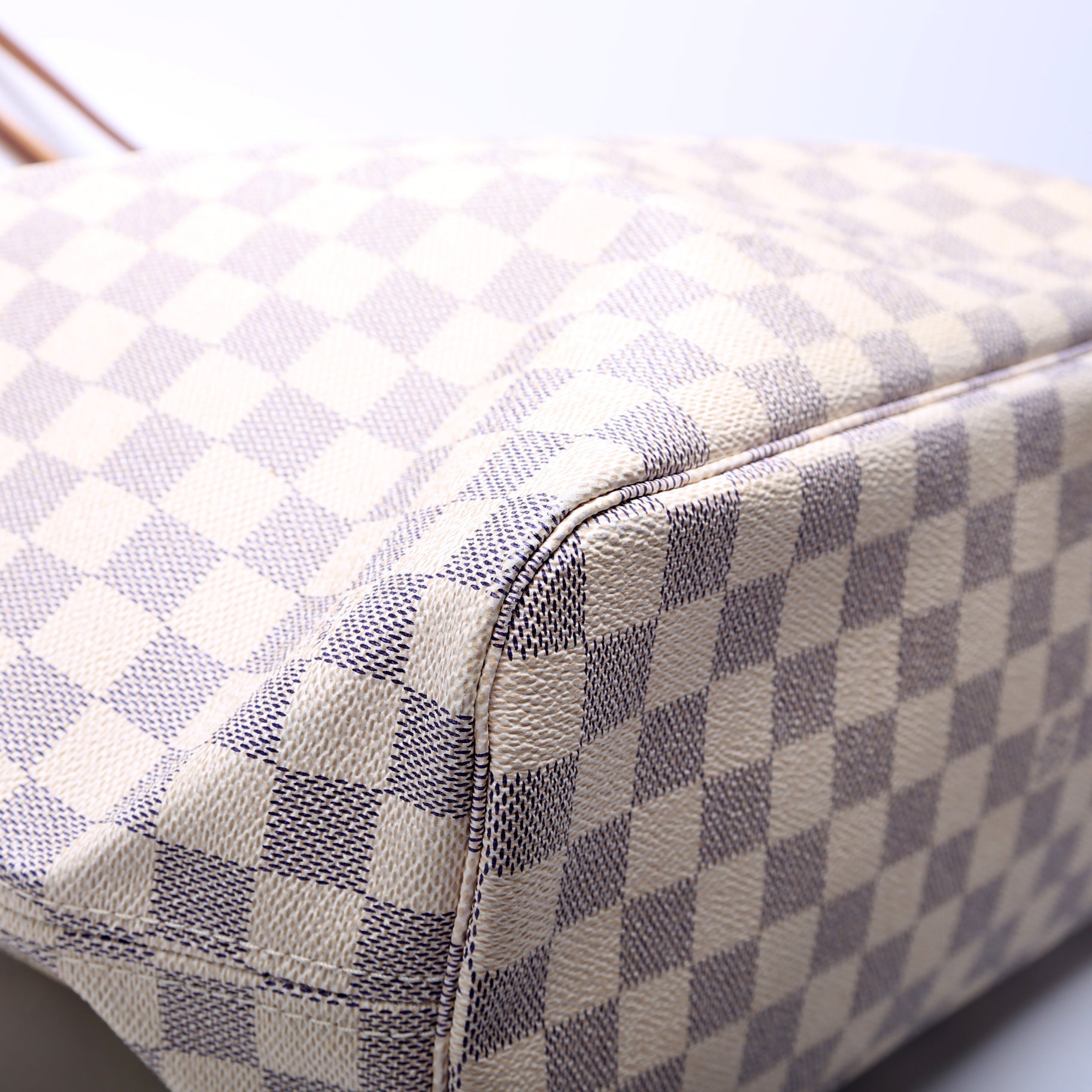This Louis Vuitton Neverfull MMis eye catching bag. The exterior is in the classic Louis Vuitton Damier Azur coated canvas.