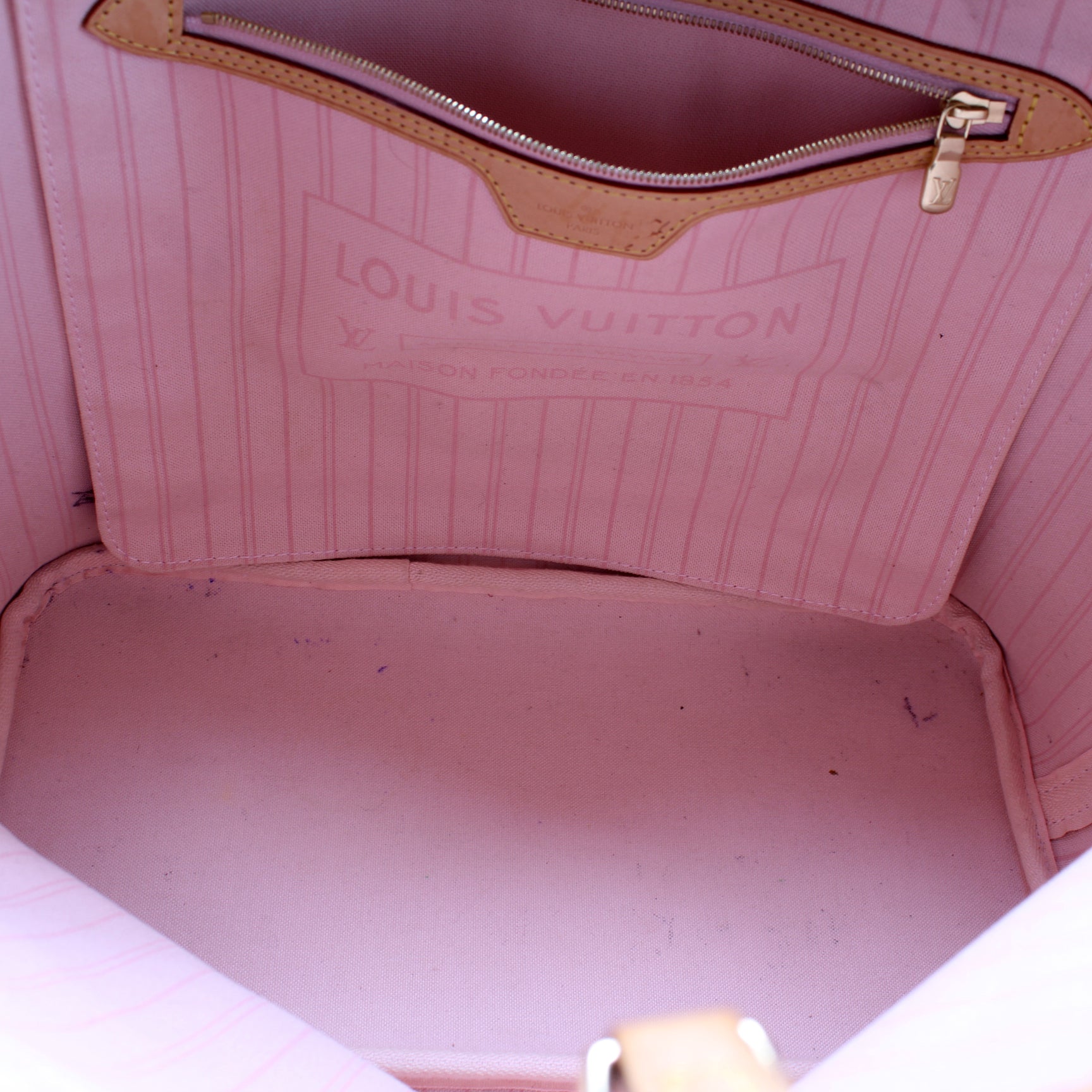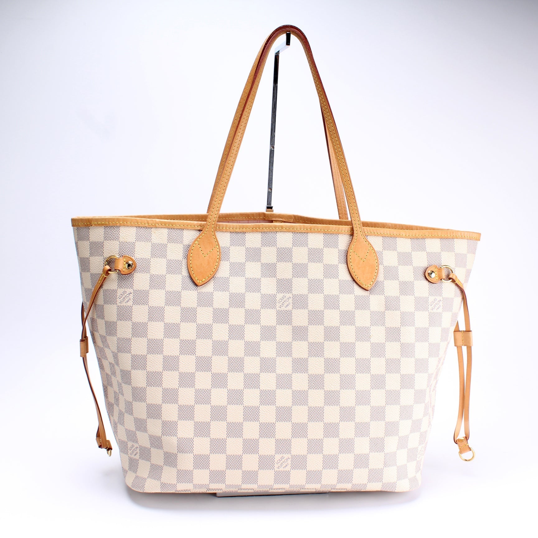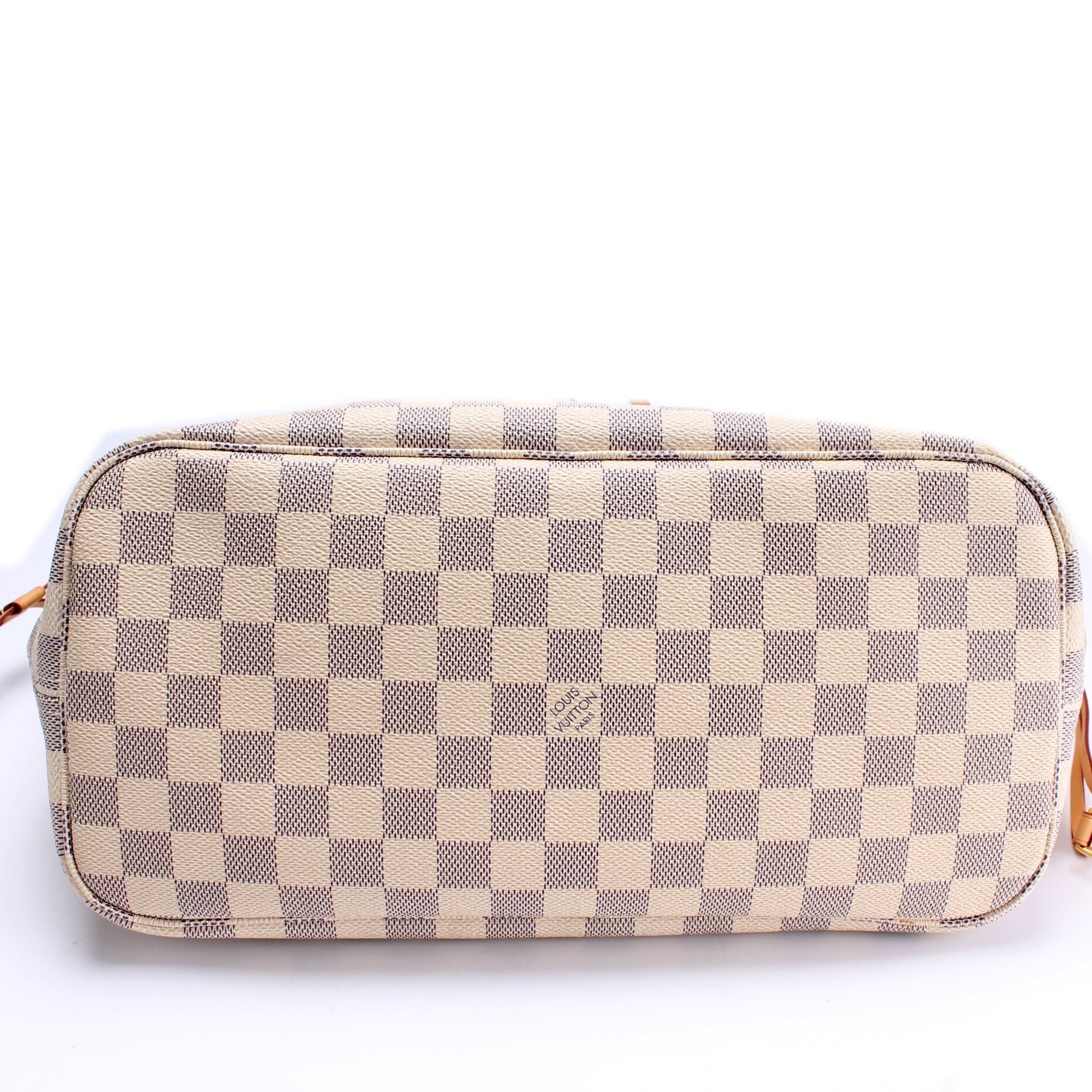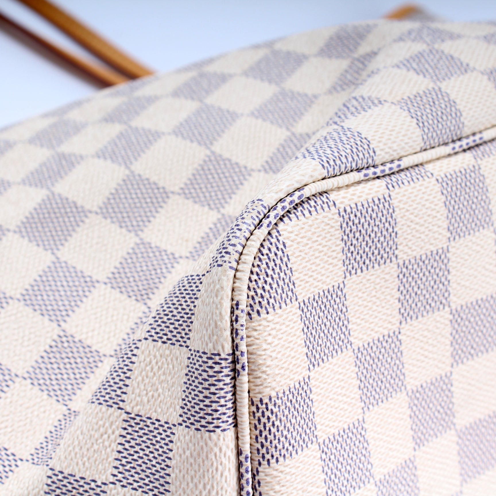 This Louis Vuitton Neverfull MMis eye catching bag. The exterior is in the classic Louis Vuitton Damier Azur coated canvas.
