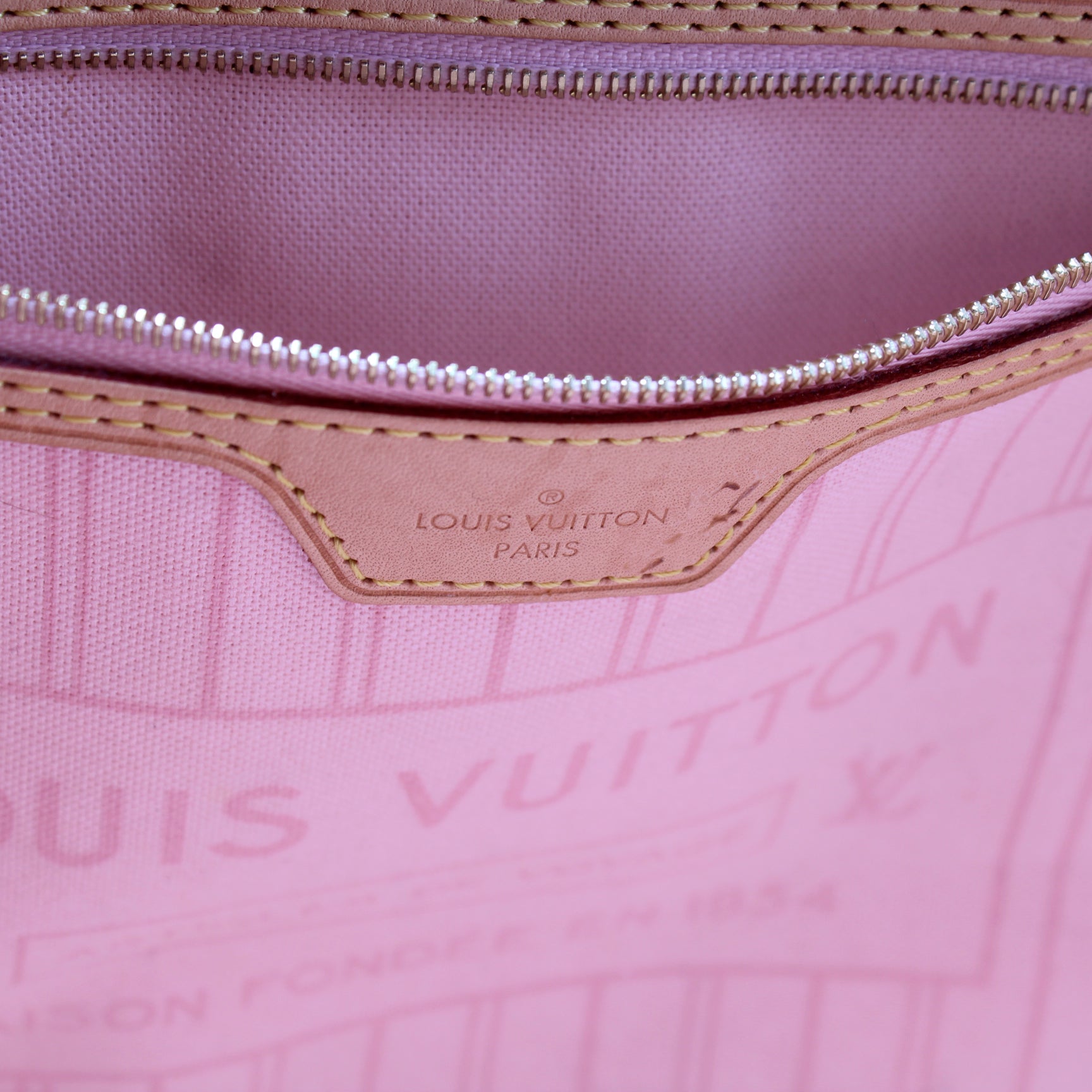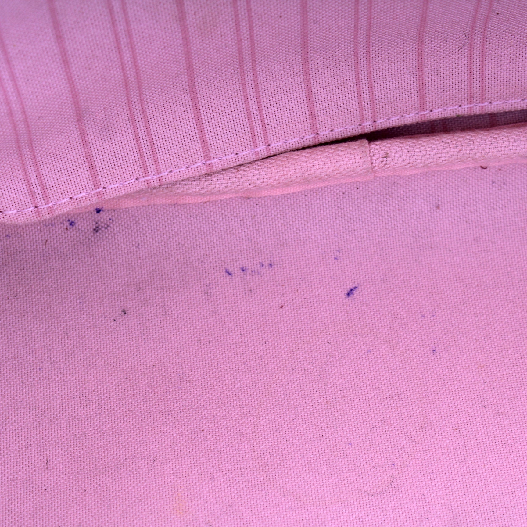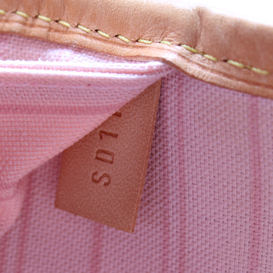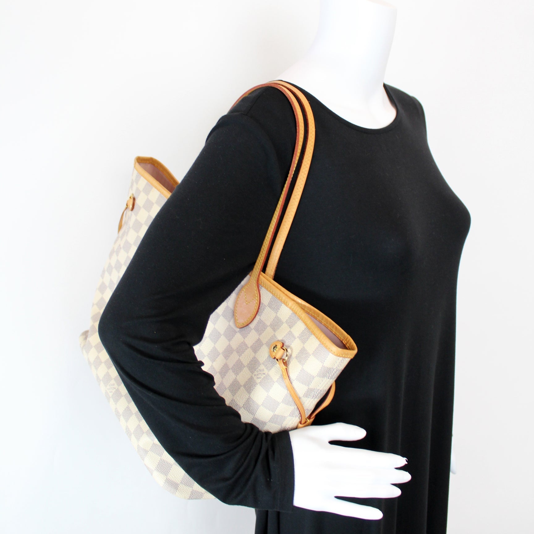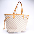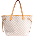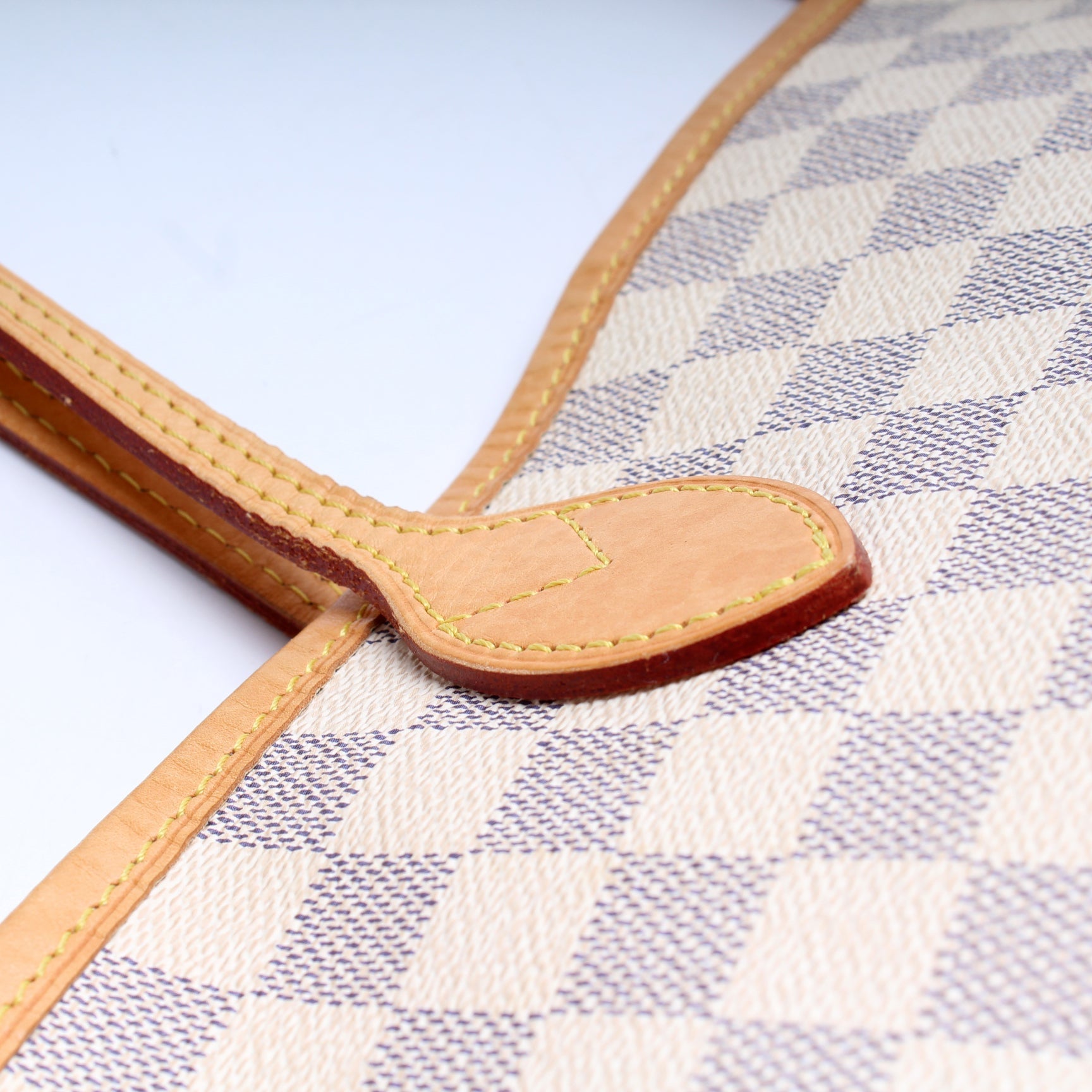 This Louis Vuitton Neverfull MMis eye catching bag. The exterior is in the classic Louis Vuitton Damier Azur coated canvas.