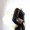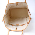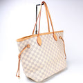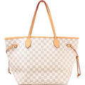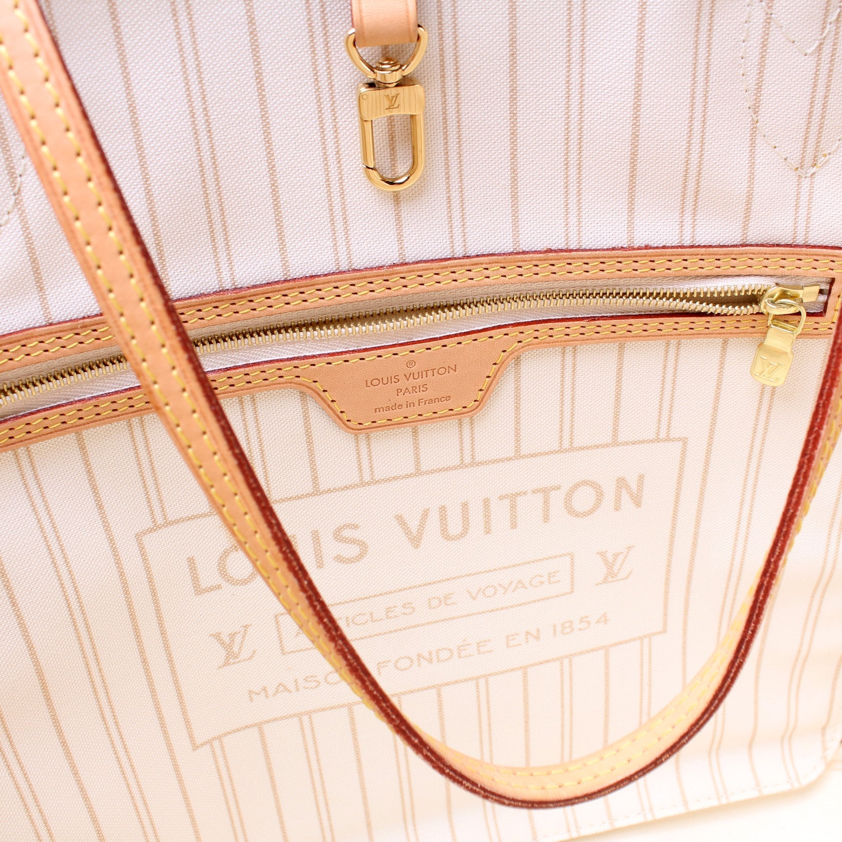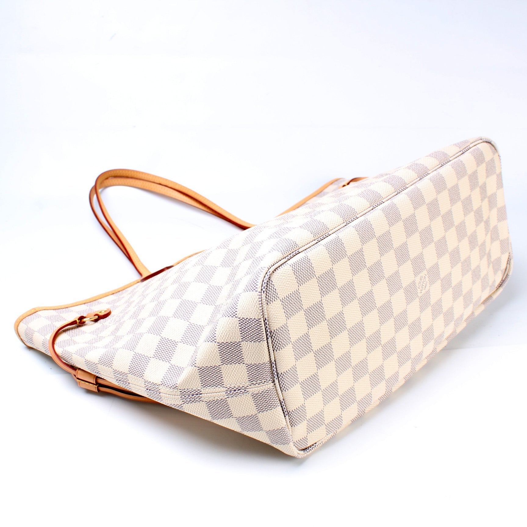 This Louis Vuitton Neverfull MMis eye catching bag. The exterior is in the classic Louis Vuitton Damier Azur coated canvas.