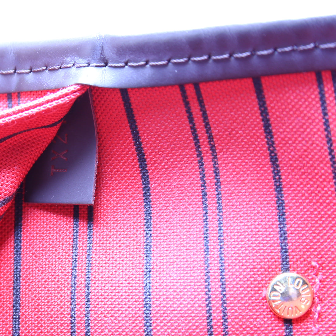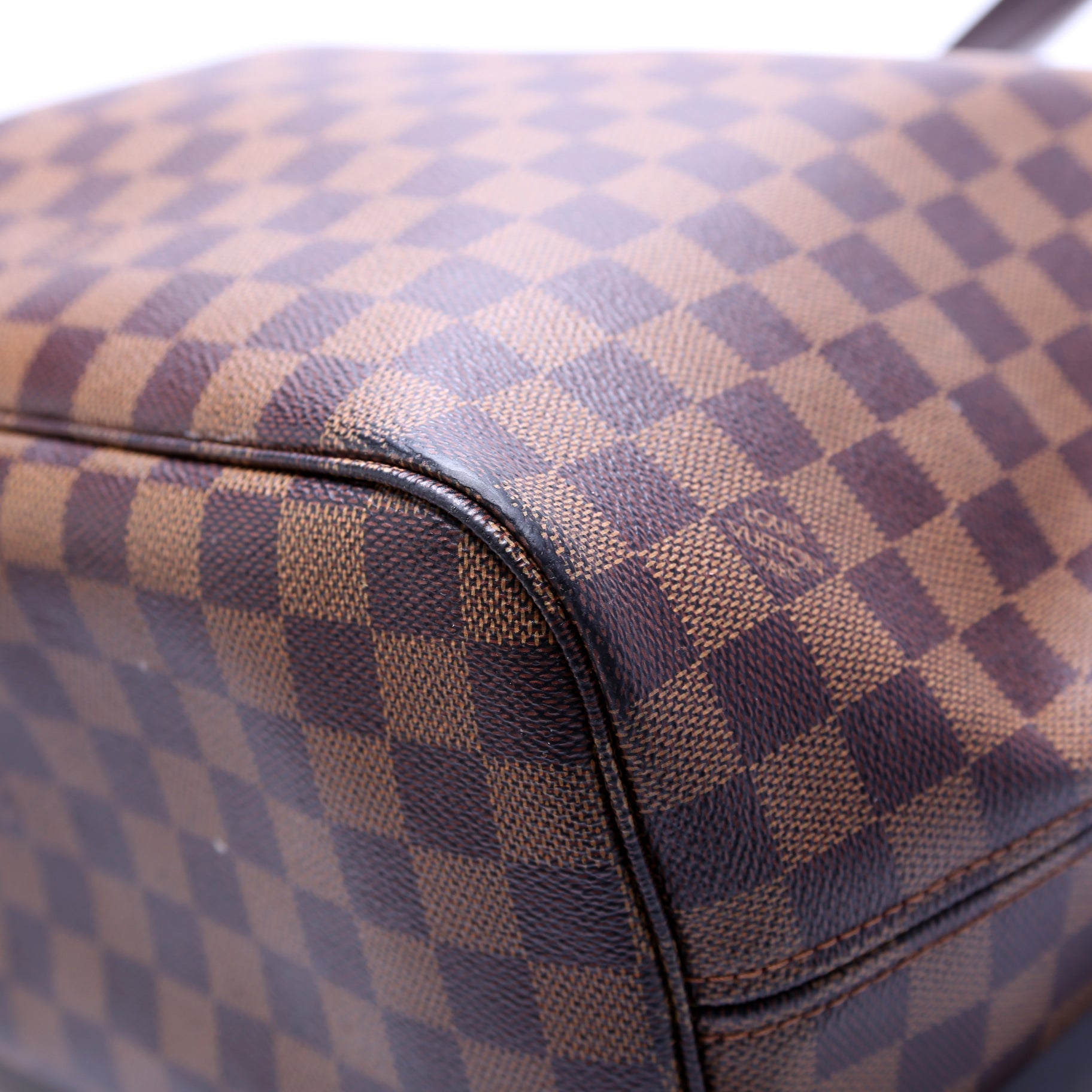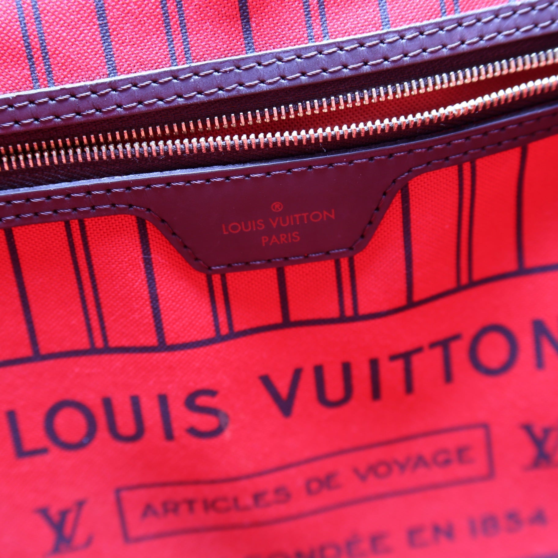 This Louis Vuitton Neverfull MMis eye catching bag. The exterior is in the classic Louis Vuitton Damier Ebene coated canvas.