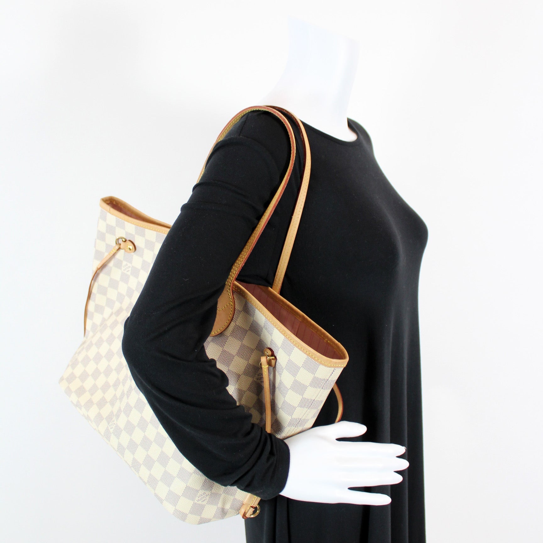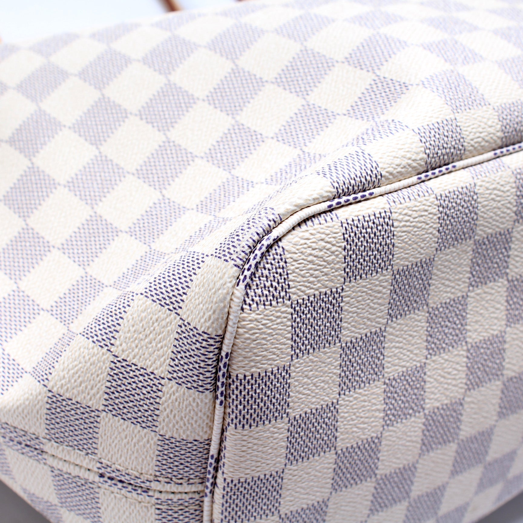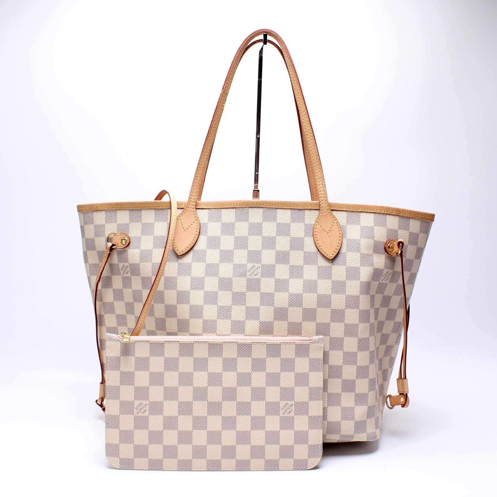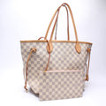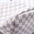This Louis Vuitton Neverfull W/Wallet MMis eye catching bag. The exterior is in the classic Louis Vuitton Damier Azur coated canvas.