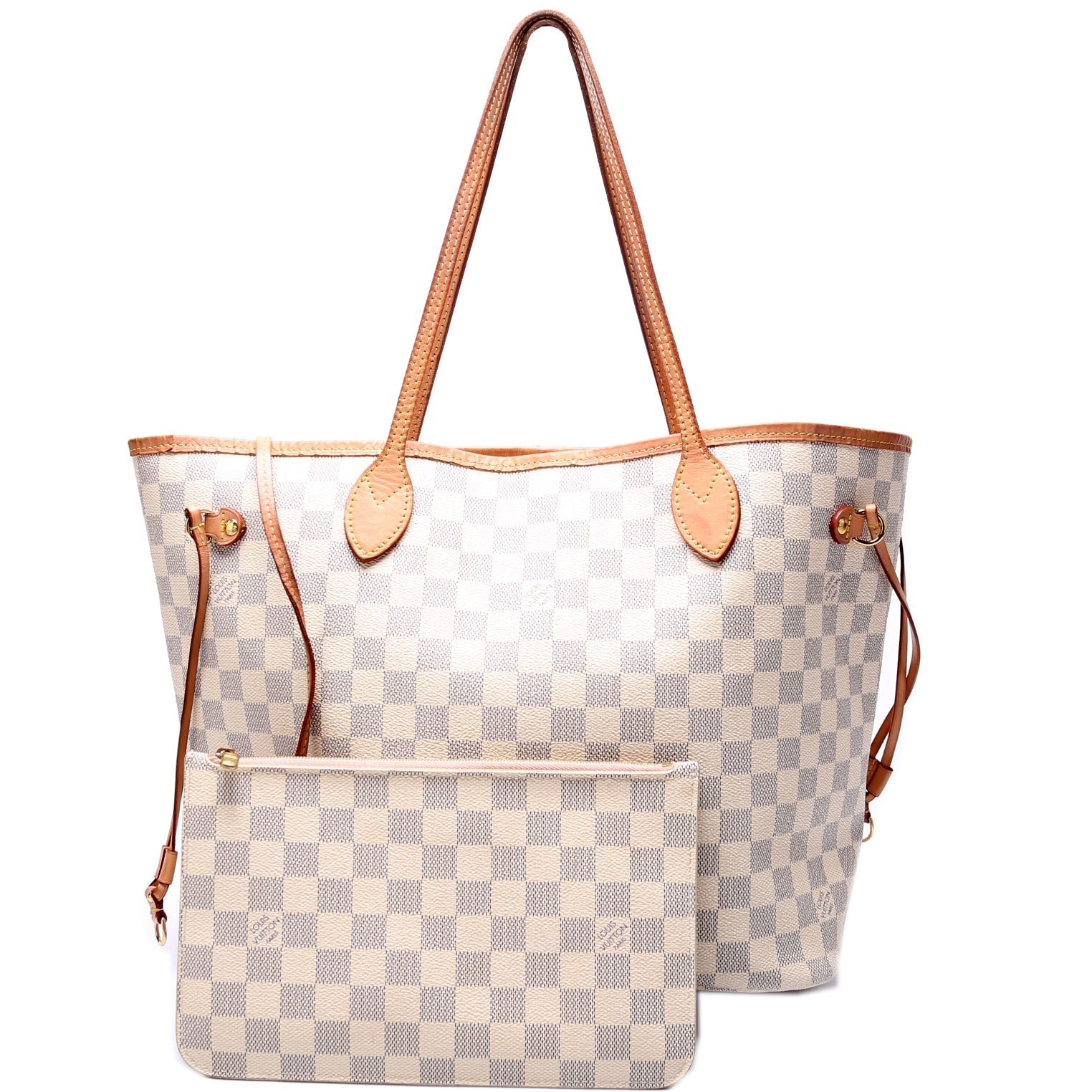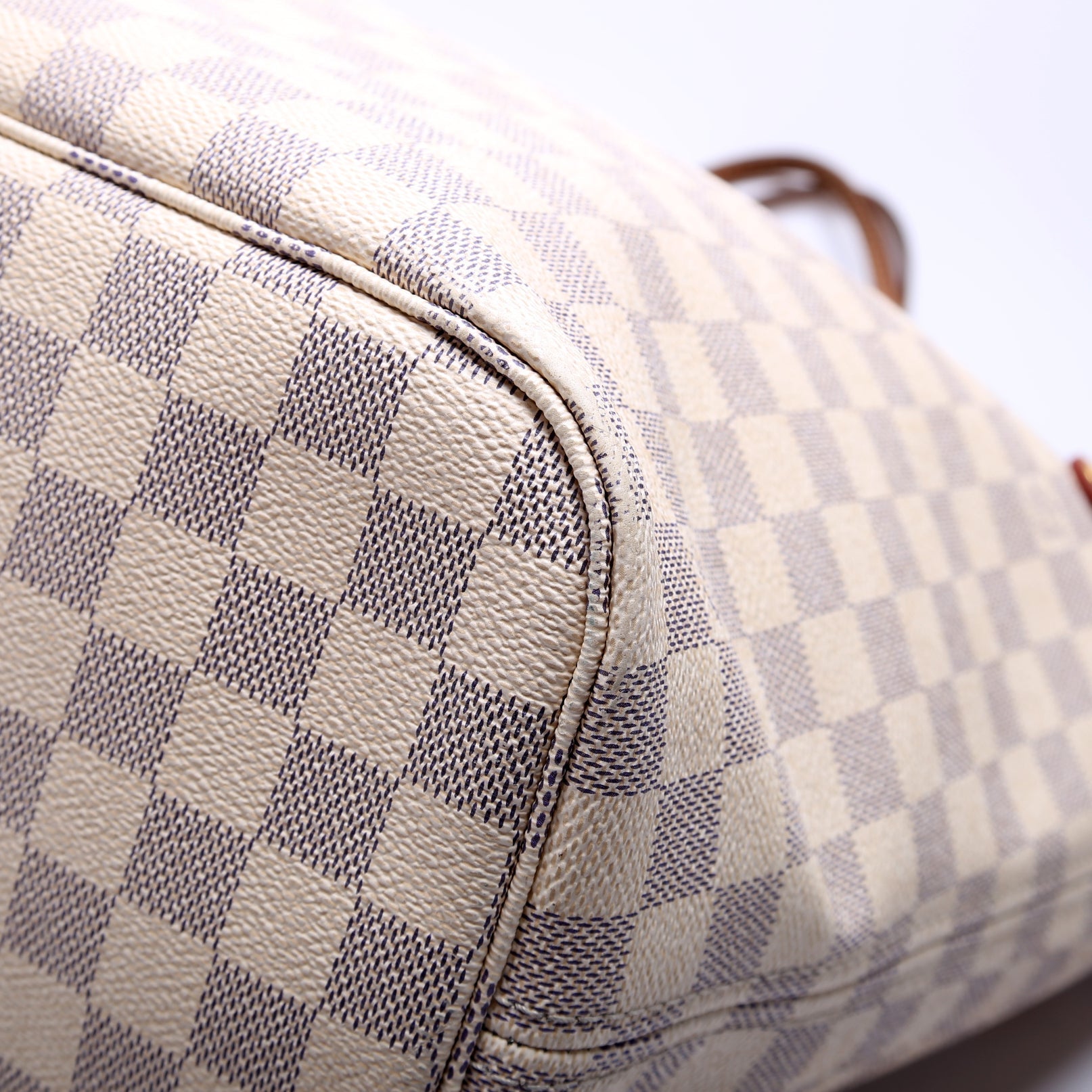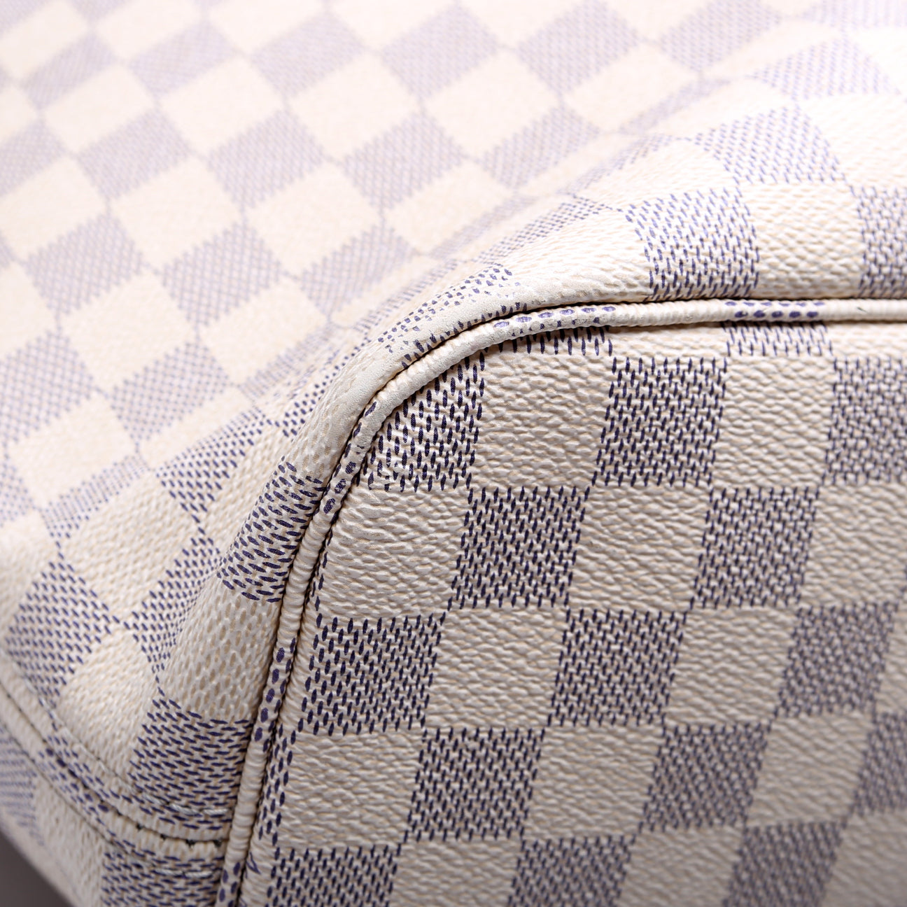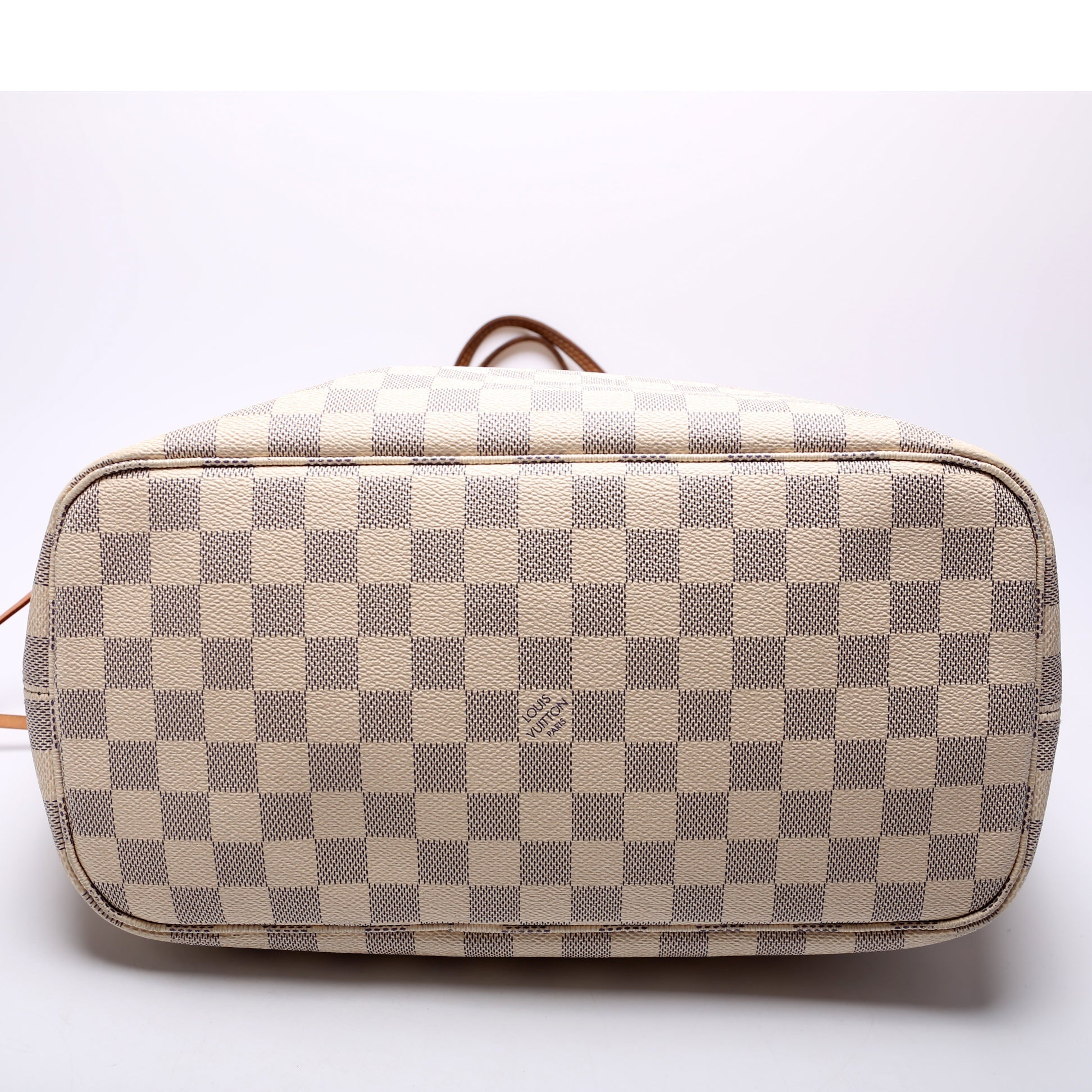 This Louis Vuitton Neverfull MM W/ Walletis eye catching bag. The exterior is in the classic Louis Vuitton Damier Azur coated canvas.