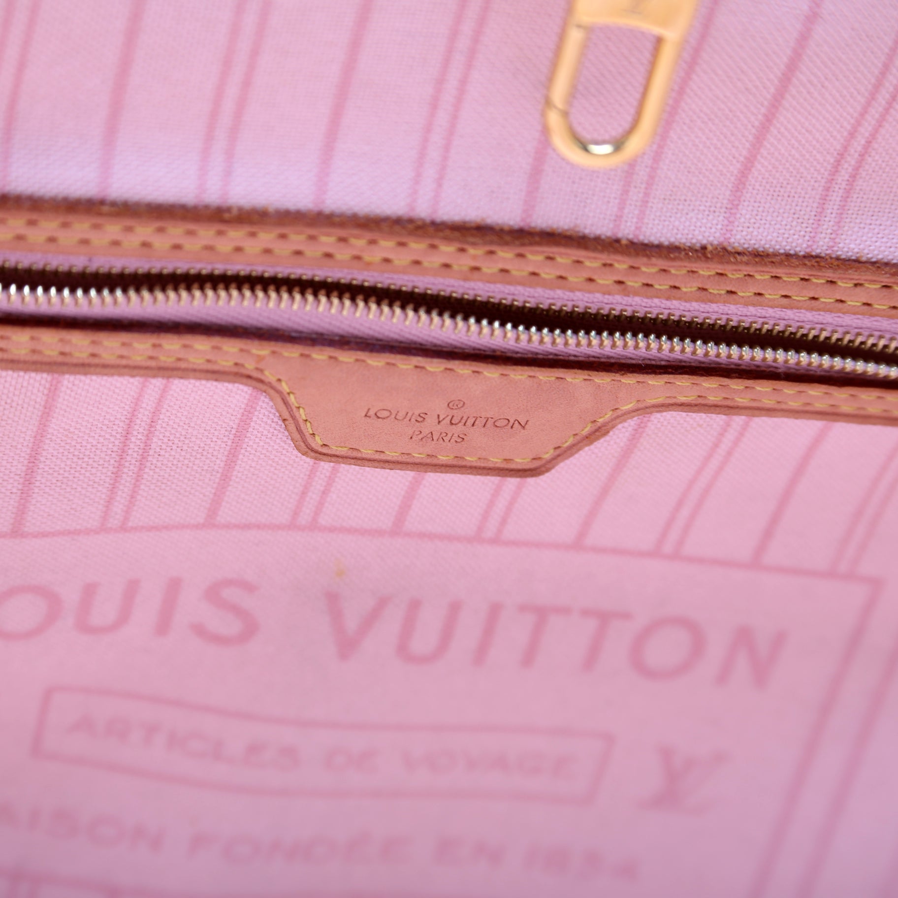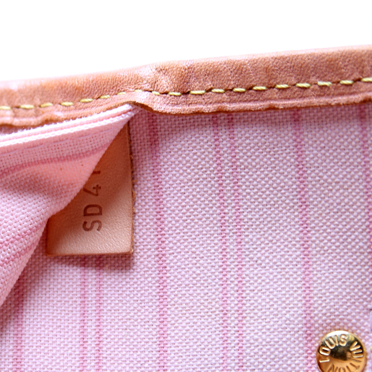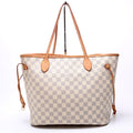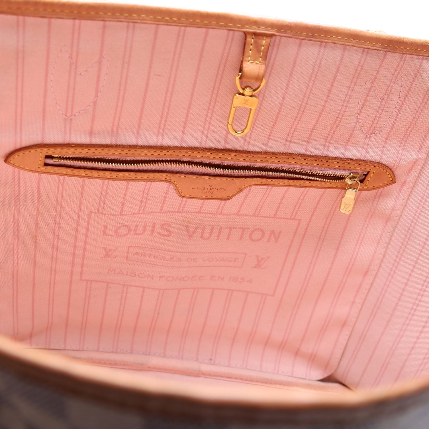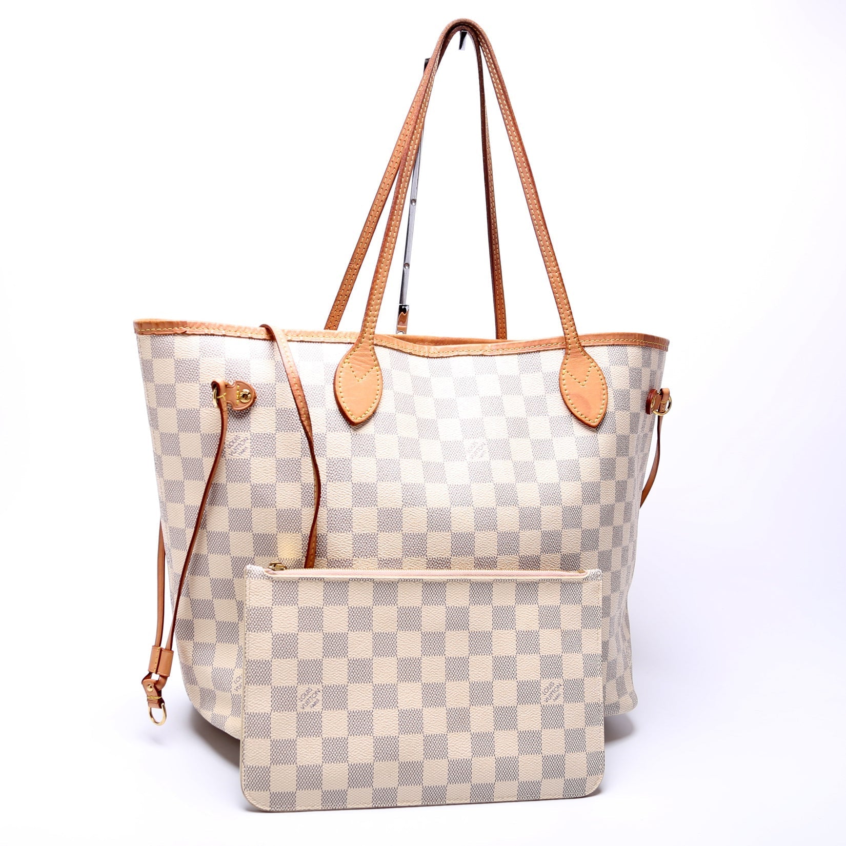 This Louis Vuitton Neverfull MM W/ Walletis eye catching bag. The exterior is in the classic Louis Vuitton Damier Azur coated canvas.