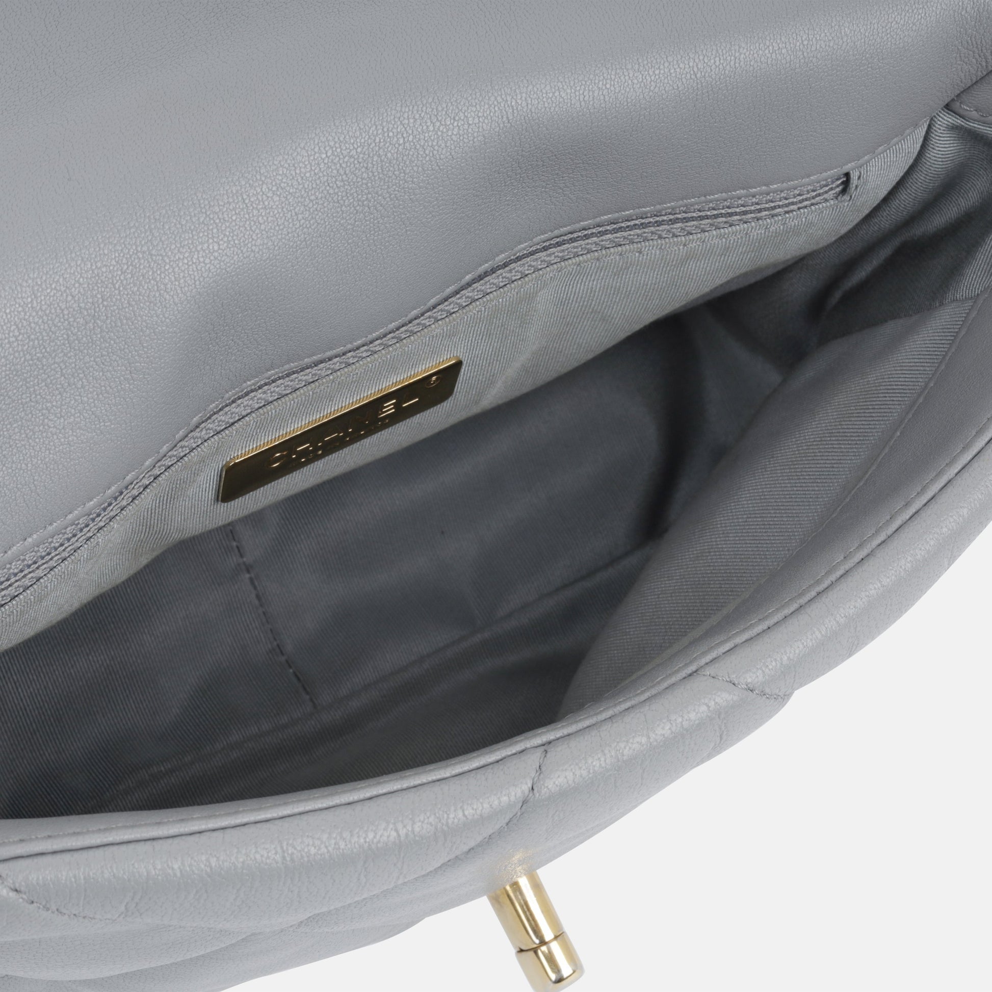 For timeless Parisian-chic there is no better investment than a Chanel flap bag. This particular Chanel 19 is crafted in their durable goatskin leather in a neutral grey colour. The chain sits elegantly on your shoulder or doubled up on your arm. Under the creative direction of Karl Lagerfeld, Chanel continues with its line of classic quilted bags.