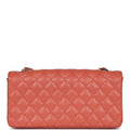 This Classic East West single flap Bag is in coral caviar leather with light gold hardware, featuring signature quilt leather, front CC turnlock closure, and a single interwoven leather and light gold tone chain link shoulder/crossbody strap.