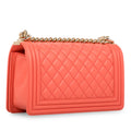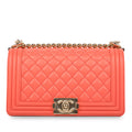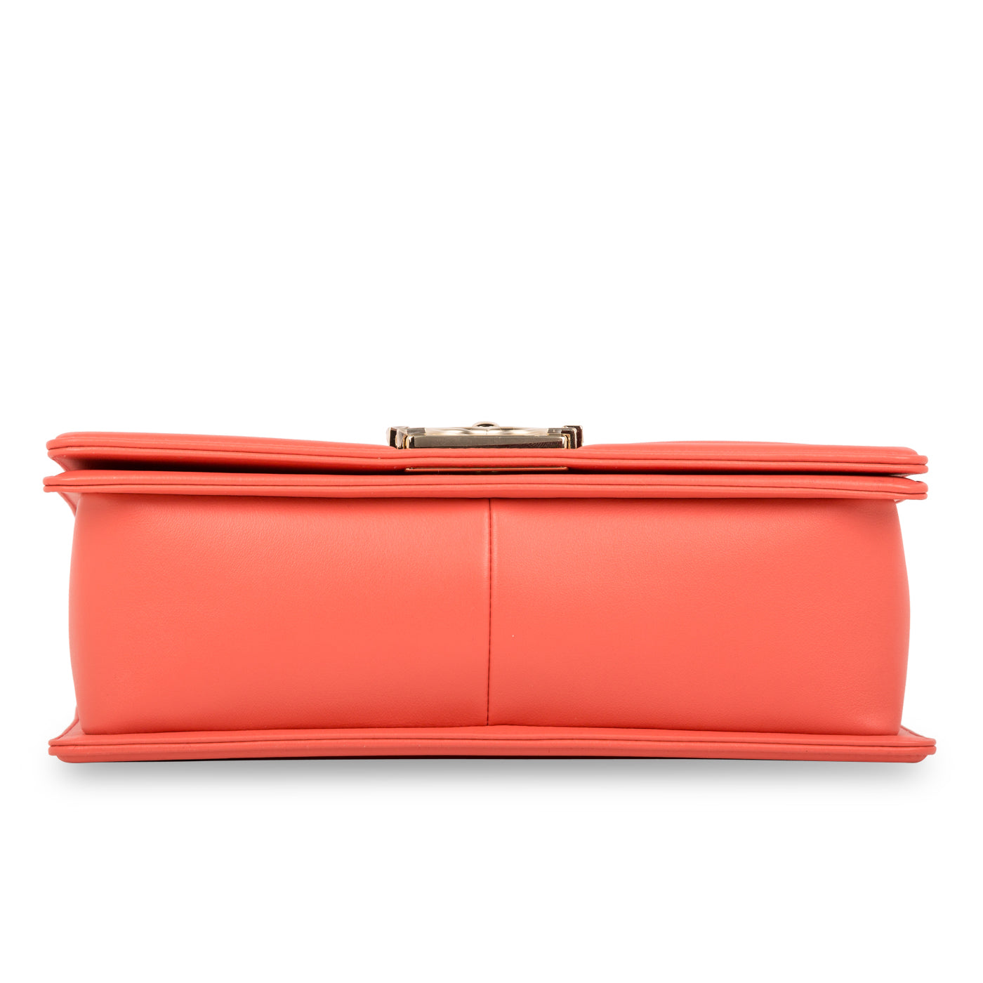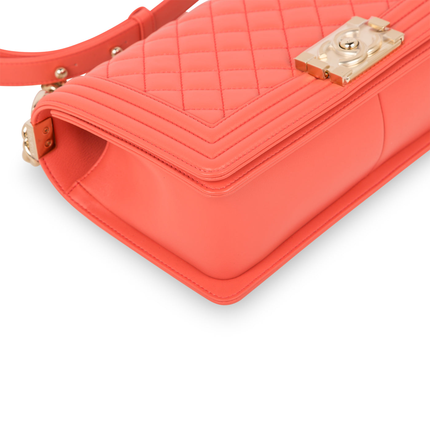Chanel presents one of its highly-acclaimed and most sought after bags, the Chanel Boy Bag in Medium in a beautiful seasonal combination of Coral Lambskin and Champagne Gold Hardware. As designed by Karl Lagerfeld, the Boy Bag collection was established to embody boyish charm and femininity. This magnificent handbag is crafted from quilted caviar leather. Its charm is only fortified through the delicate punctuation of ruthenium hardware from the chain-link strap to the signature CC push lock. Its interior features fabulous fabric lining and a single storage compartment, not to mention a subtle slip pocket.