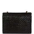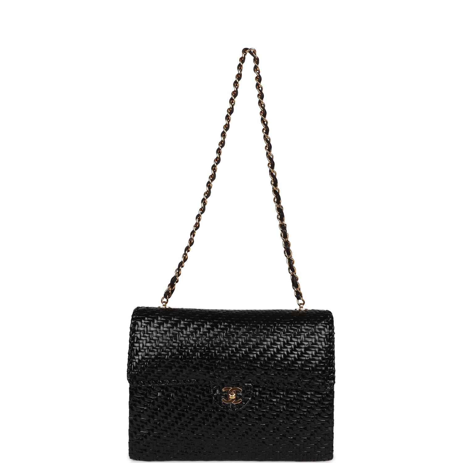This New flap bag is in Black woven rattan wicker with gold hardware, featuring a front flap with CC turnlock closure, and an interwoven gold plated chain link and black leather shoulder/crossbody strap.