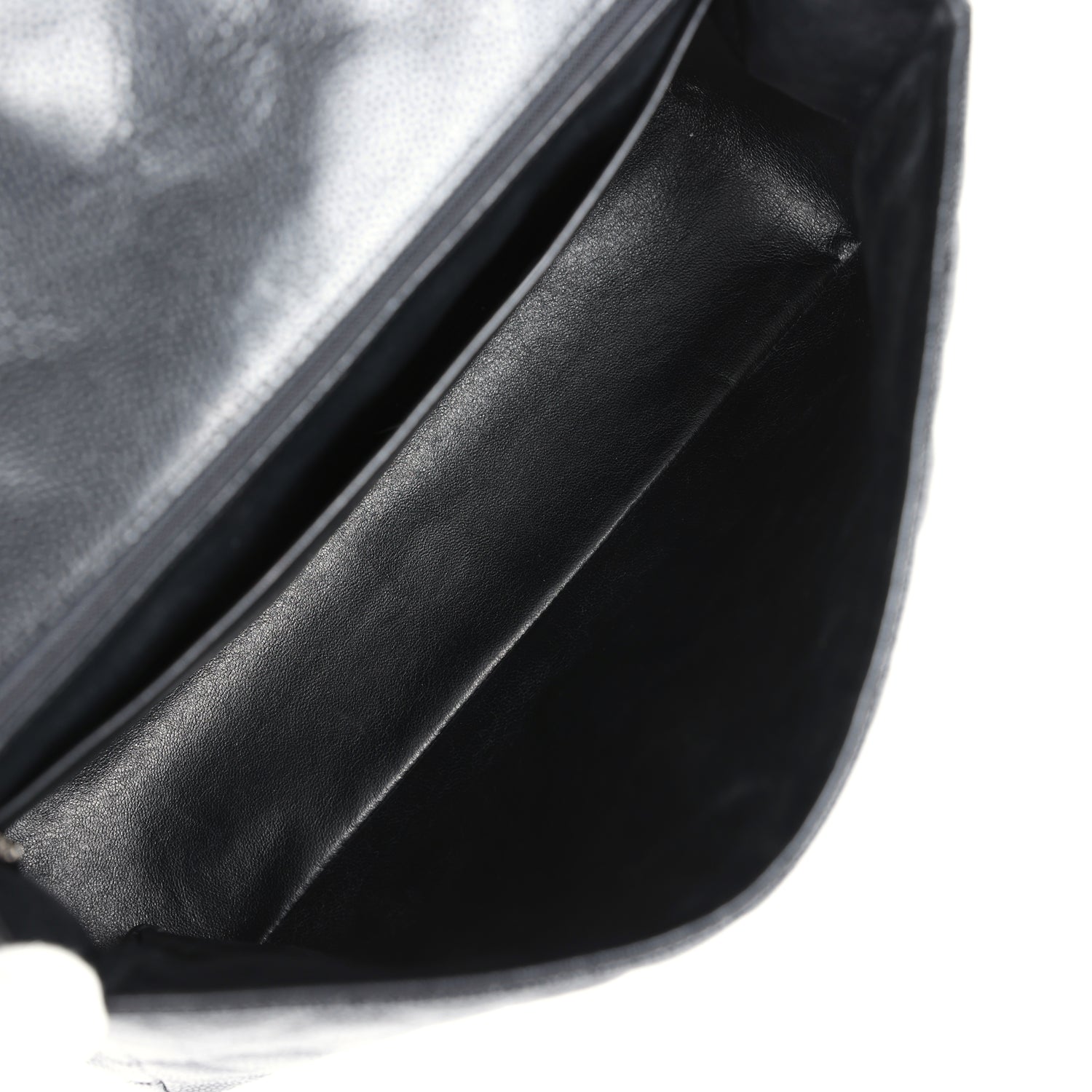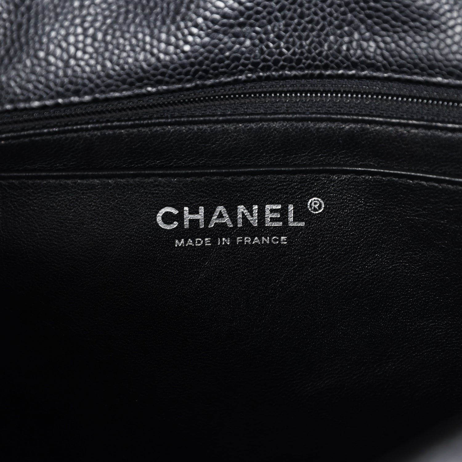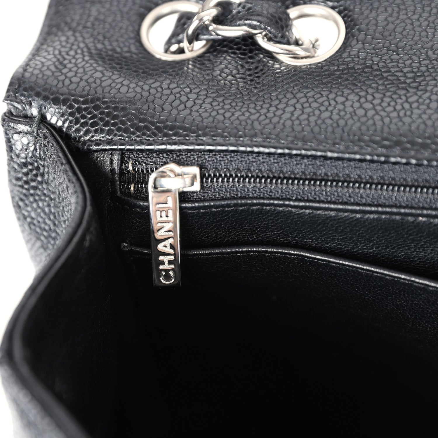 This Chanel Jumbo Classic Single Flap bag is in black caviar leather with silver tone hardware and features a front flap with signature CC turnlock closure, half moon back pocket, and adjustable interwoven silver tone chainlink and black leather shoulder strap.