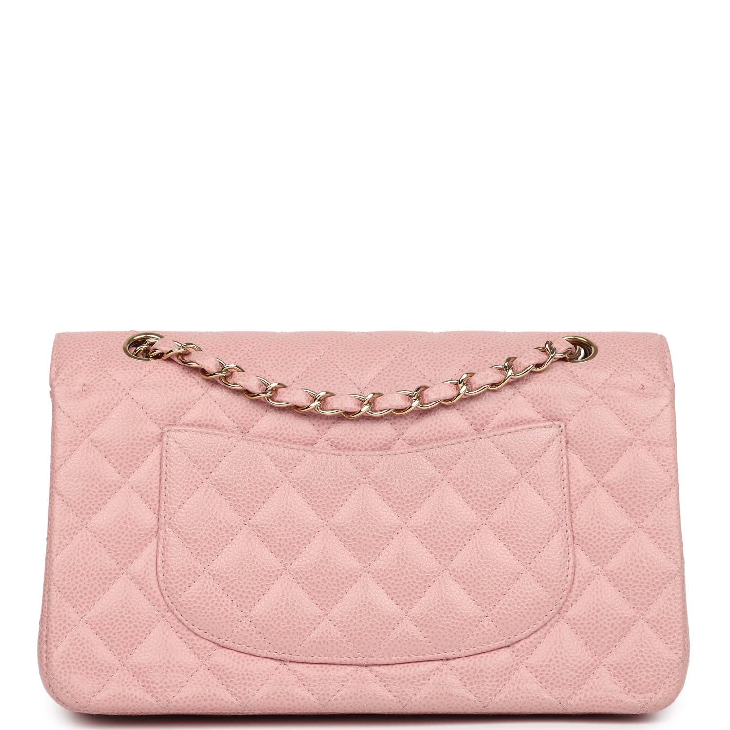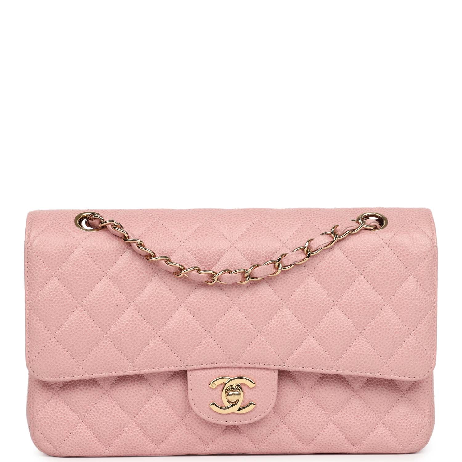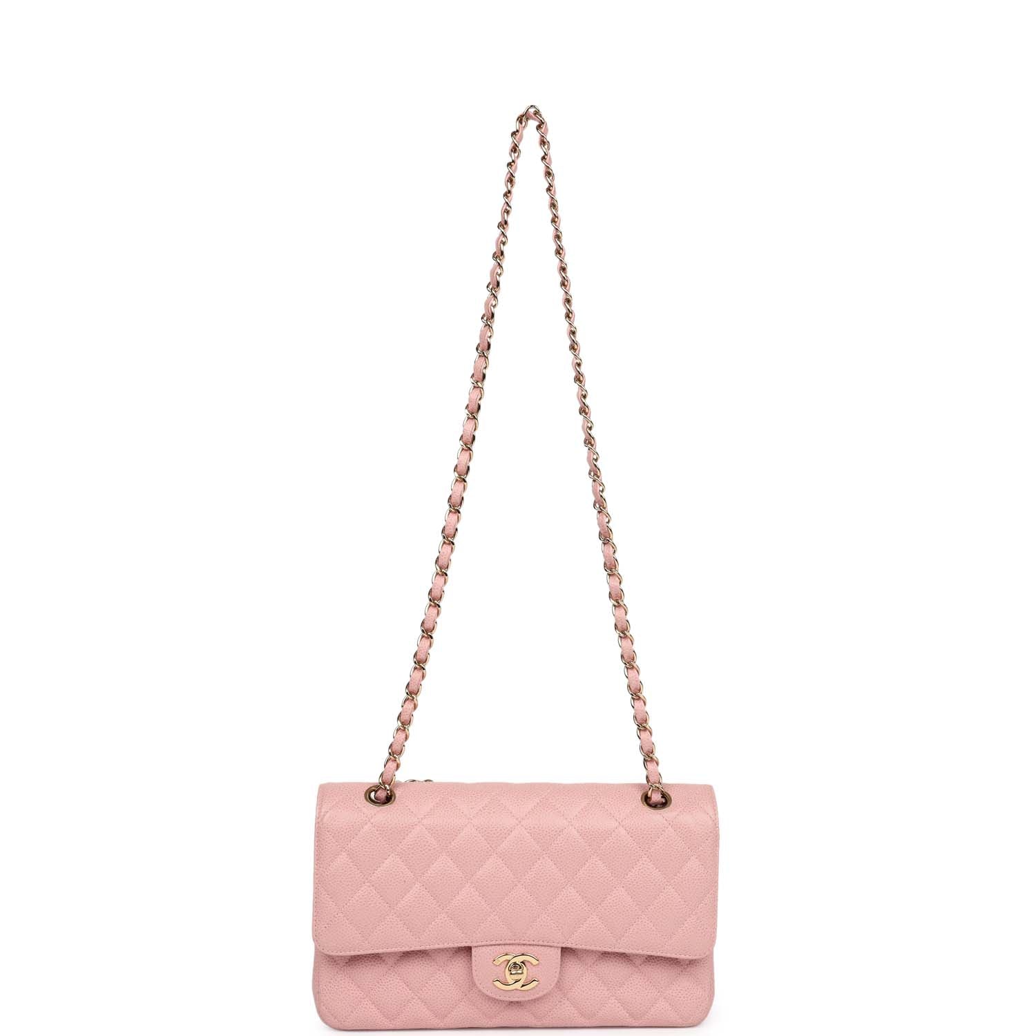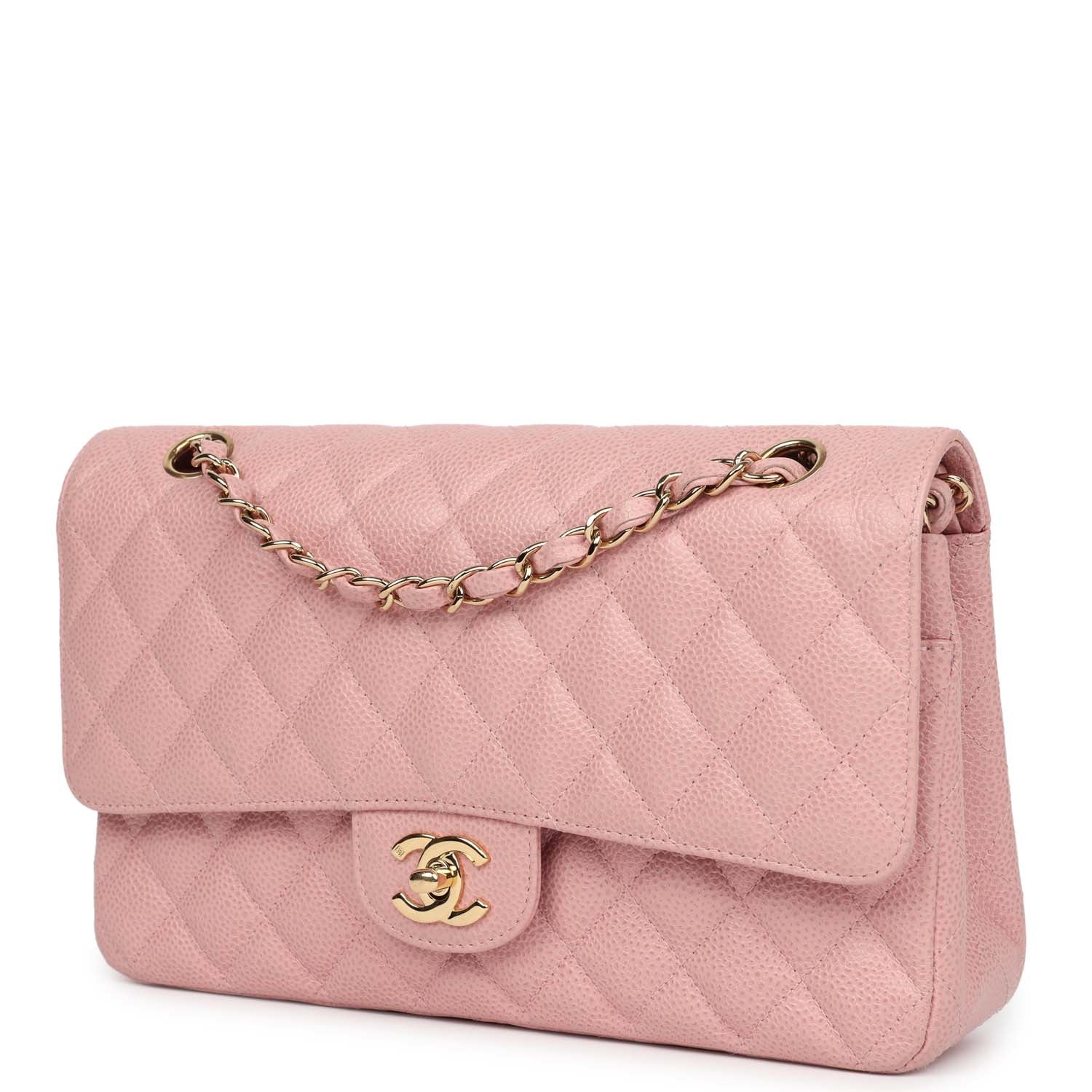 This New Medium Classic Double Flap Bag is in pink caviar leather with gold hardware, front flap with CC turnlock closure, tonal stitching, half moon back pocket and an adjustable interwoven gold chain link and Pink leather shoulder/crossbody strap.