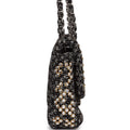 This Single Flap is in Black and White tweed embellished with white crystals and has silver hardware. It has a front flap with signature CC turnlock closure and an interwoven tweed and silver tone chain link shoulder/crossbody strap.