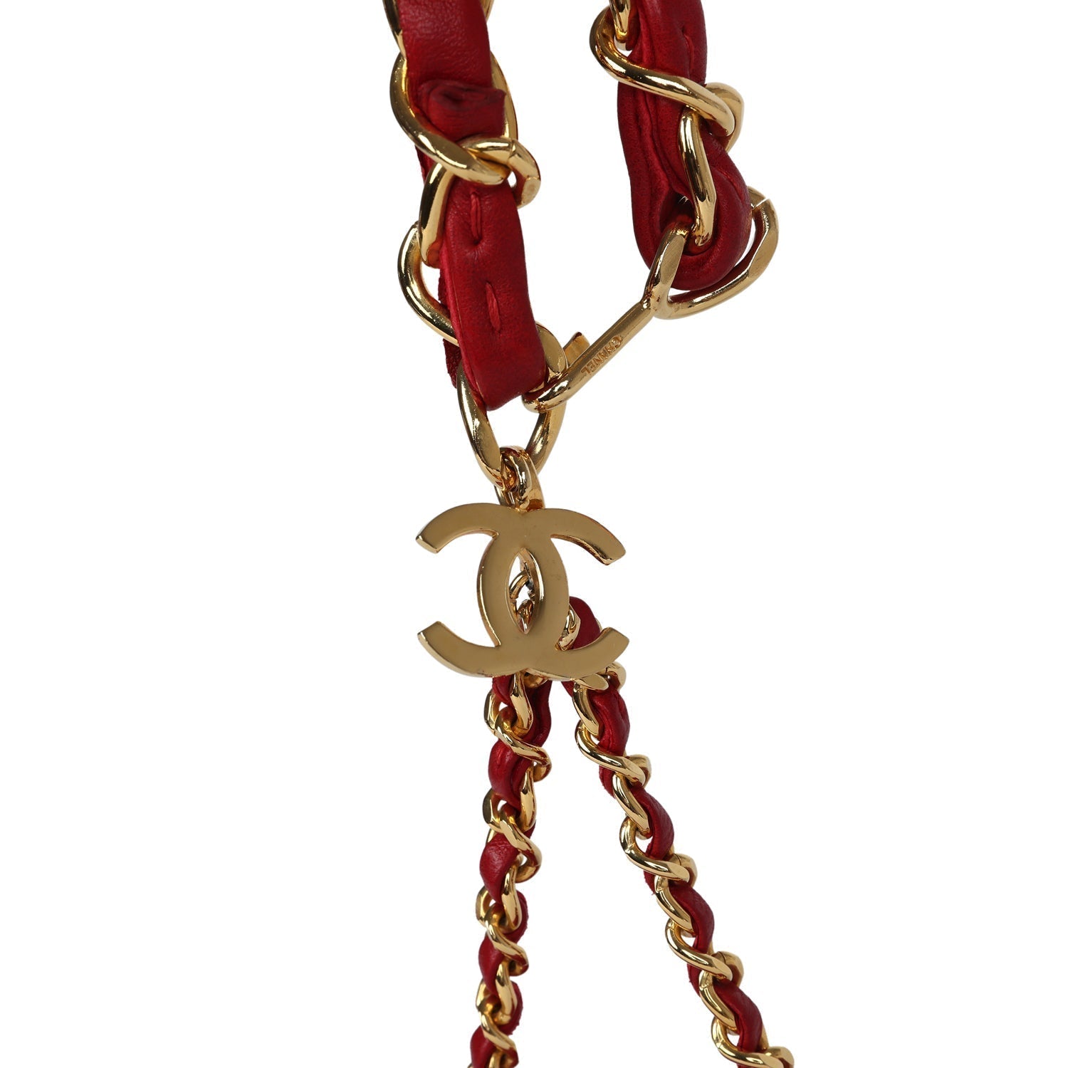 This New Micro Belt Flap Bag is in Red lambskin with gold hardware, signature CC interlocking front snap closure on front flap, a rear half moon pocket, and an interwoven gold plated chain link and red leather handle that can be hooked onto an adjustable interwoven gold plated chain link and red leather waist strap.