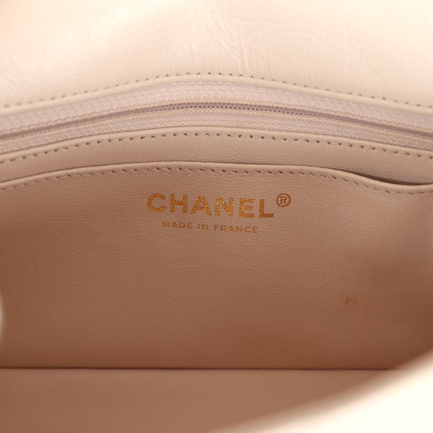 The interior is lined in beige leather with one zip pocket and one slip pocket on the back wall.