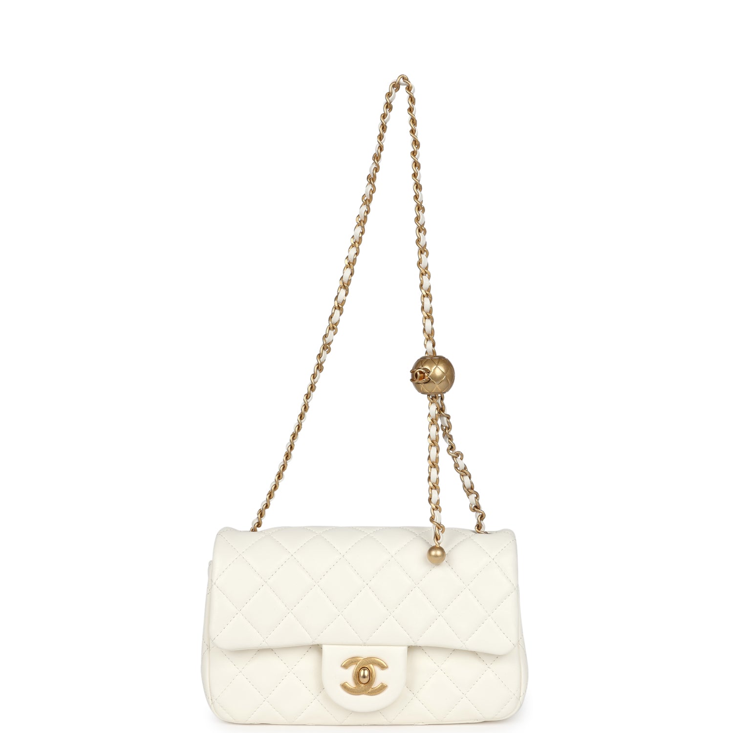 This Chanel Mini Square Pearl Crush Flap Bag is of white lambskin leather with antique gold tone hardware. It has a front flap with signature CC turnlock closure, tonal stitching, rear half moon pocket, single interwoven white leather and antique gold tone chain link shoulder/crossbody strap with adjustable chainlink "pearl" ball stopper.