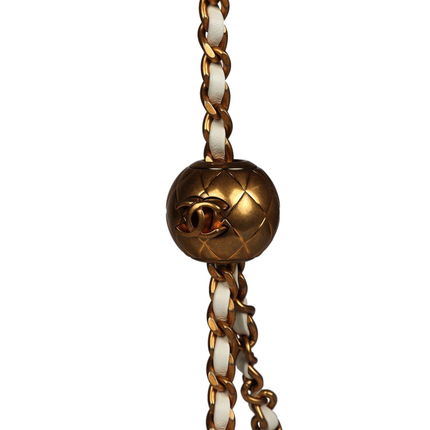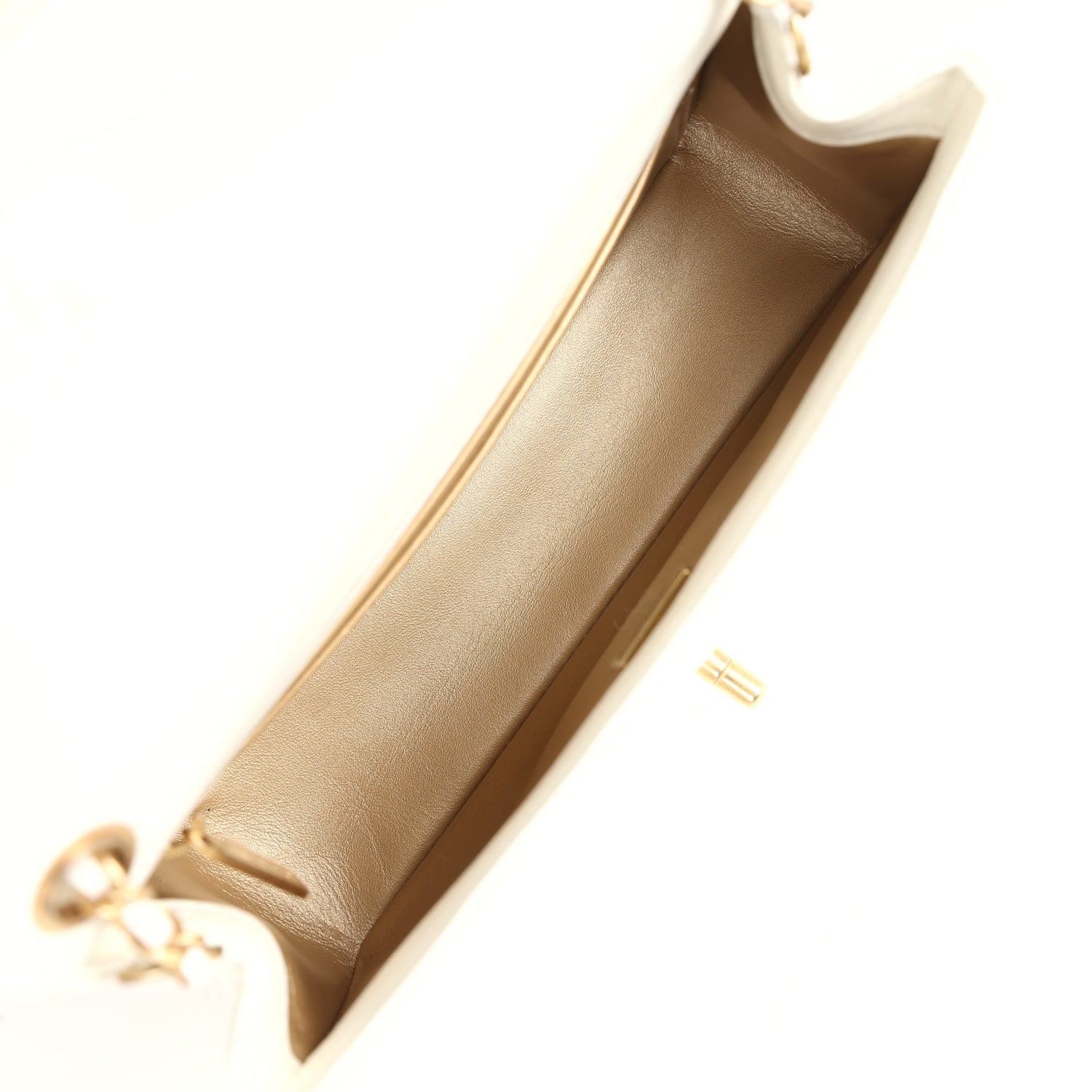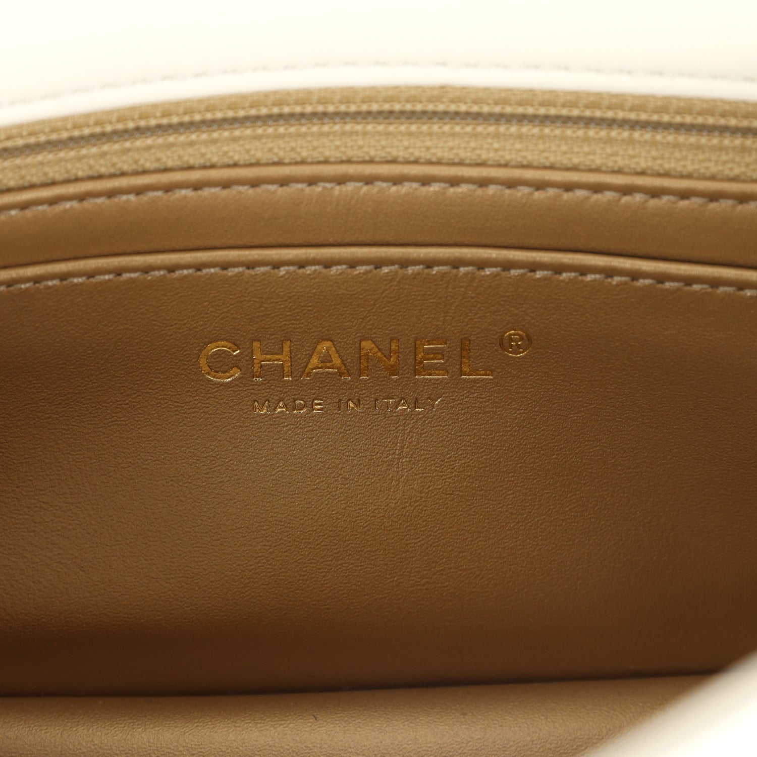 The interior is lined in gold metallic lambskin leather and features a zipper pocket with Chanel pull and an open pocket below.