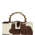 This New Rectangular Vanity Box is in brown and white cow print pony hair with antique gold hardware, featuring contrast stitching, brown and white cow print pony hair, a pull tab snap closure and a single interwoven antique gold chainlink and pony hair top handle.