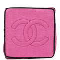 This New Chanel set of two Mini Bucket Bag and Oval Handbag is of pink and black raffia fabric with gold hardware, featuring contrast stitching for both bags, black grossgrain fabric trim on the bucket bag, signature CC logo stitched on the bottom of the bucket bag, a drawstring closure, and a single Interwoven black fabric and gold hardware shoulder strap.