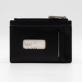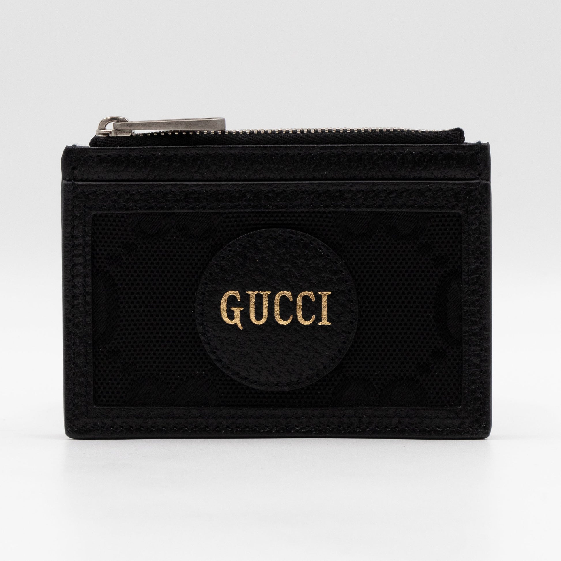 This is a Gucci card case from the Off The Grid collection. Made with black regenerated nylon and black leather. On the front is a leather detail with Gucci script logo. Card case has space for several cards and a zipper coin pocket.
