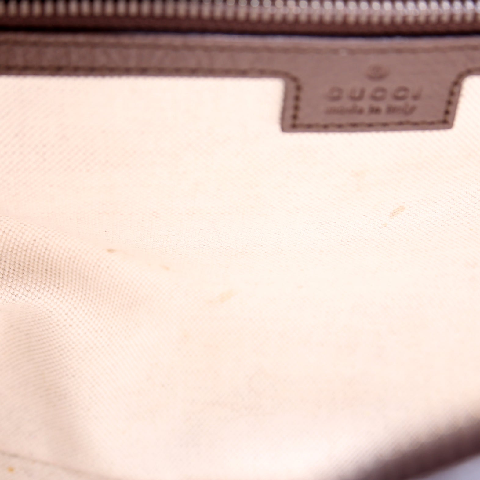 Interior: The interior has light stains. The interior features one zipper pocket.