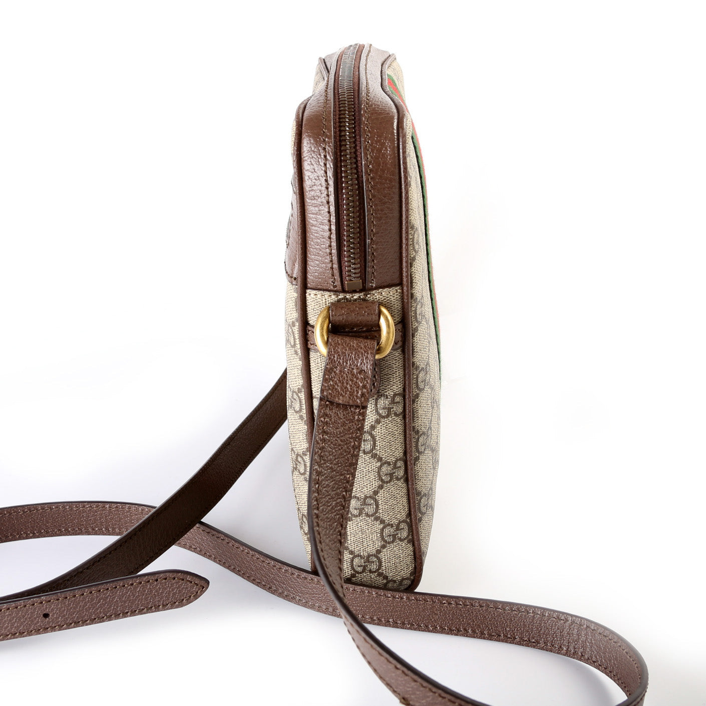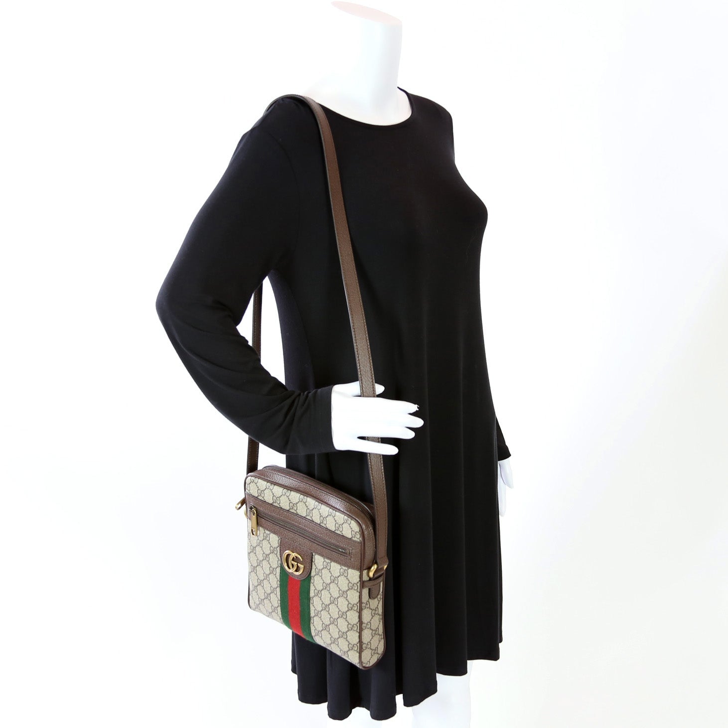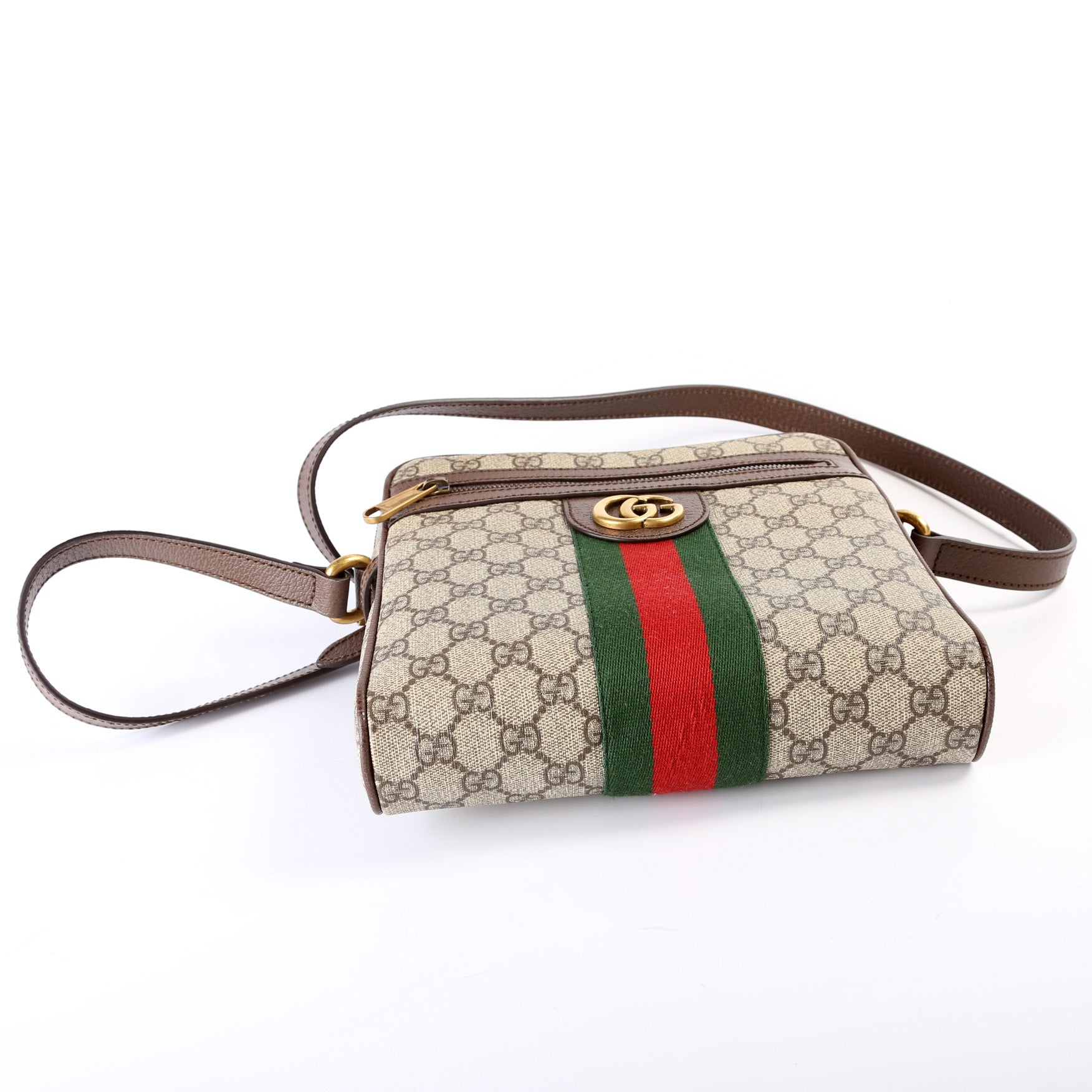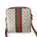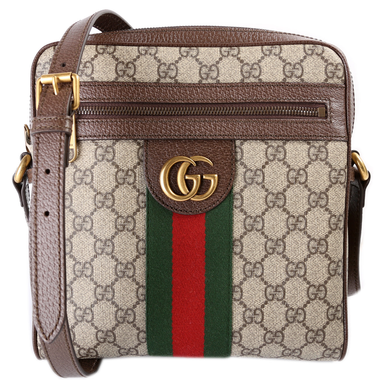 This Gucci Ophidia Messengeris eye catching bag. The exterior is in the classic Gucci GG Supreme coated canvas.