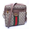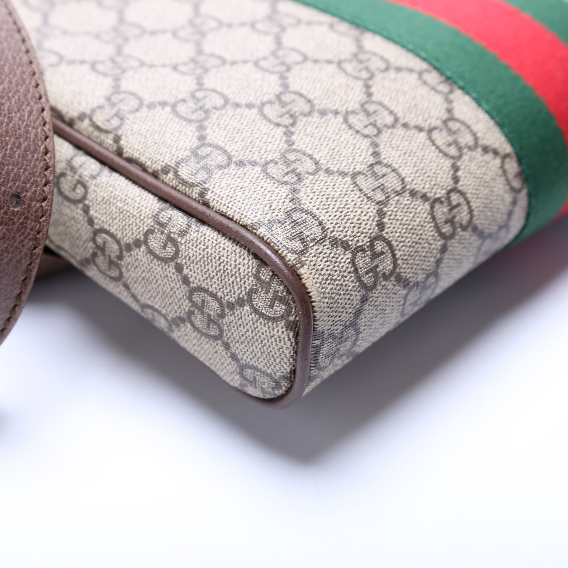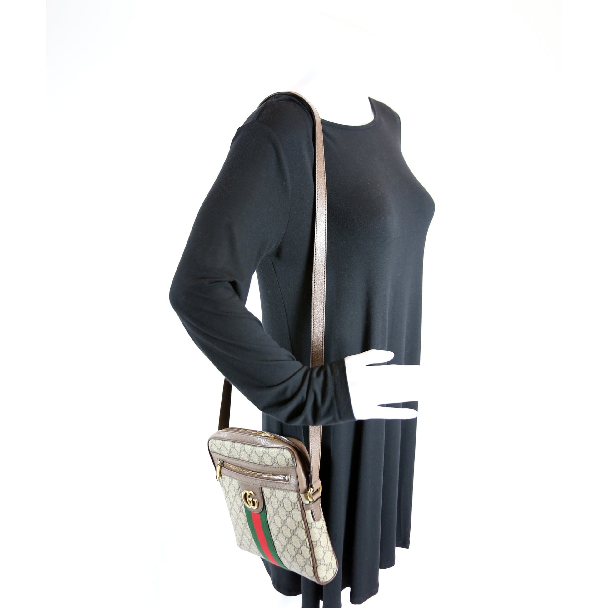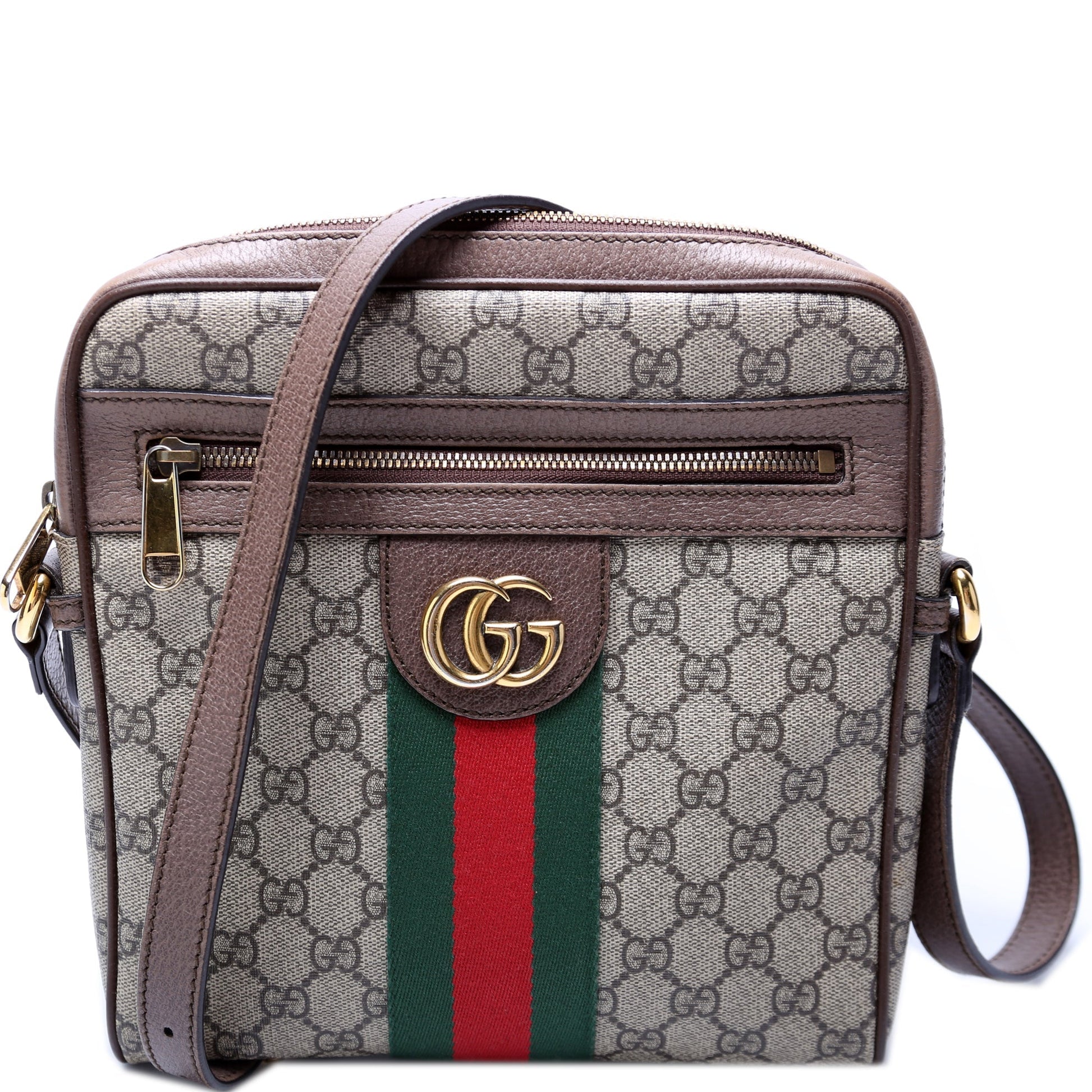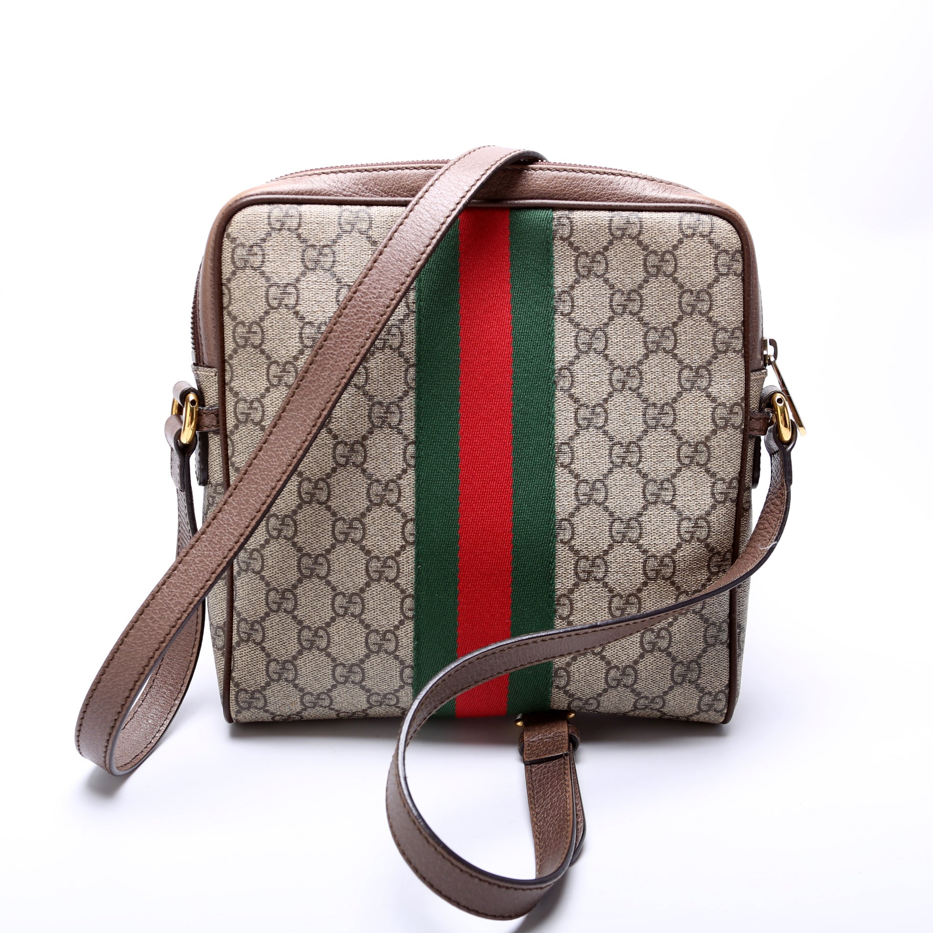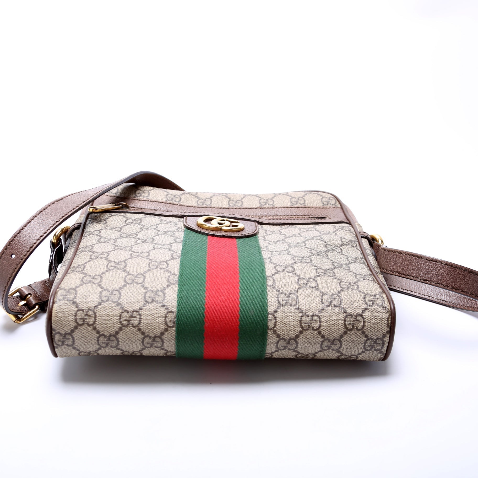 This Gucci Ophidia Messengeris eye catching bag. The exterior is in the classic Gucci GG Supreme coated canvas.