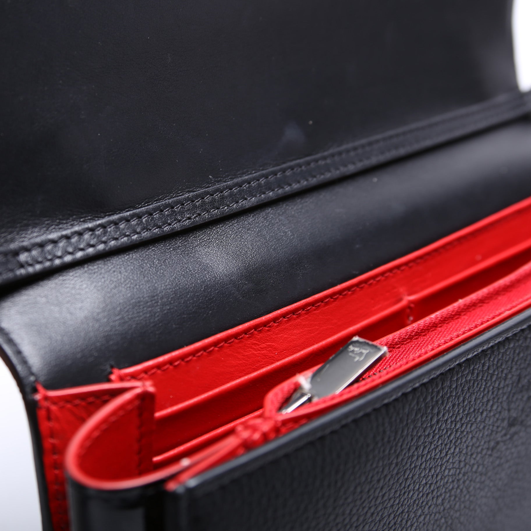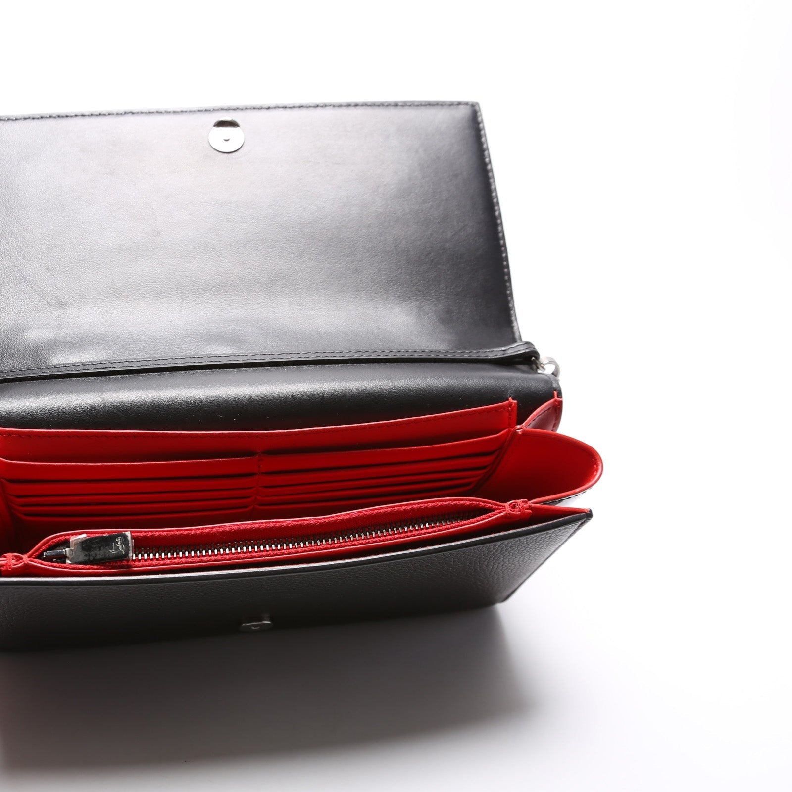 Interior: The interior shows light wear throughout. The interior features ten card slots, two open pockets, and one zipper pocket.