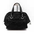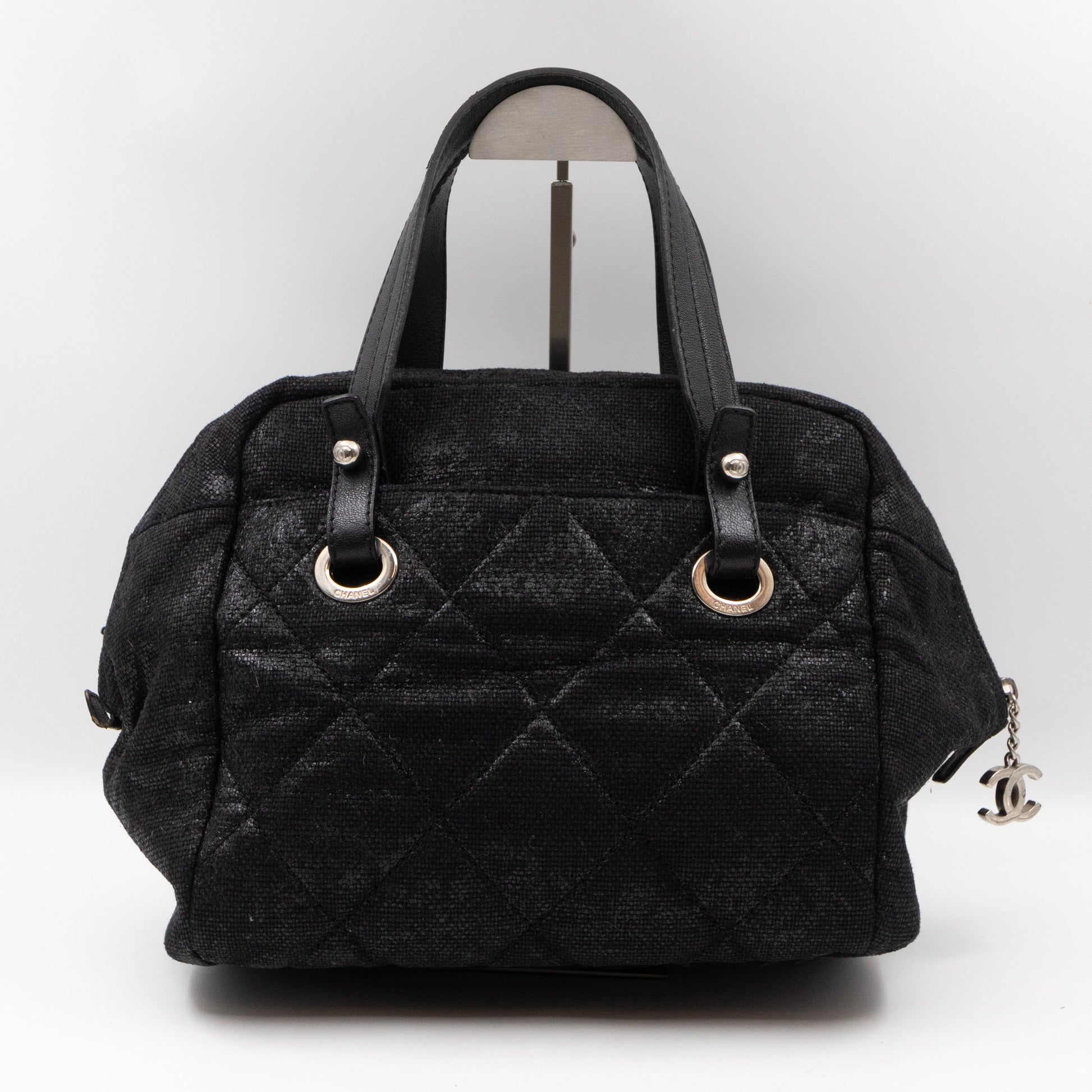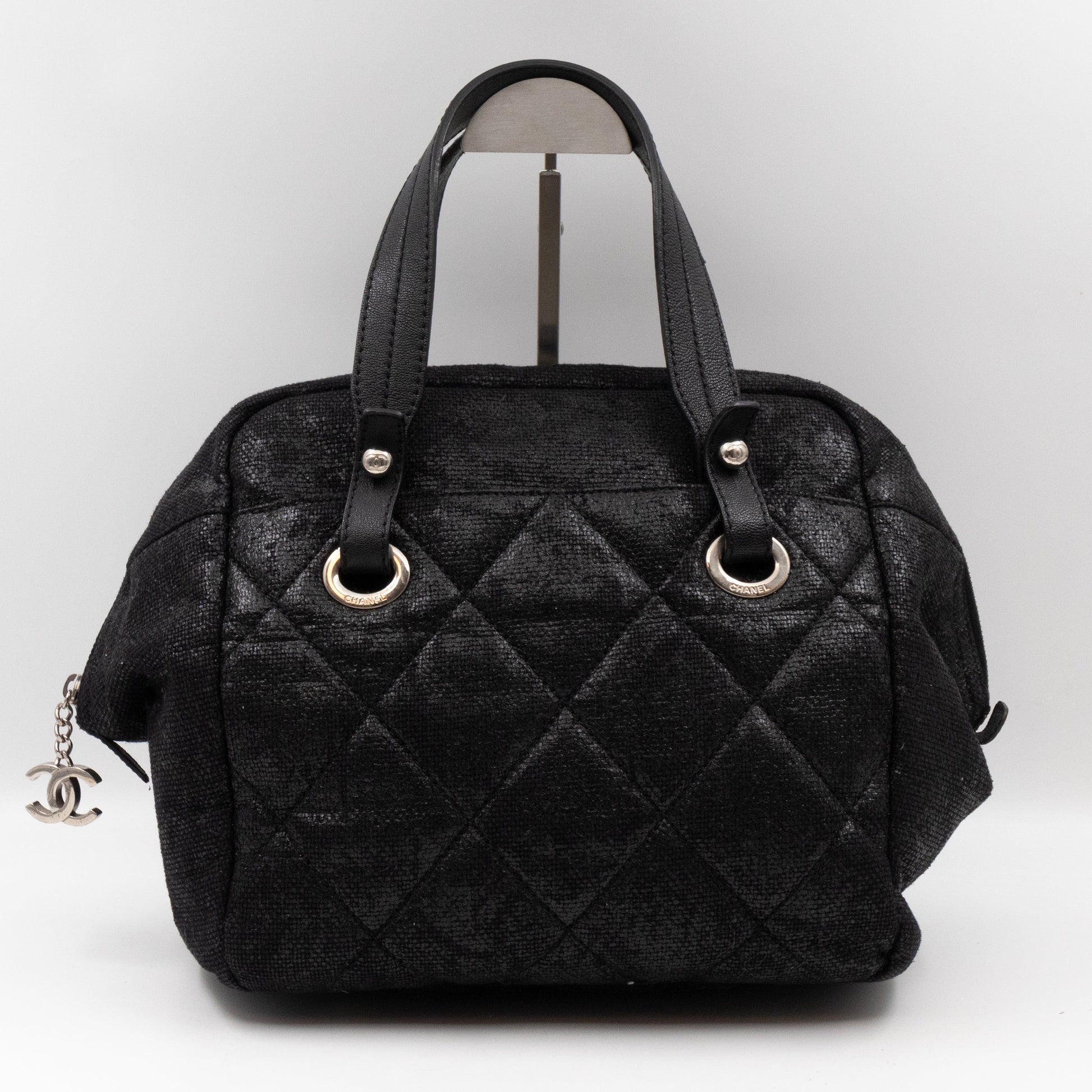 This is a Chanel black coated canvas Paris Biarritz Bowler bag. Crafted from black quilted coated canvas, with dual flat top handles, silver-tone hardware, and top zip closure finished with the signature interlocking CC charm. With slip pockets to the front and back, and four protective metal feet on the bottom.
