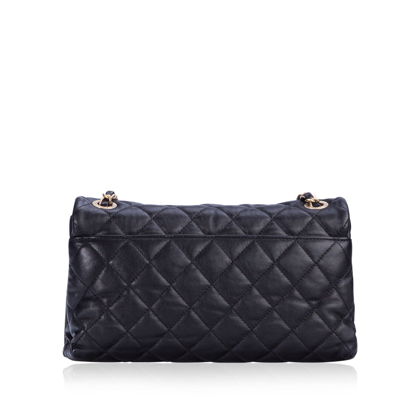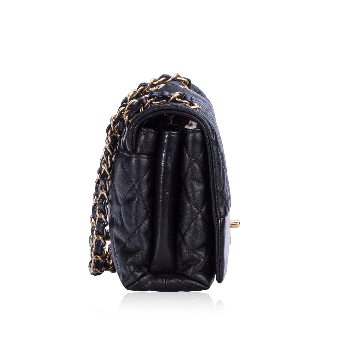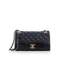 This flap bag from French fashion house Chanel is a rare find, having been shown at their runway collection for Paris in Rome. It features the signature quilted lambskin, contrasted against a smooth patent panel on the front flap. In classic black it can be worn throughout the year, and the gold tone hardware is the iconic choice to make to stand out from the crowd. A true investment piece.