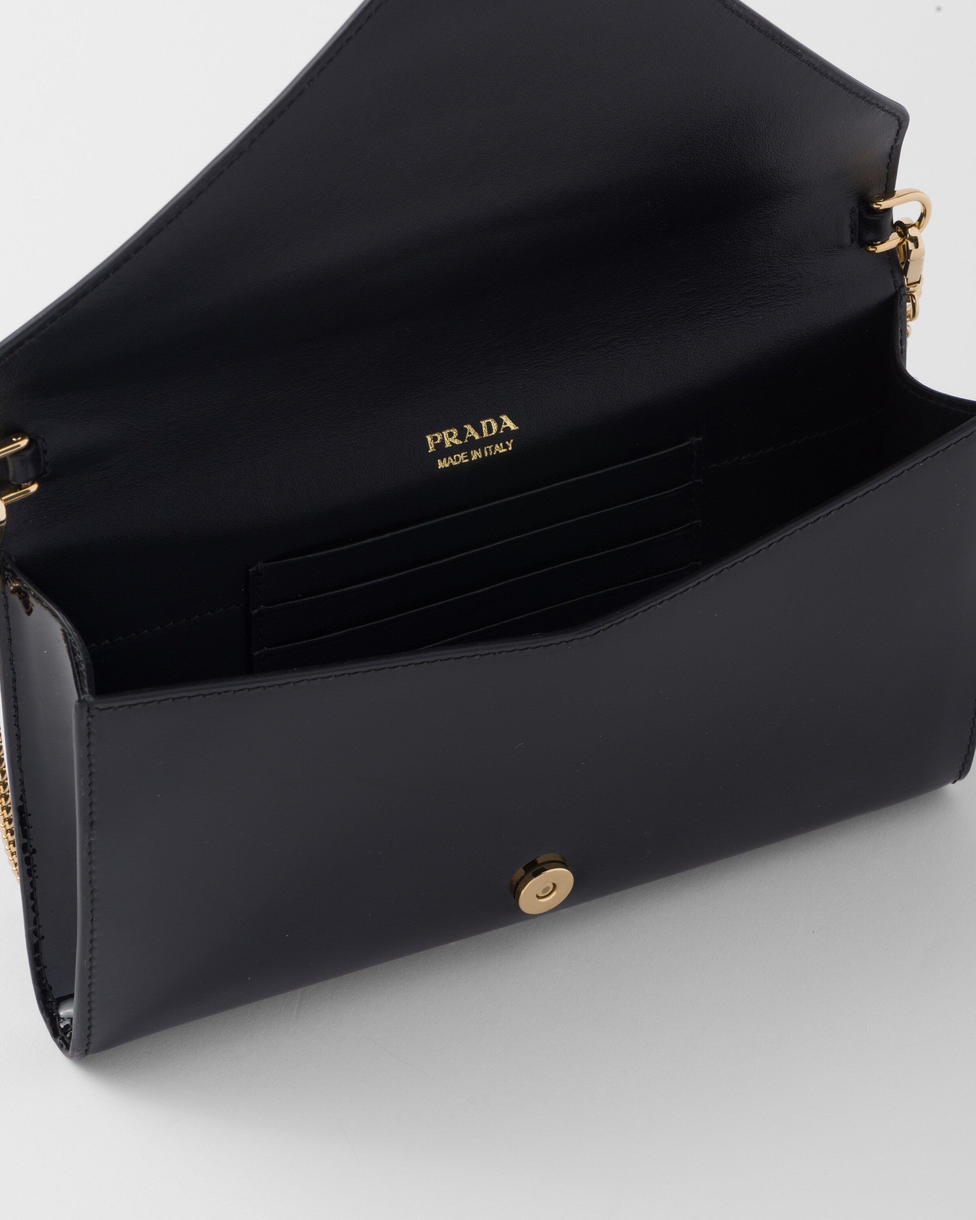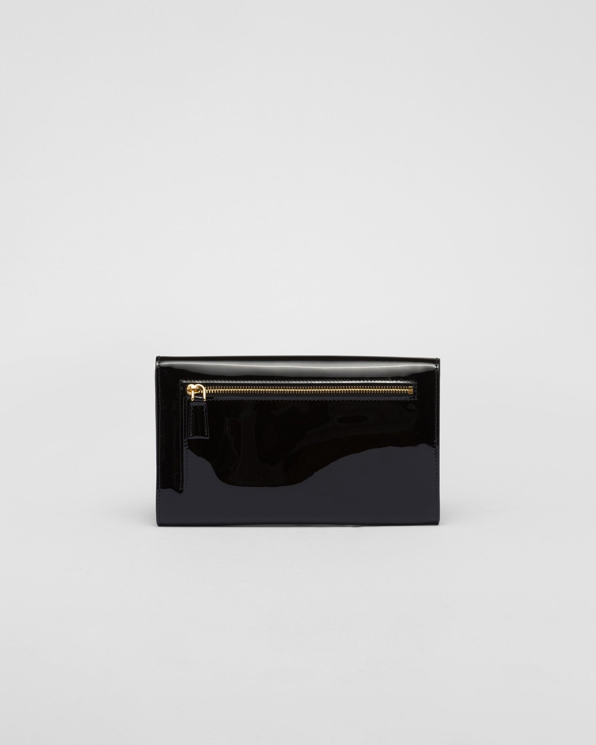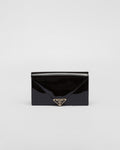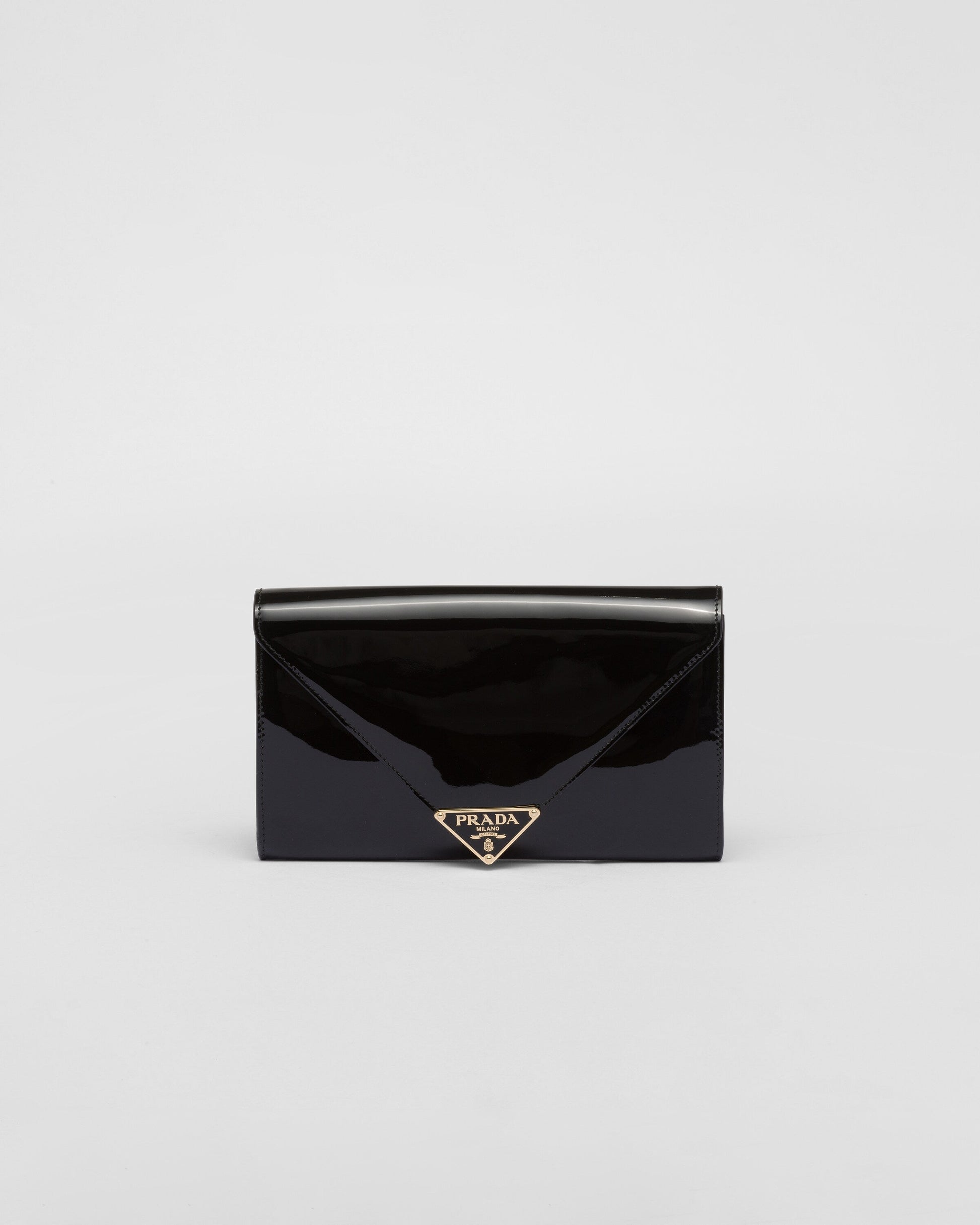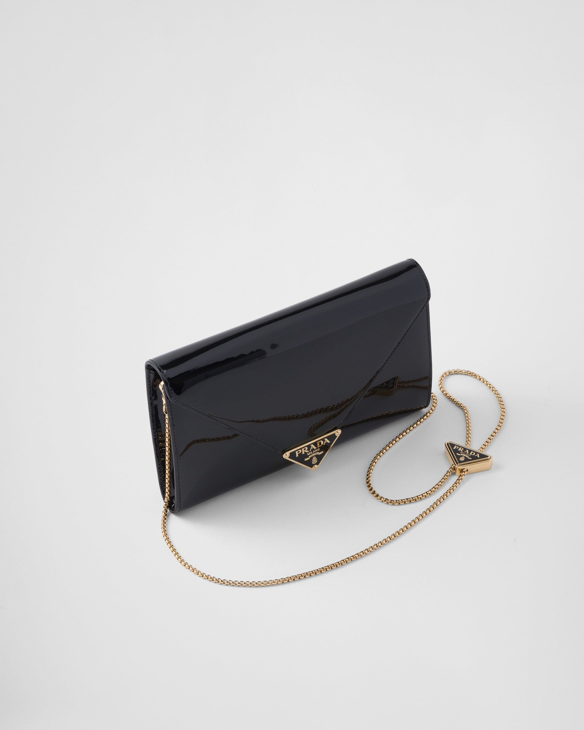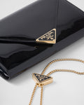 The elegant silhouette of this mini bag is enhanced by the glossy finish of patent leather that brings the accessory to life with a contemporary touch. The accessory with removable chain shoulder strap and nappa leather interior with card slots is brightened by the metal hardware. The iconic triangle logo applied to the magnetic clasp adds its iconic signature touch.