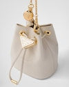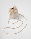 This precious and sophisticated patent leather mini-pouch plays with elegant, shiny details. The accessory, which comes with a removable chain shoulder strap, is decorated with the enameled metal triangle logo that accents the drawstring closure