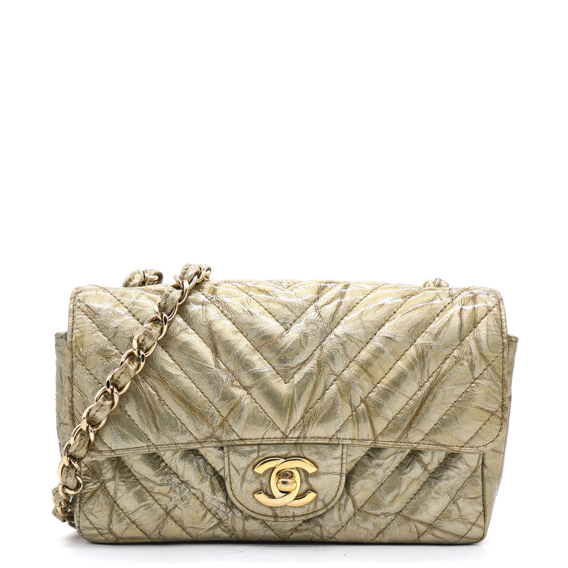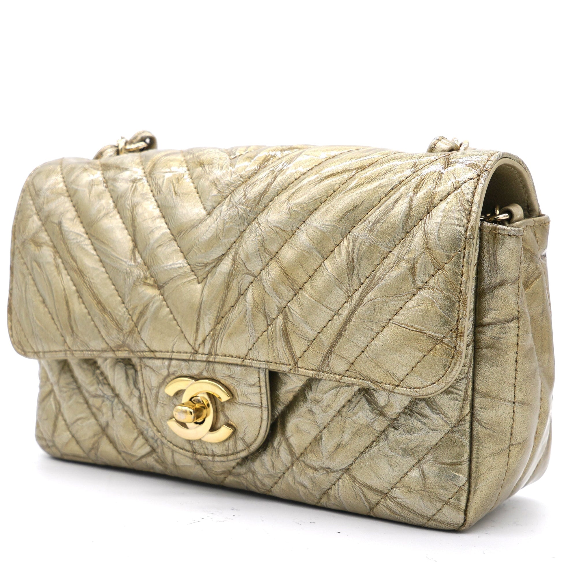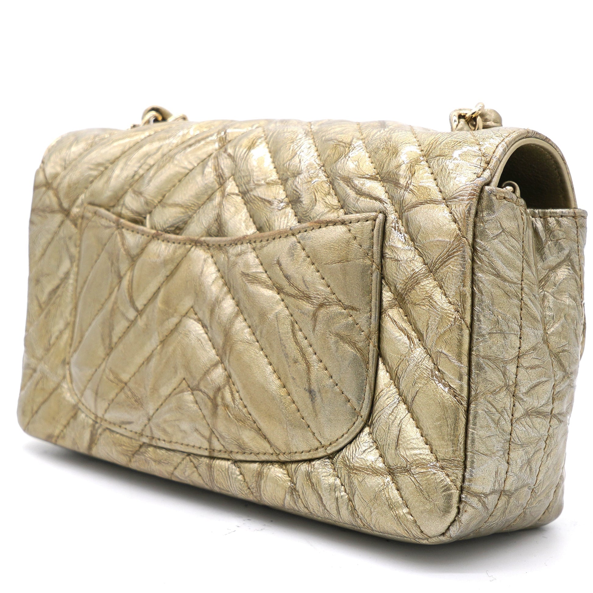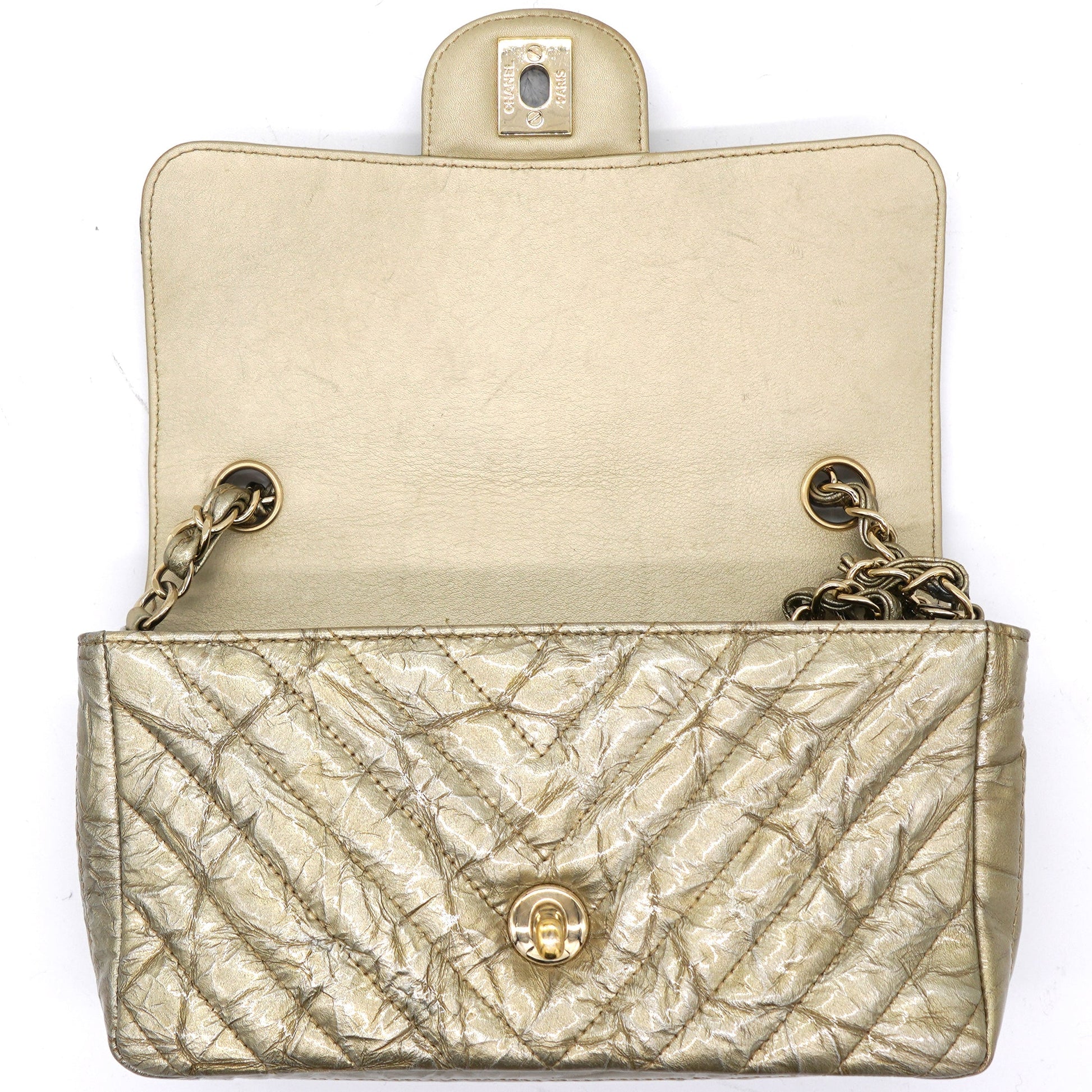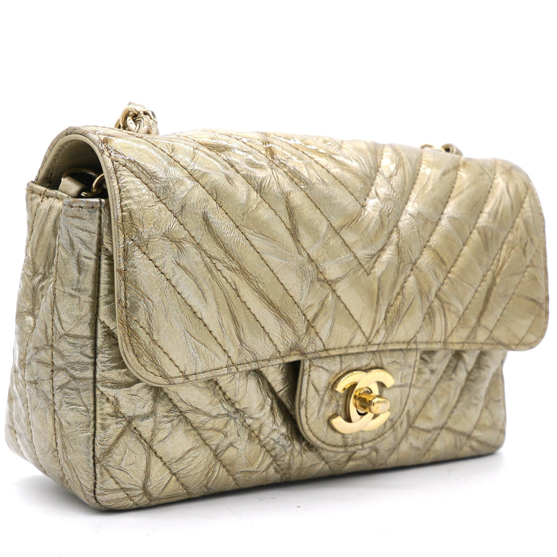 Chanel Patent Metallic Crumpled Calfskin Chevron Quilted Mini Rectangular Flap Gold