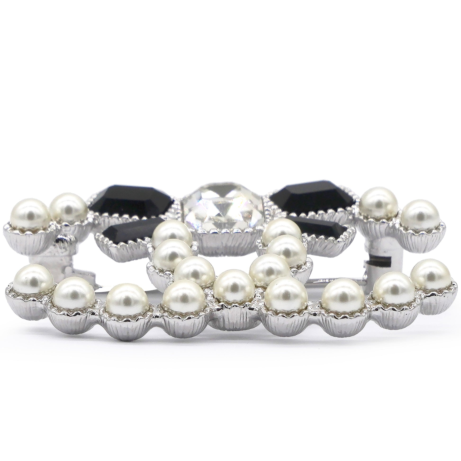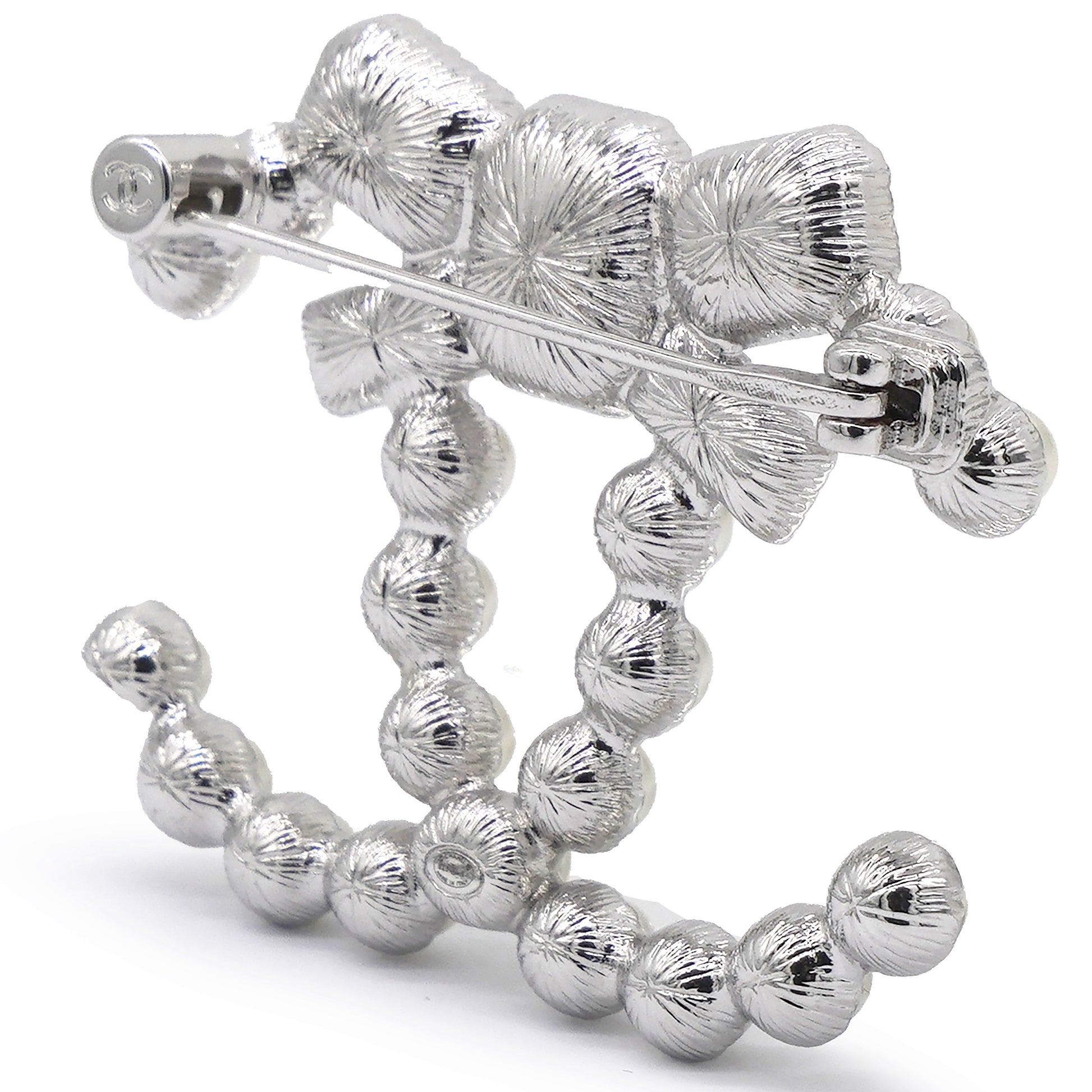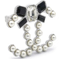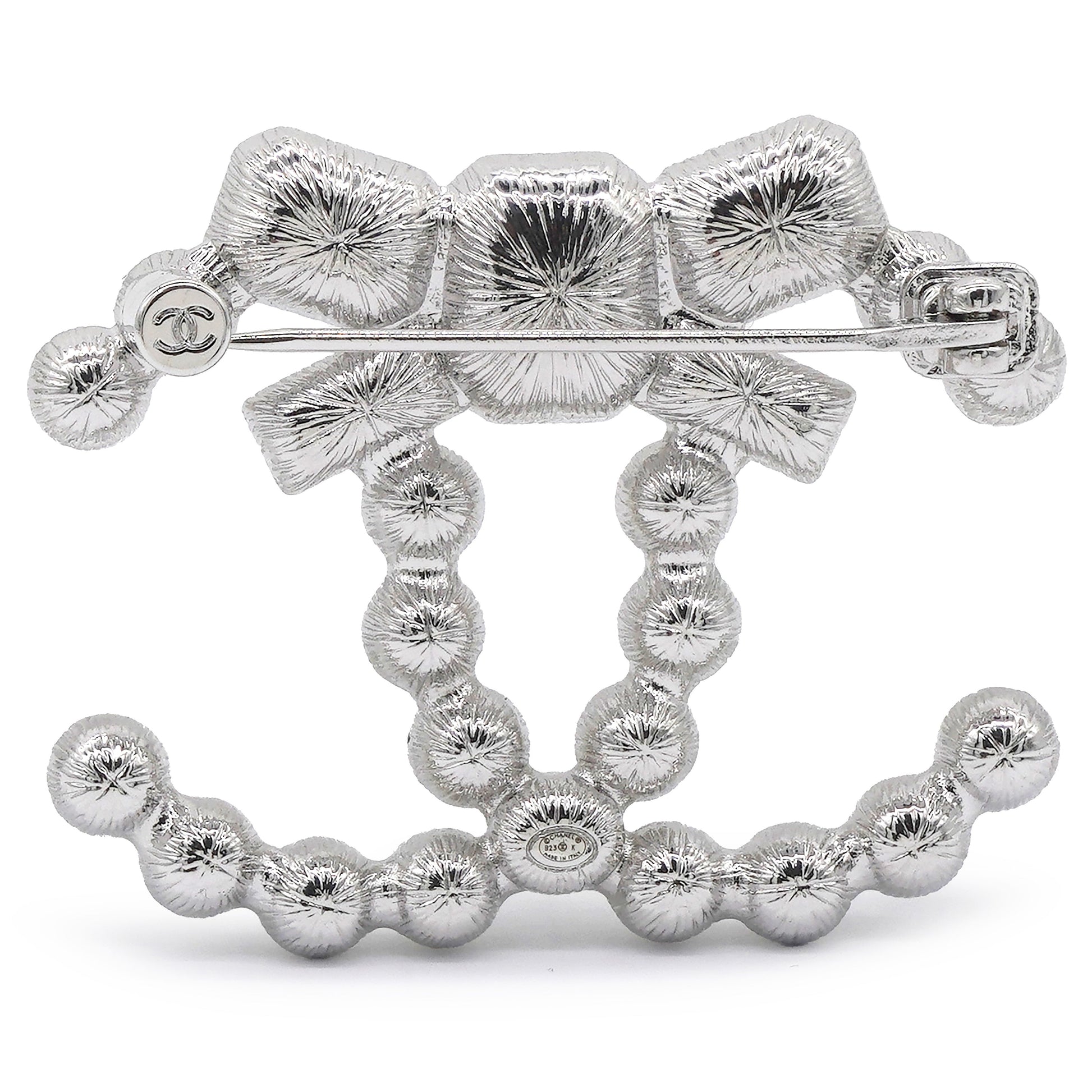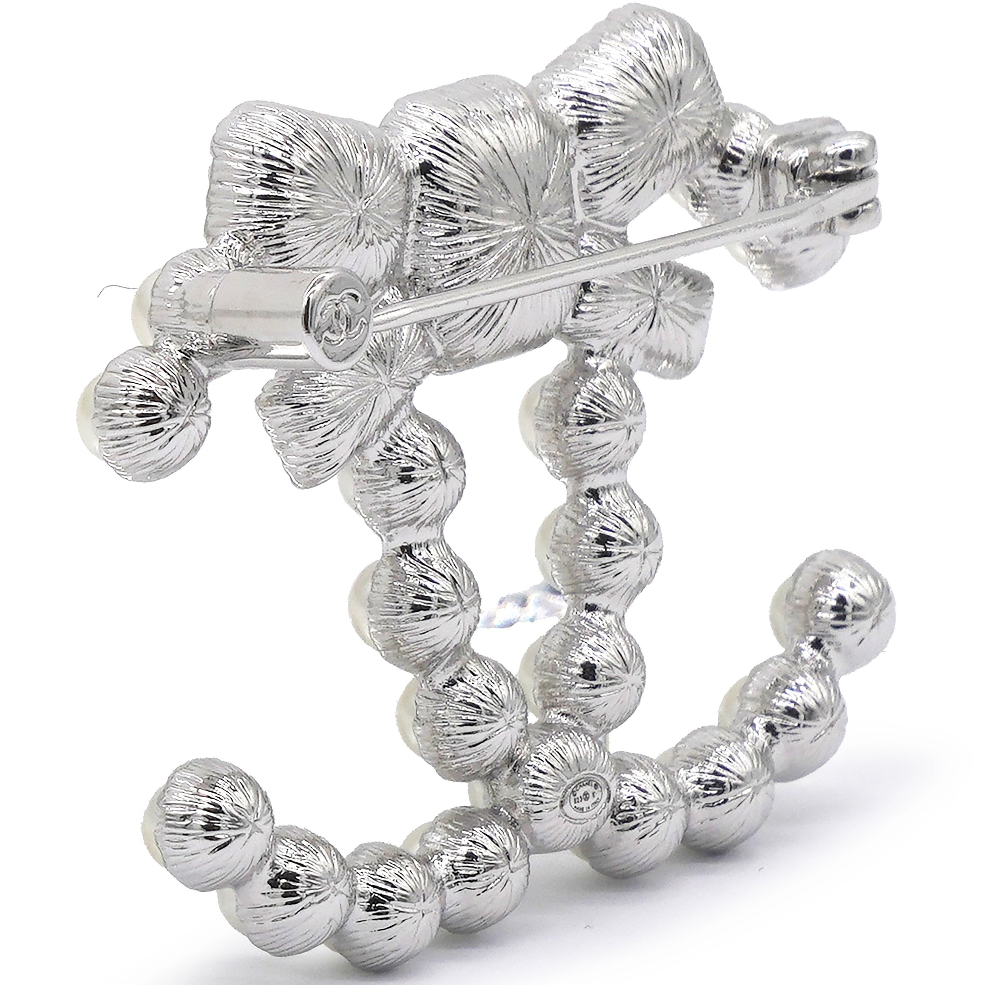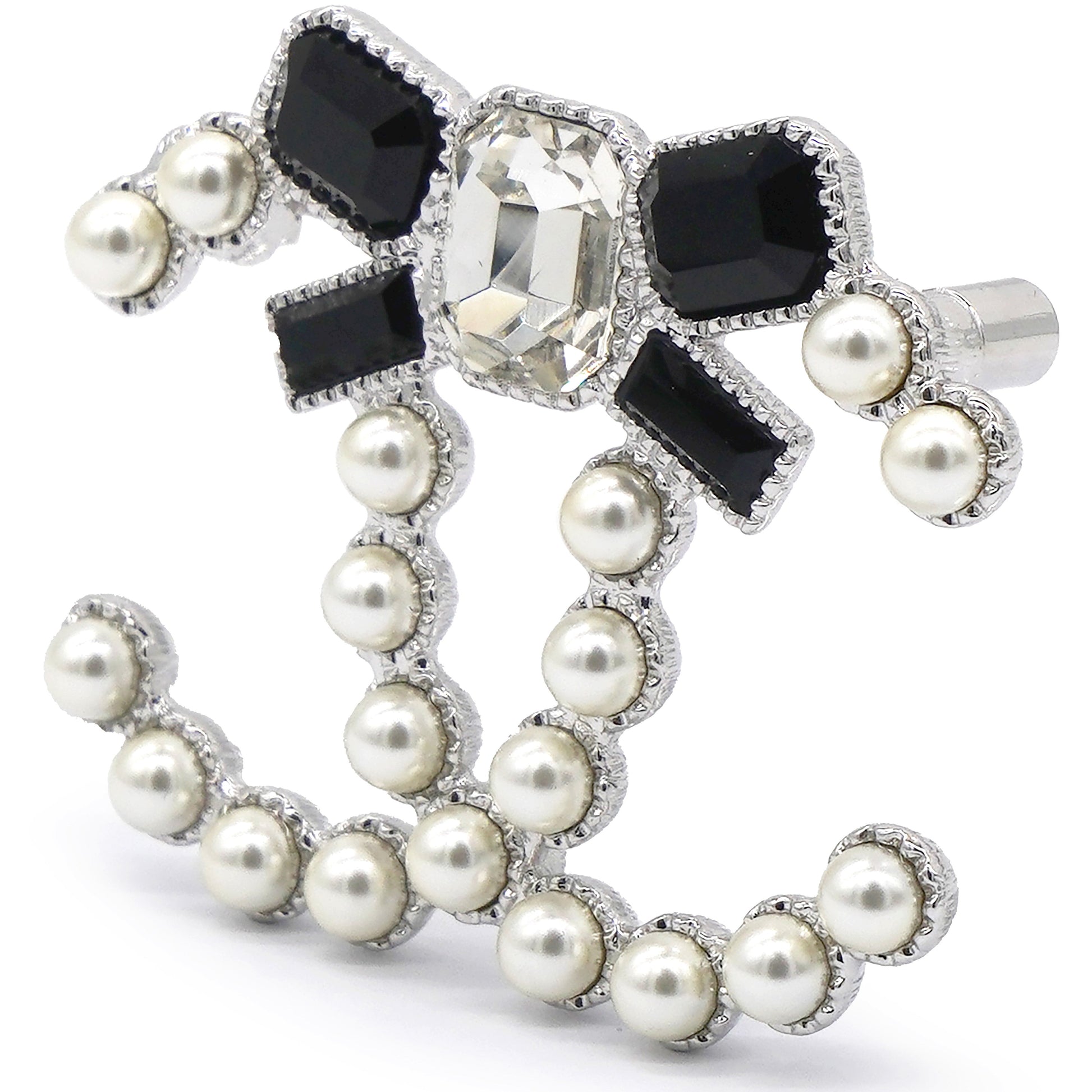 Chanel Pearl Crystal Bow CC Brooch Silver White Black