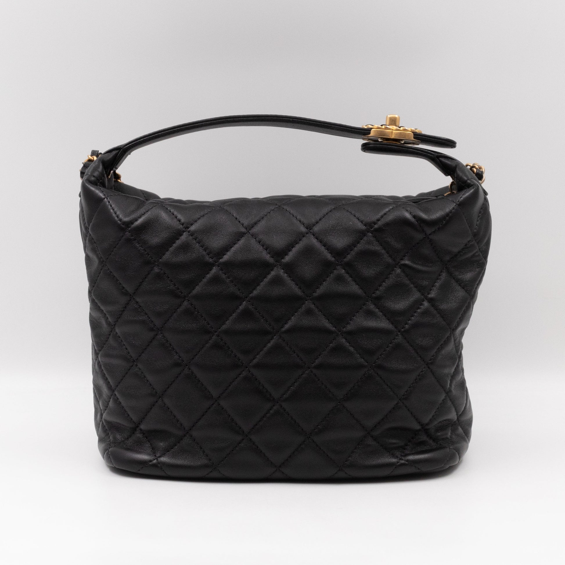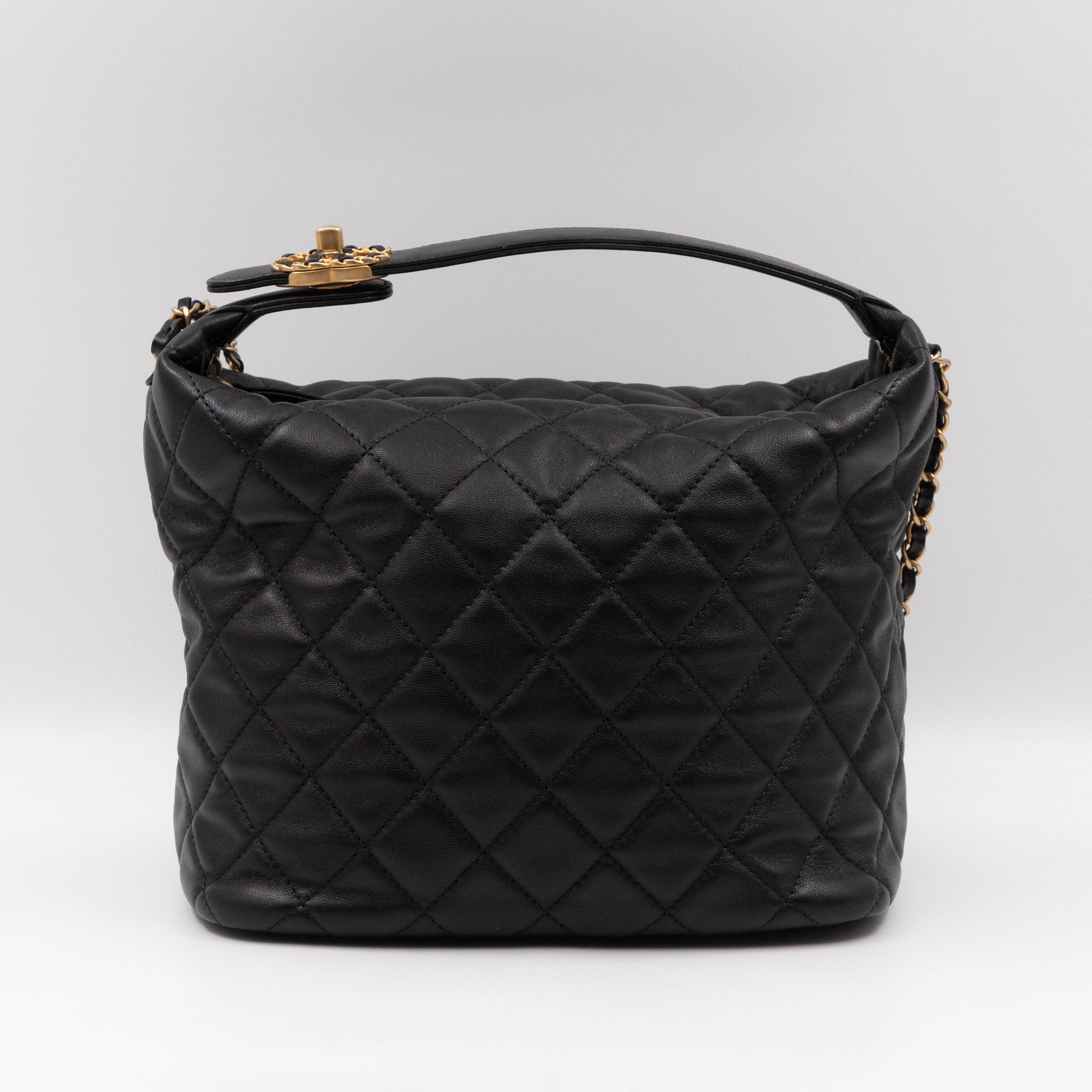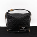 This is a Chanel Perfect Meeting hobo bag in large size. This stylish hobo bag is made in classic diamond quilted leather in black and gold-tone hardware. This bag features a gold chain leather threaded shoulder strap with a shoulder pad. The flat looping top handle has a top Chanel CC zipper pull that opens to a black interior.