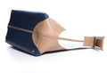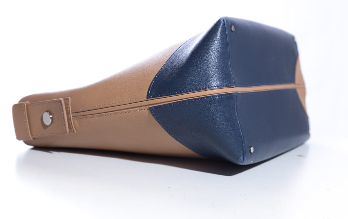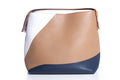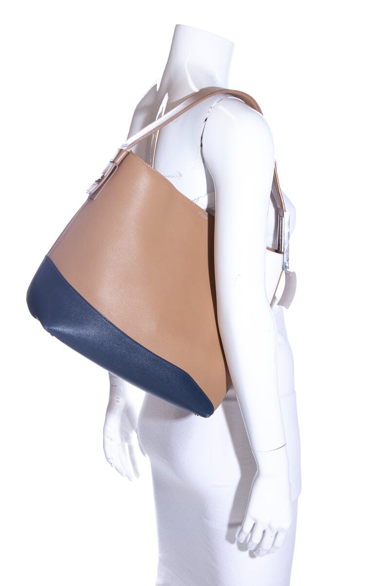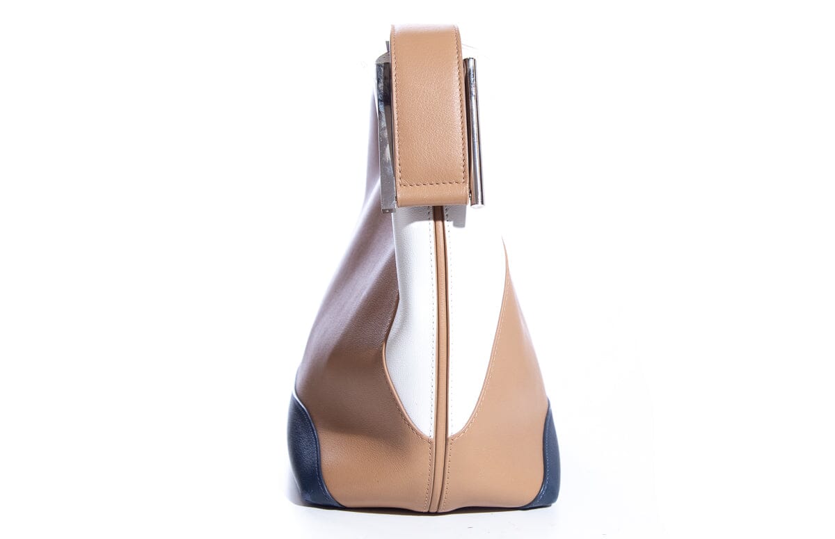 Perrin Paris brown, navy blue, and white leather shoulder bag with silver hardware. This item is in very good condition.
