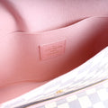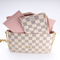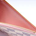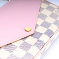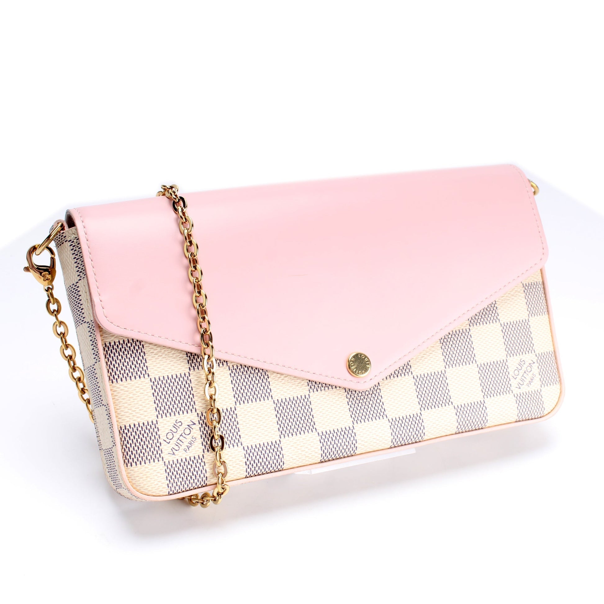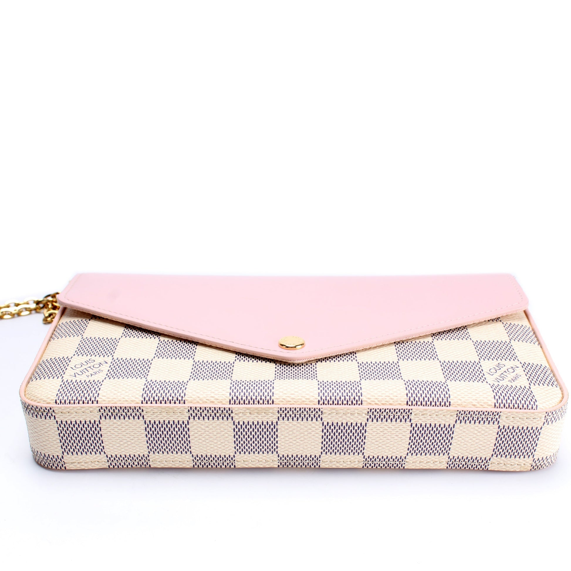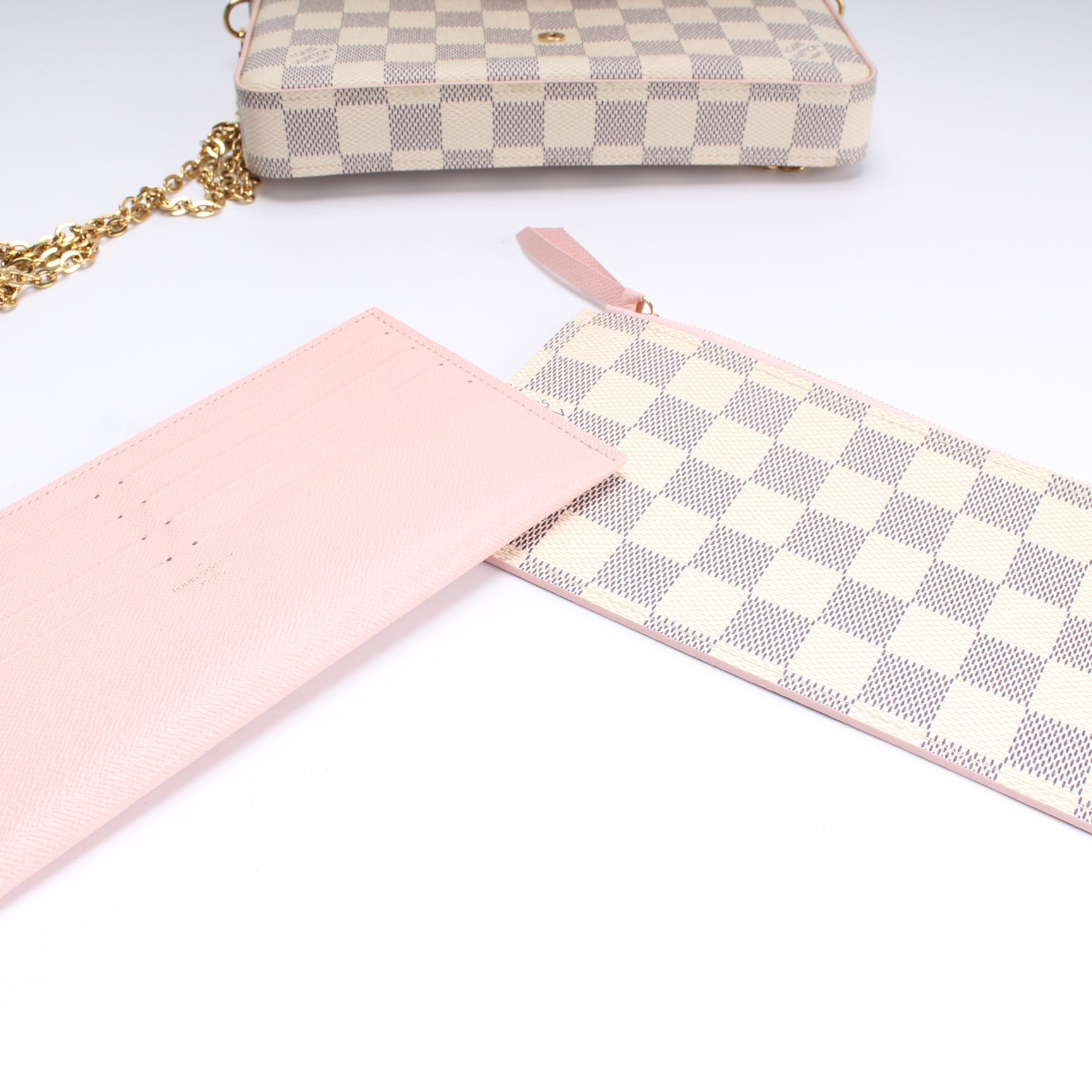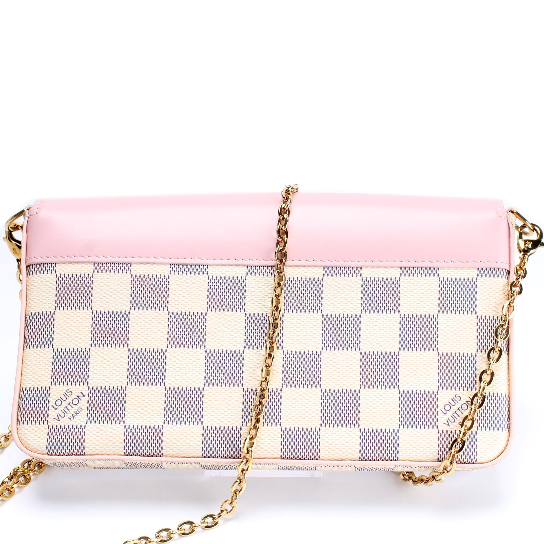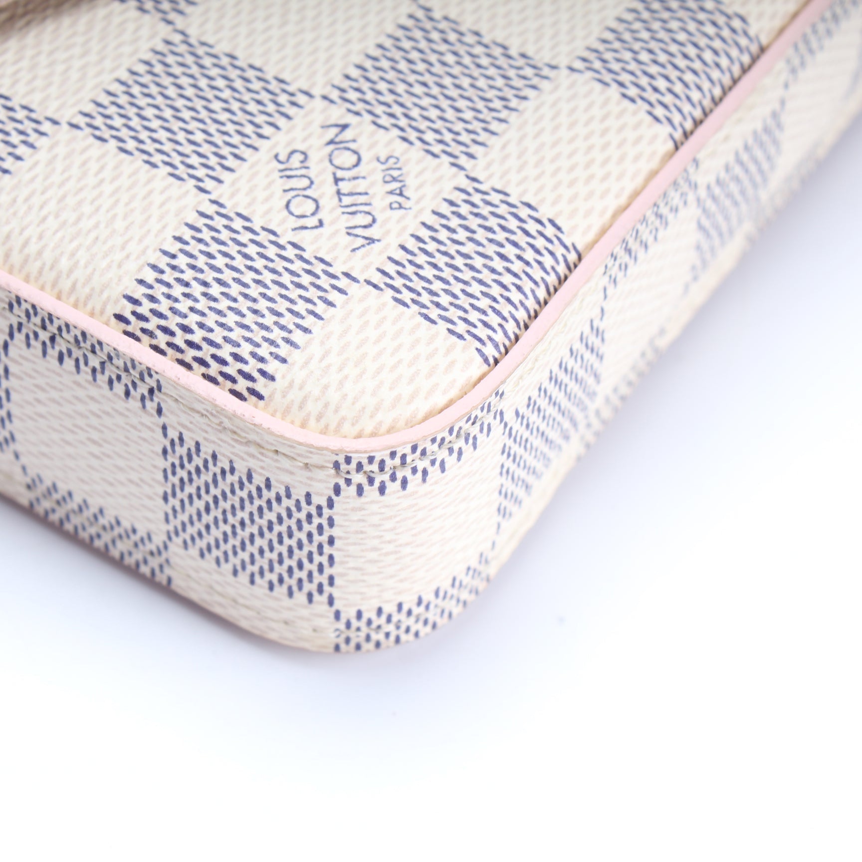 This Louis Vuitton Pochette Felicieis eye catching bag. The exterior is in the classic Louis Vuitton Damier Azur coated canvas.