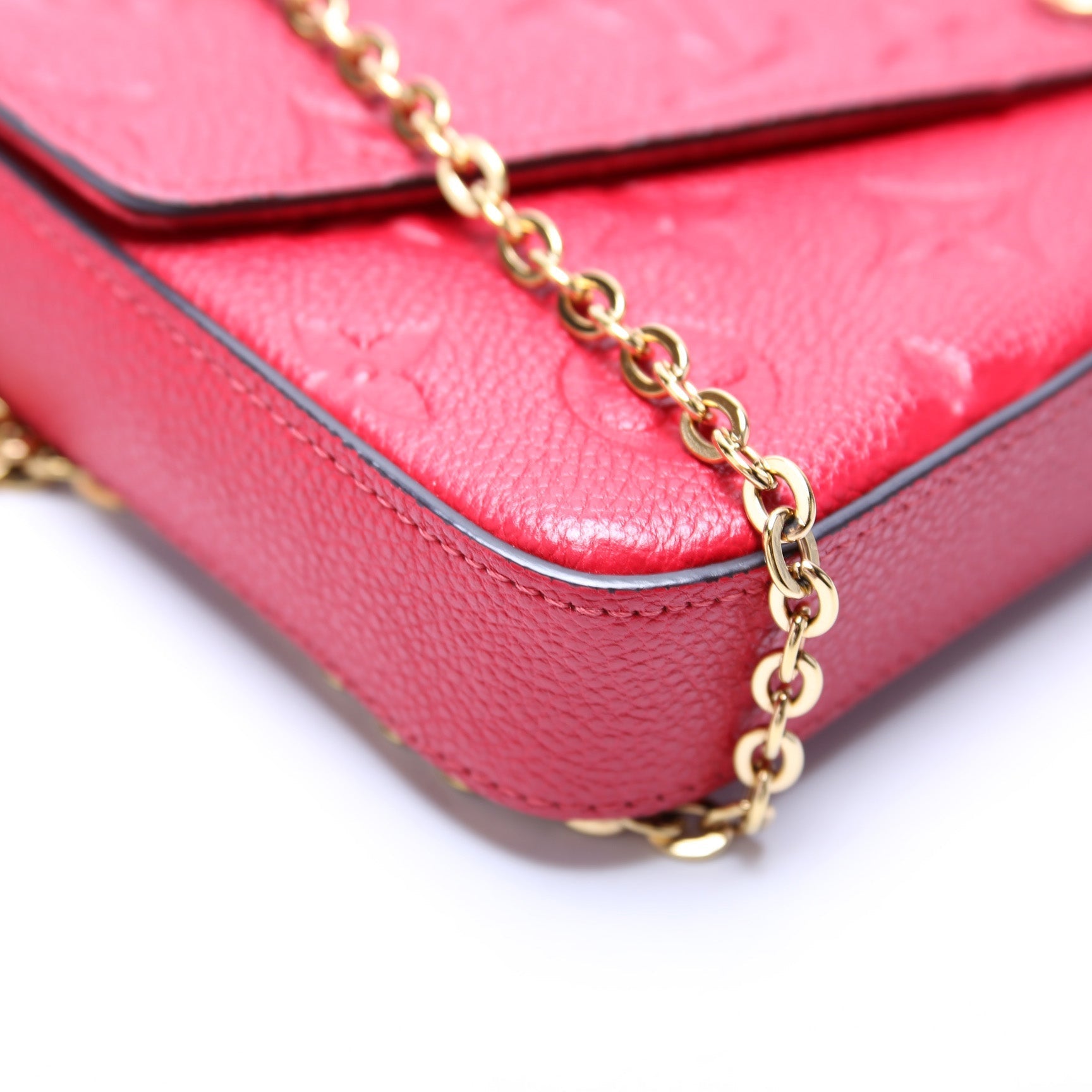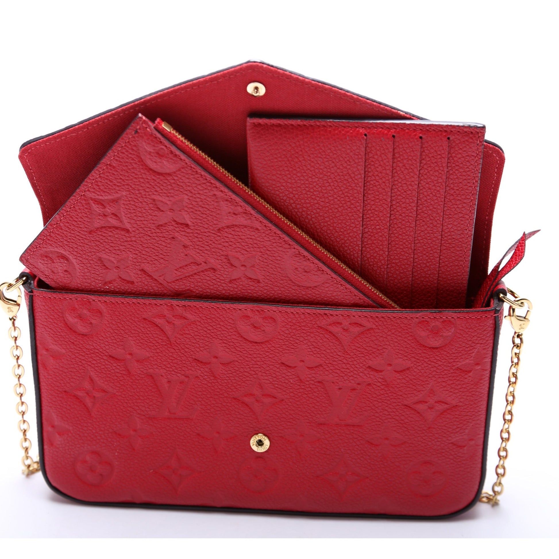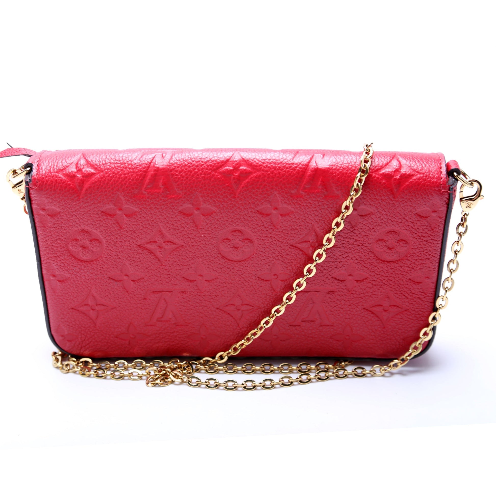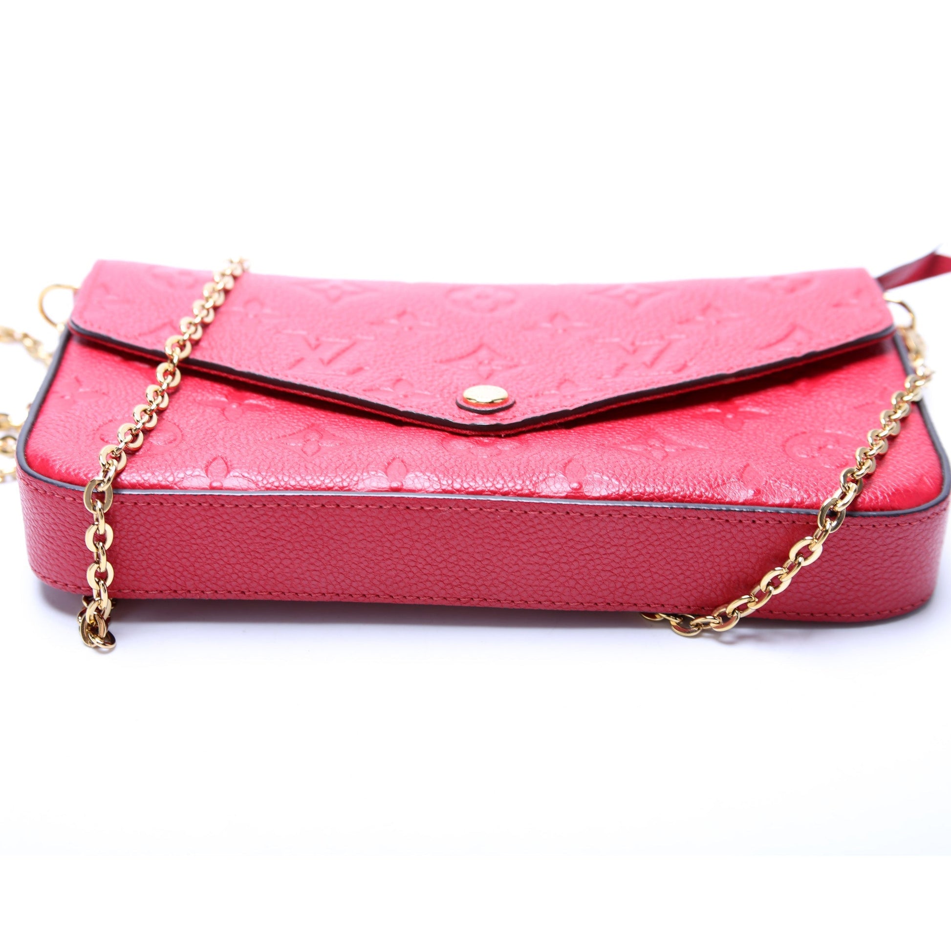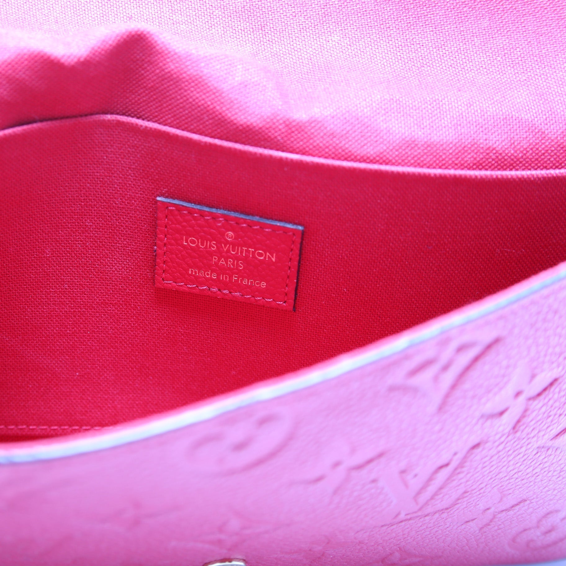 This Louis Vuitton Pochette Felicieis eye catching bag. The exterior is in the classic Louis Vuitton Empreinte leather.