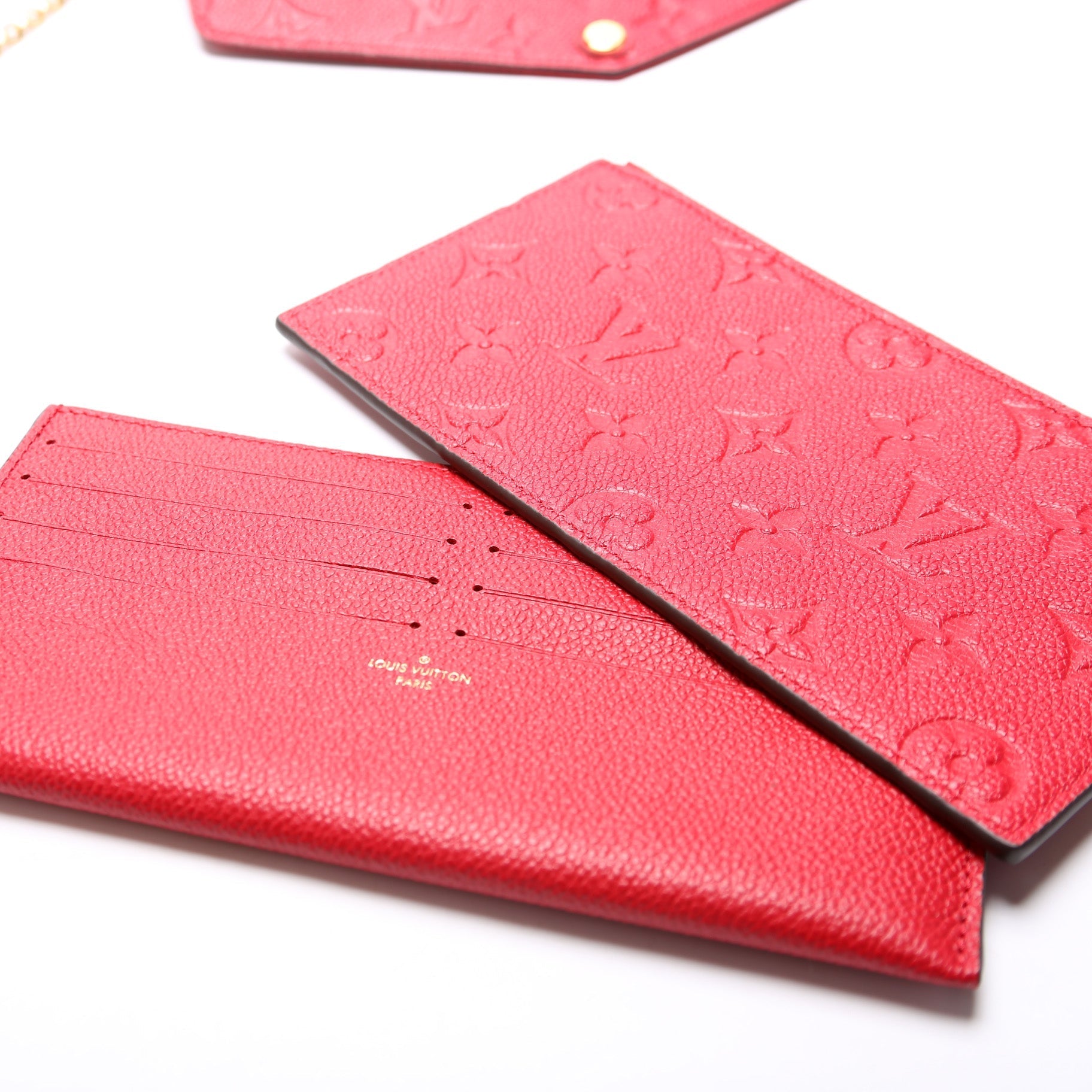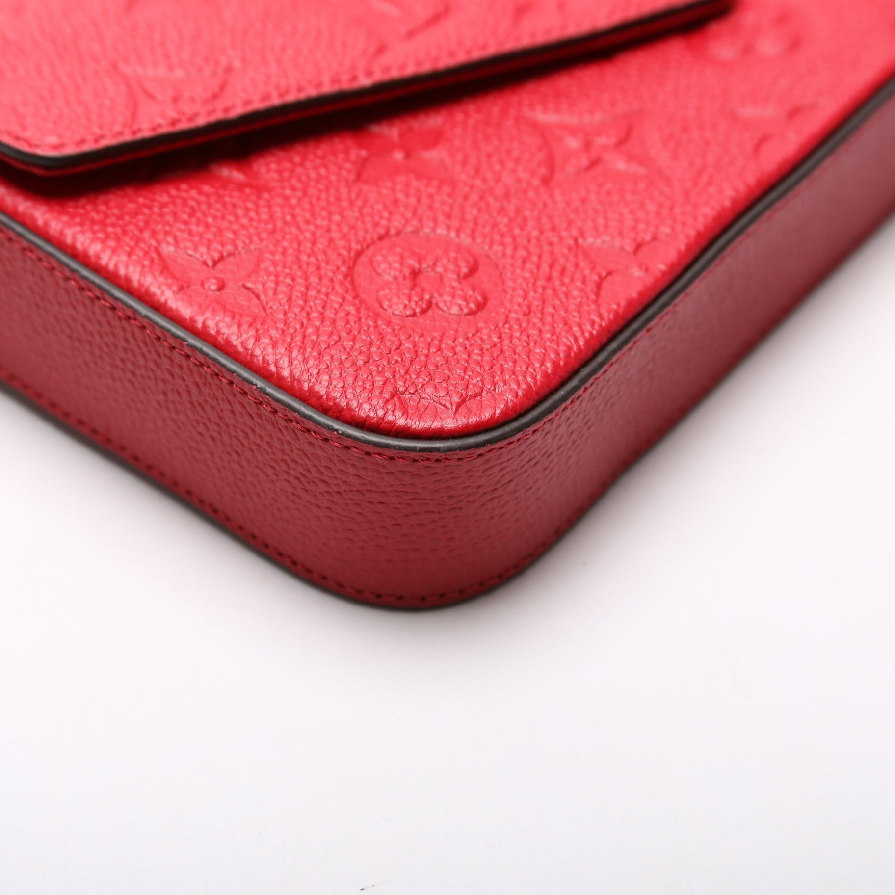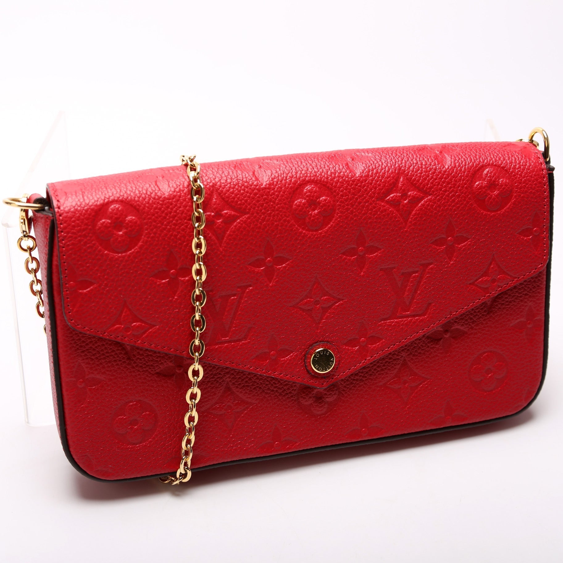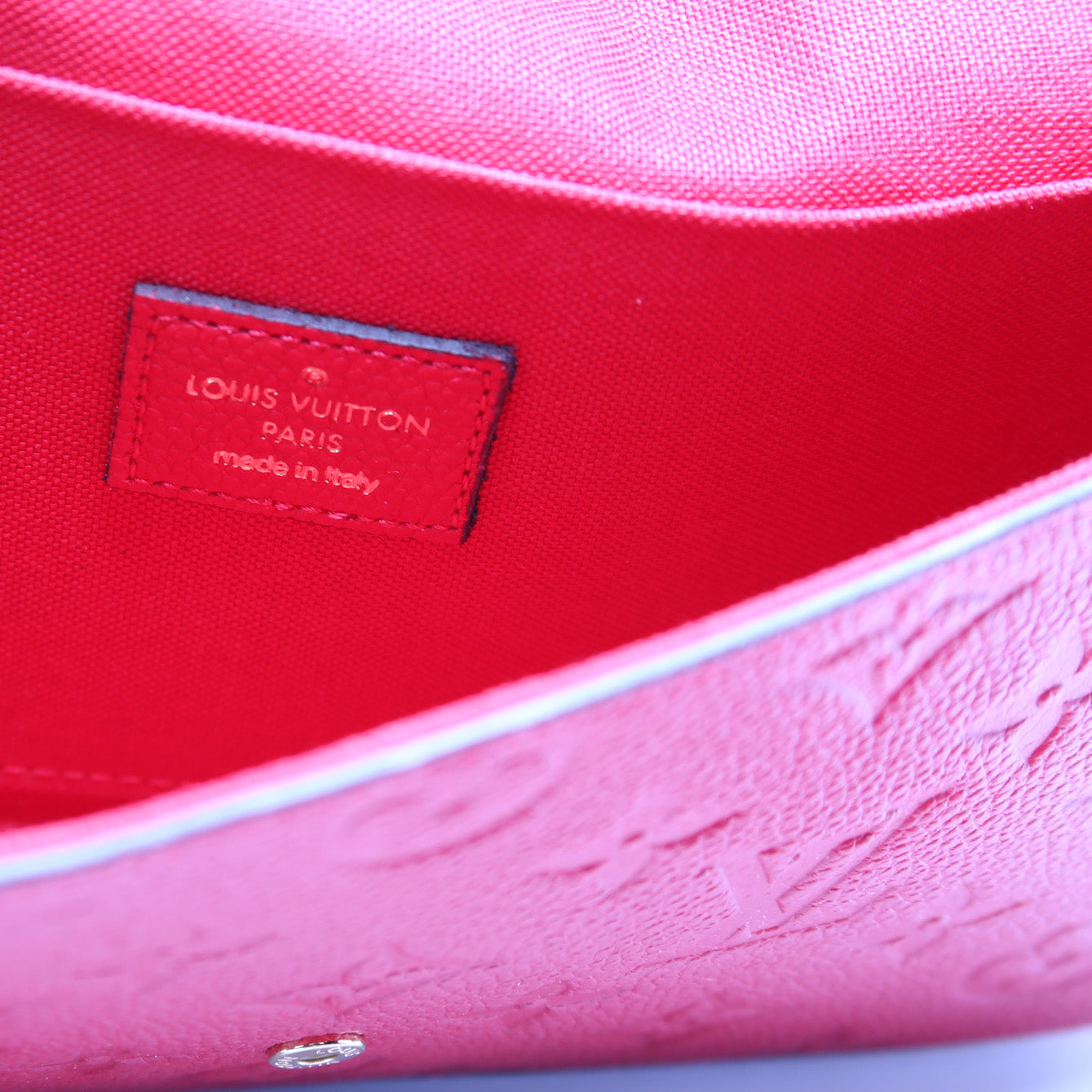 This Louis Vuitton Pochette Felicieis eye catching bag. The exterior is in the classic Louis Vuitton Empreinte leather.
