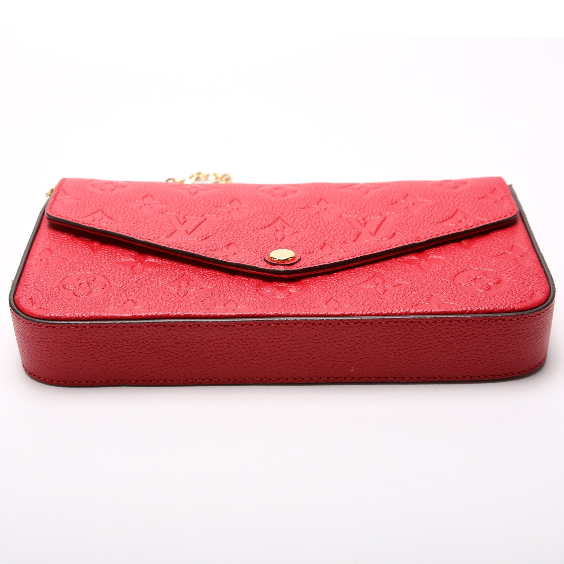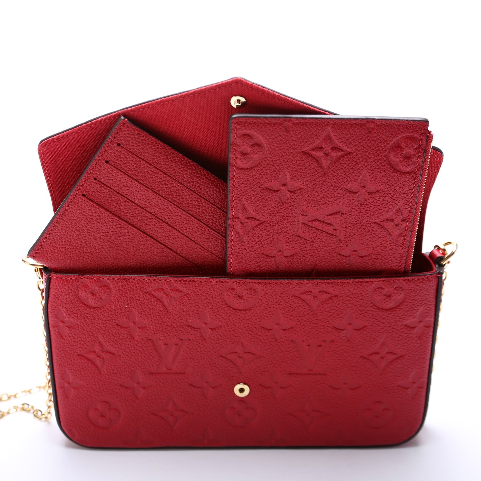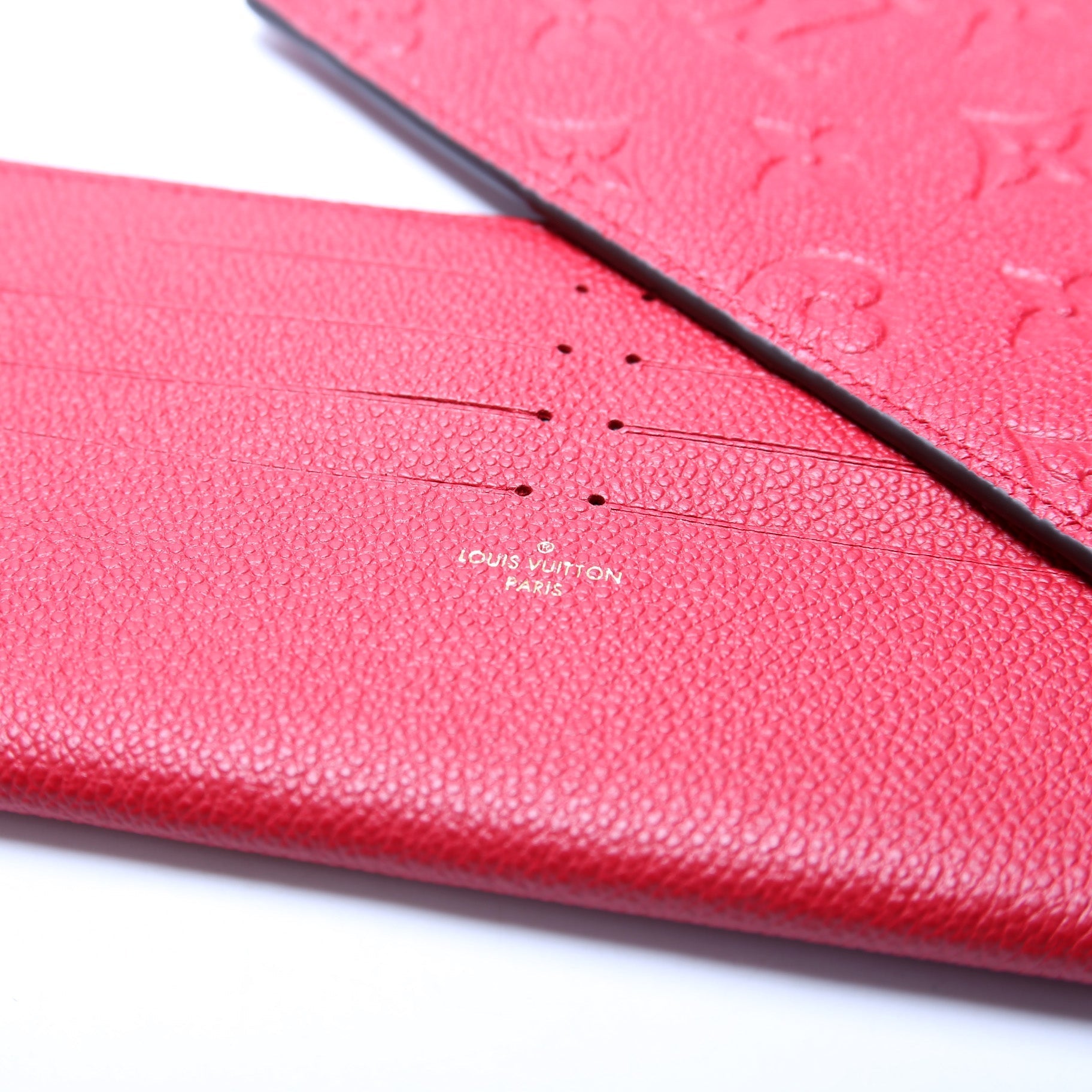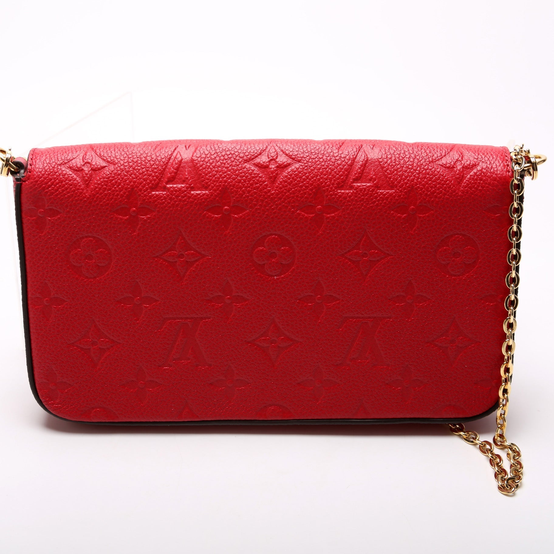 This Louis Vuitton Pochette Felicieis eye catching bag. The exterior is in the classic Louis Vuitton Empreinte leather.